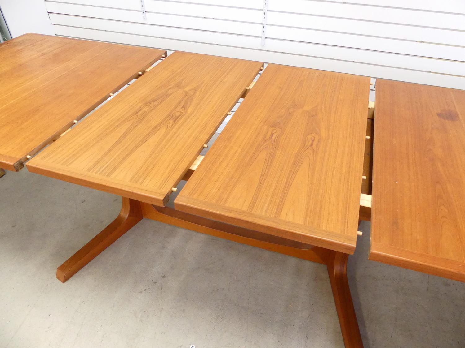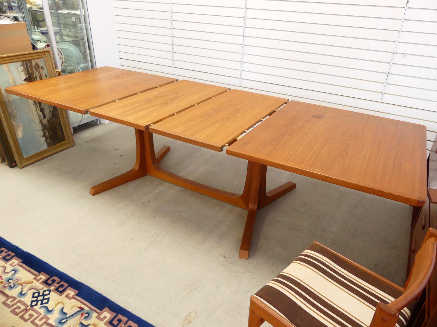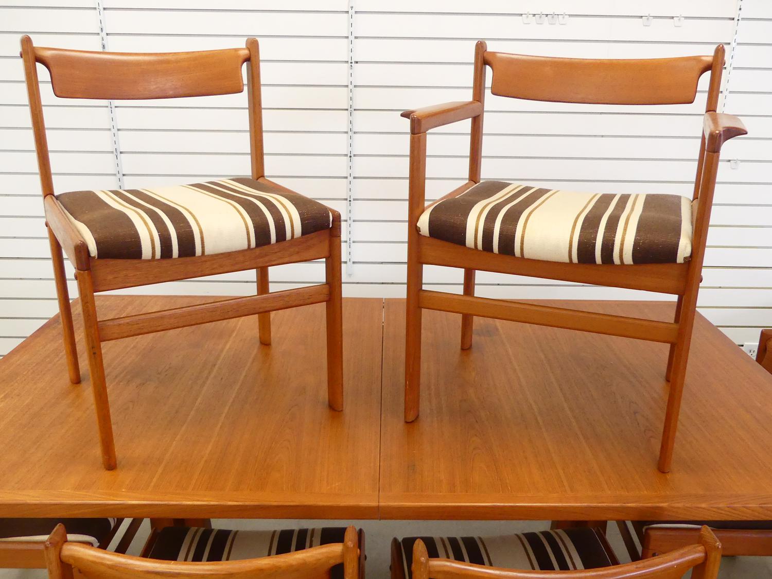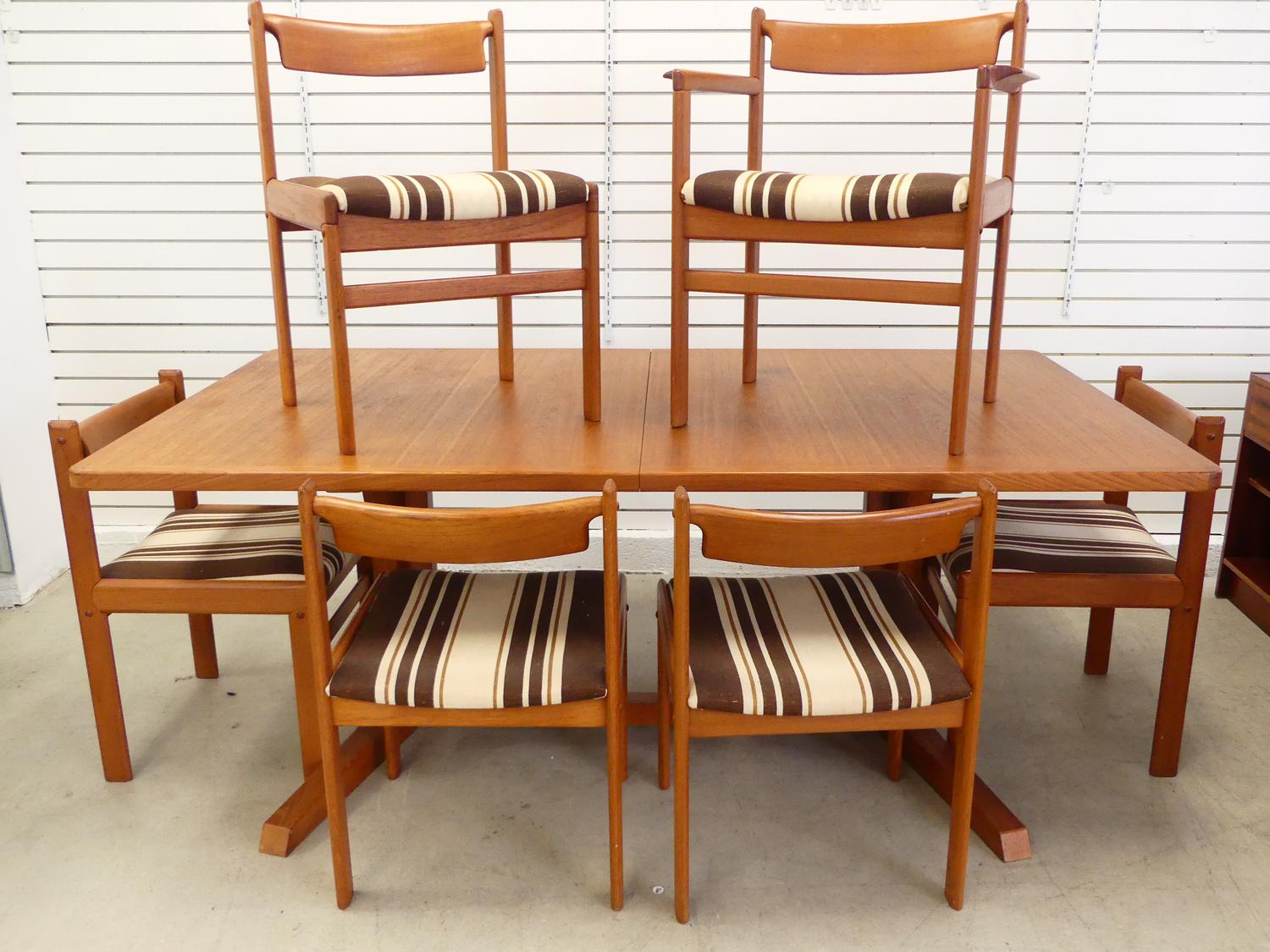 teak extending dining table with two leaves and six matching chairs including one armchair
