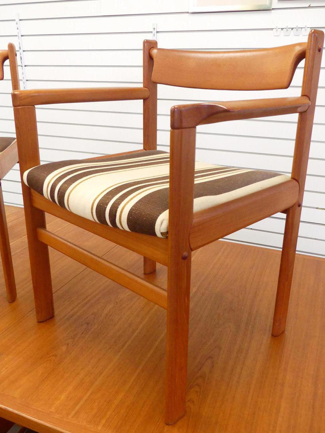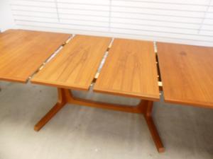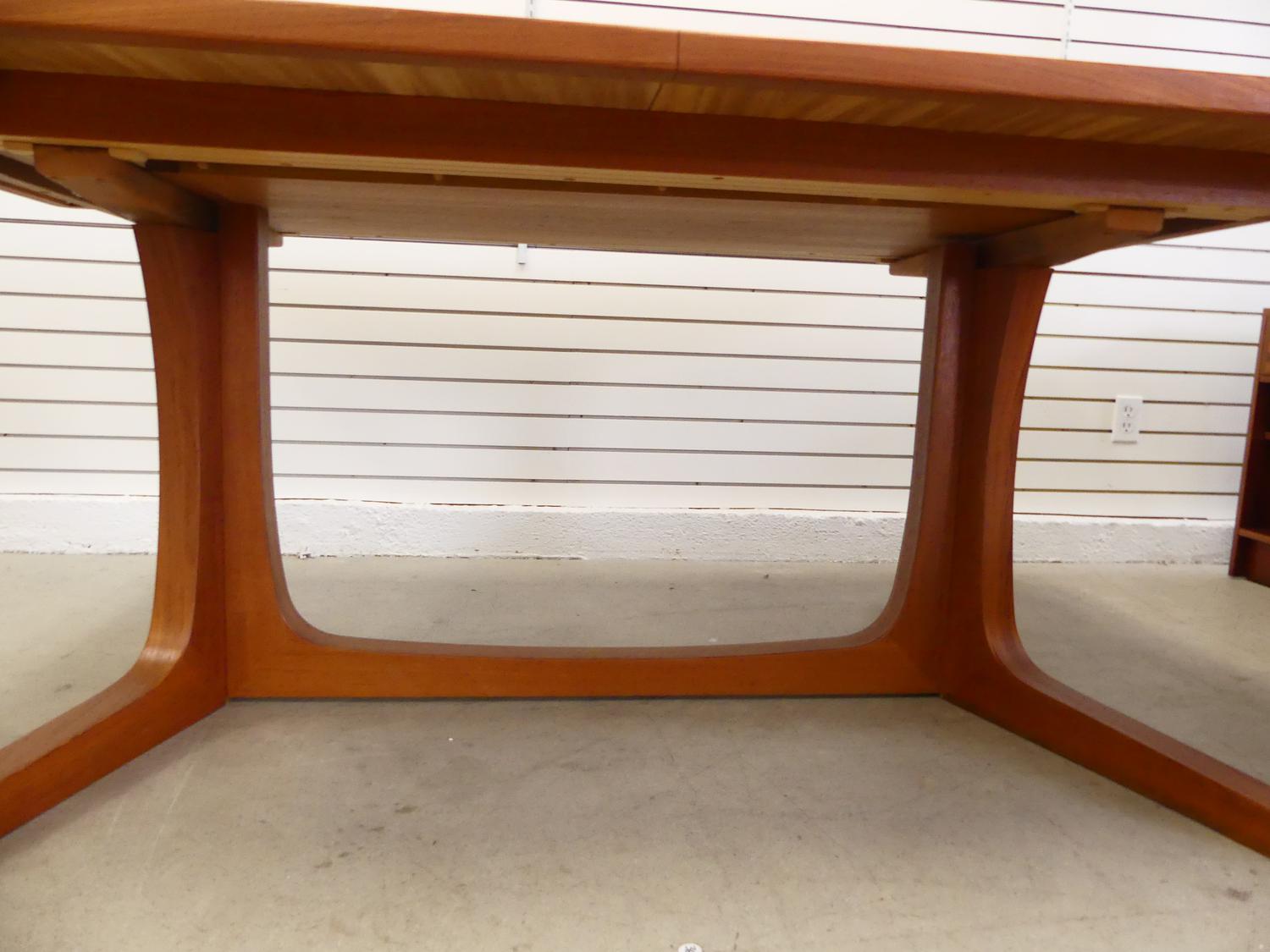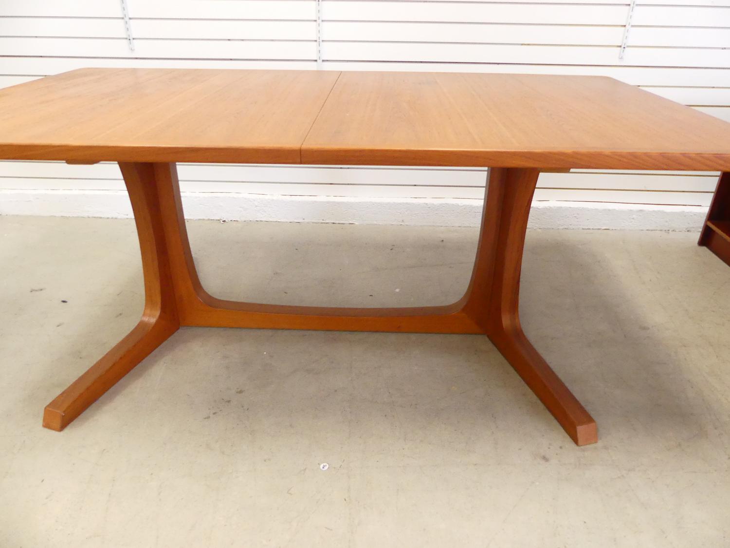teak extending dining table with two leaves and six matching chairs including one armchair