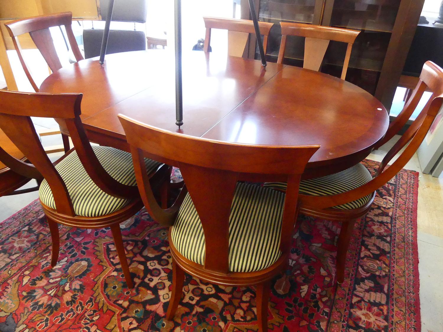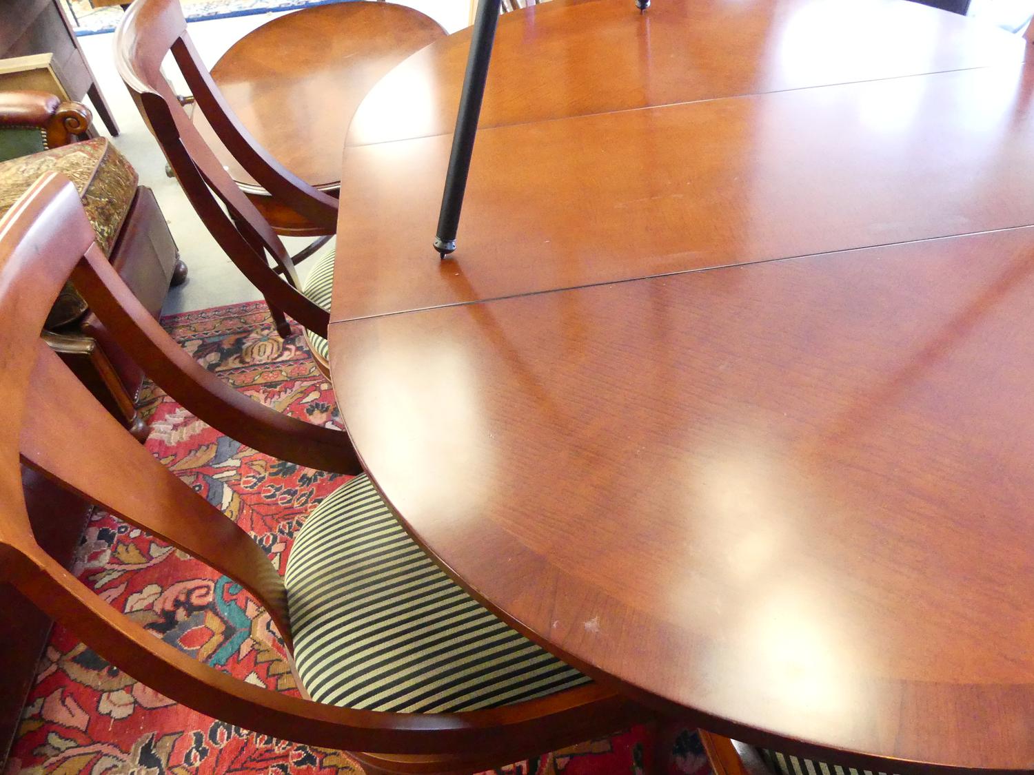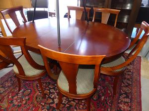 mahogany finish extending pedestal dining table with extension leaf and six matching chairs, purchased at jordans interiors