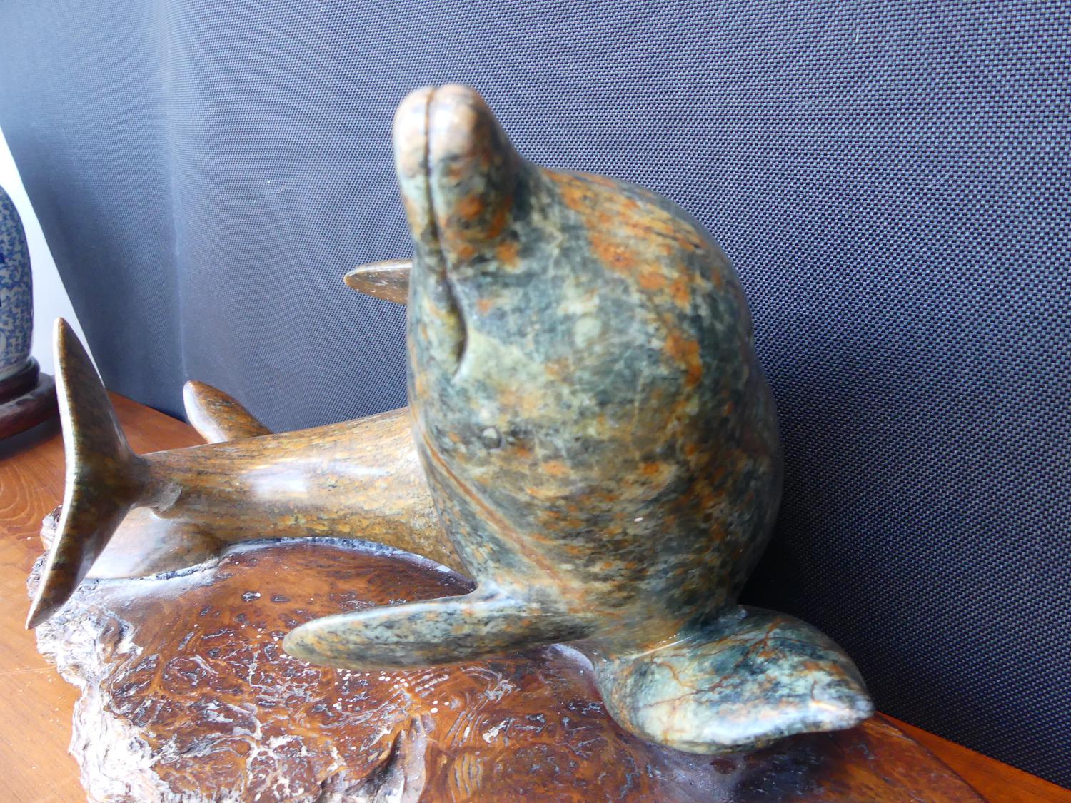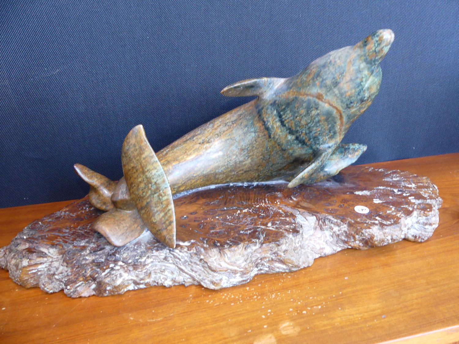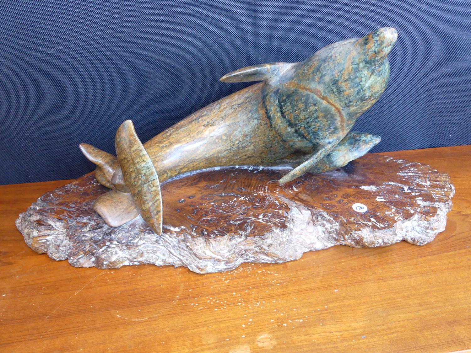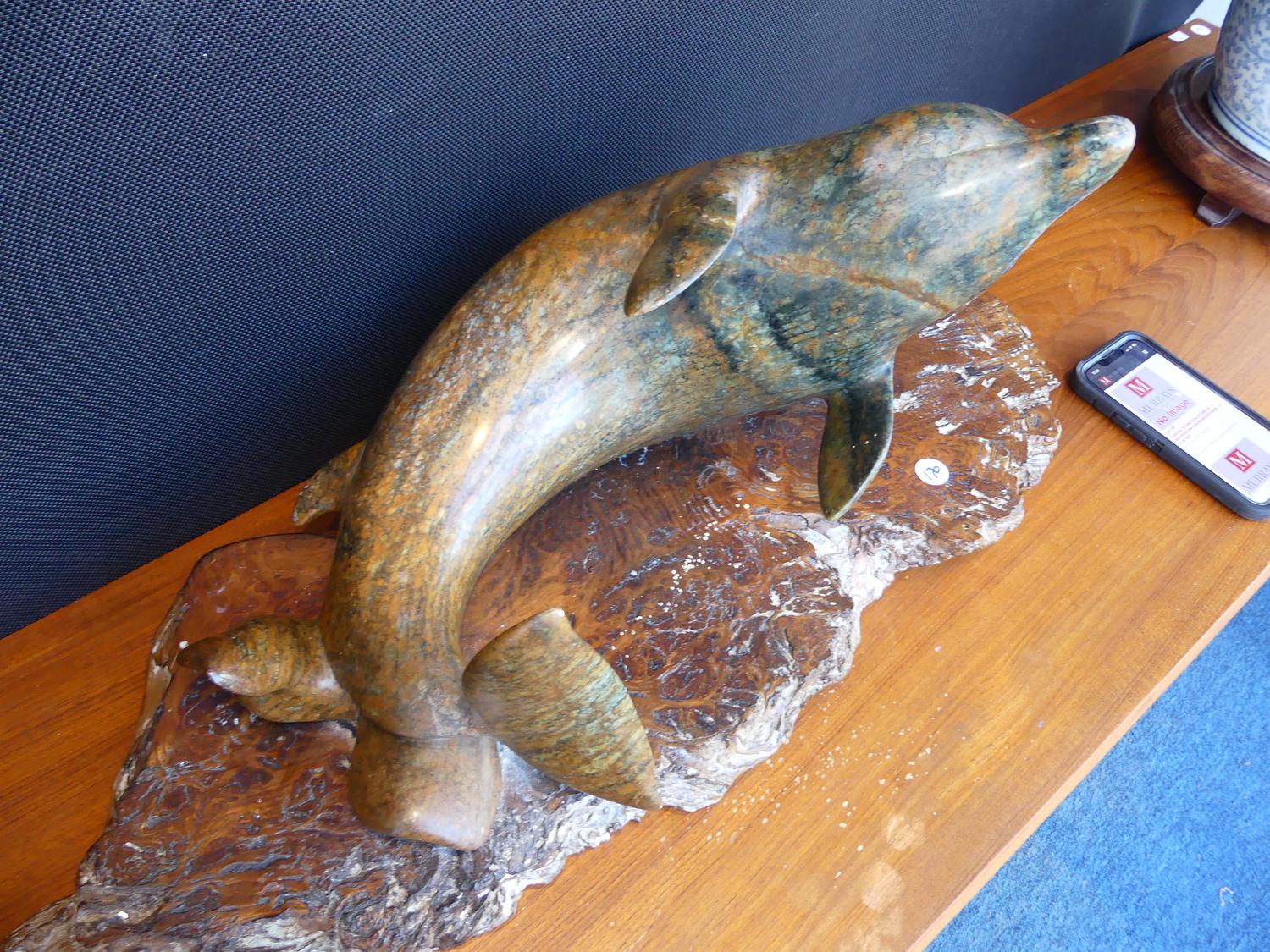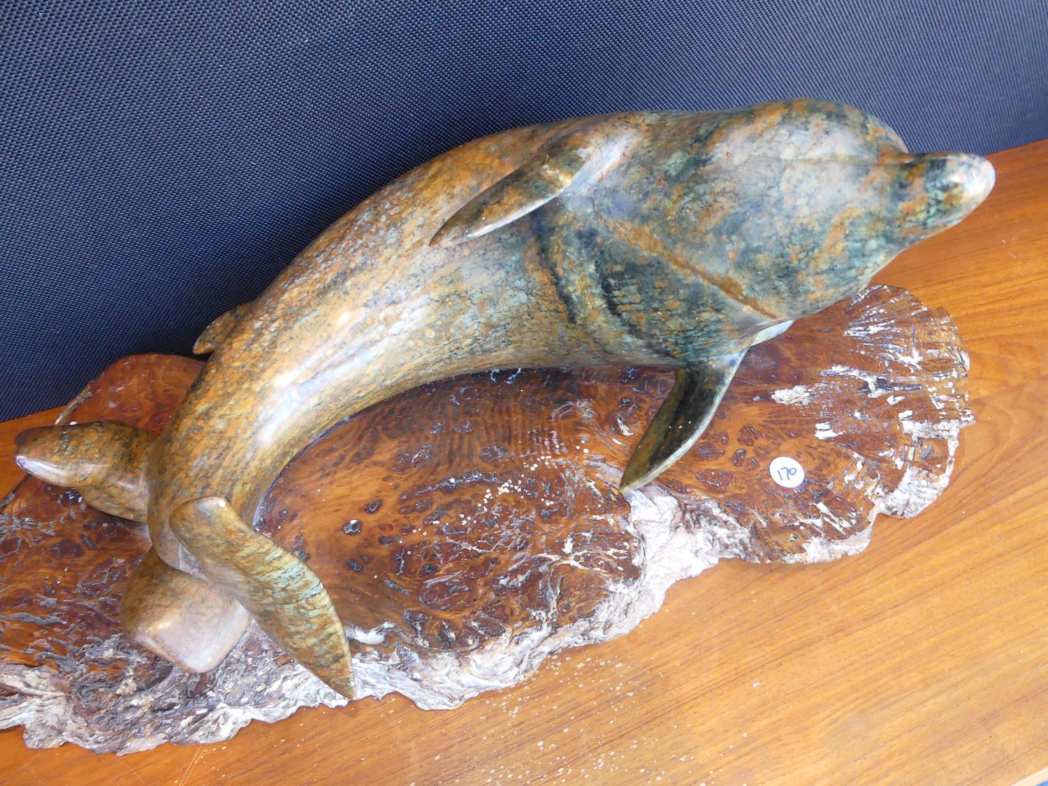 carved stone sculpture of a dolphin on a burlwood base, 12" x 26"x12"