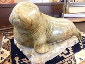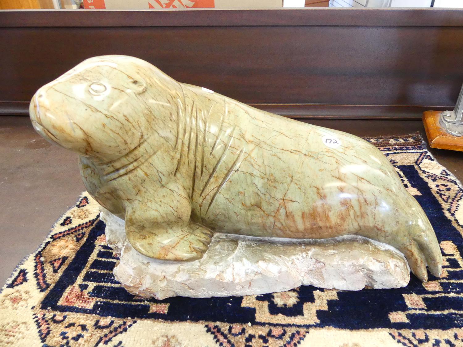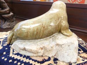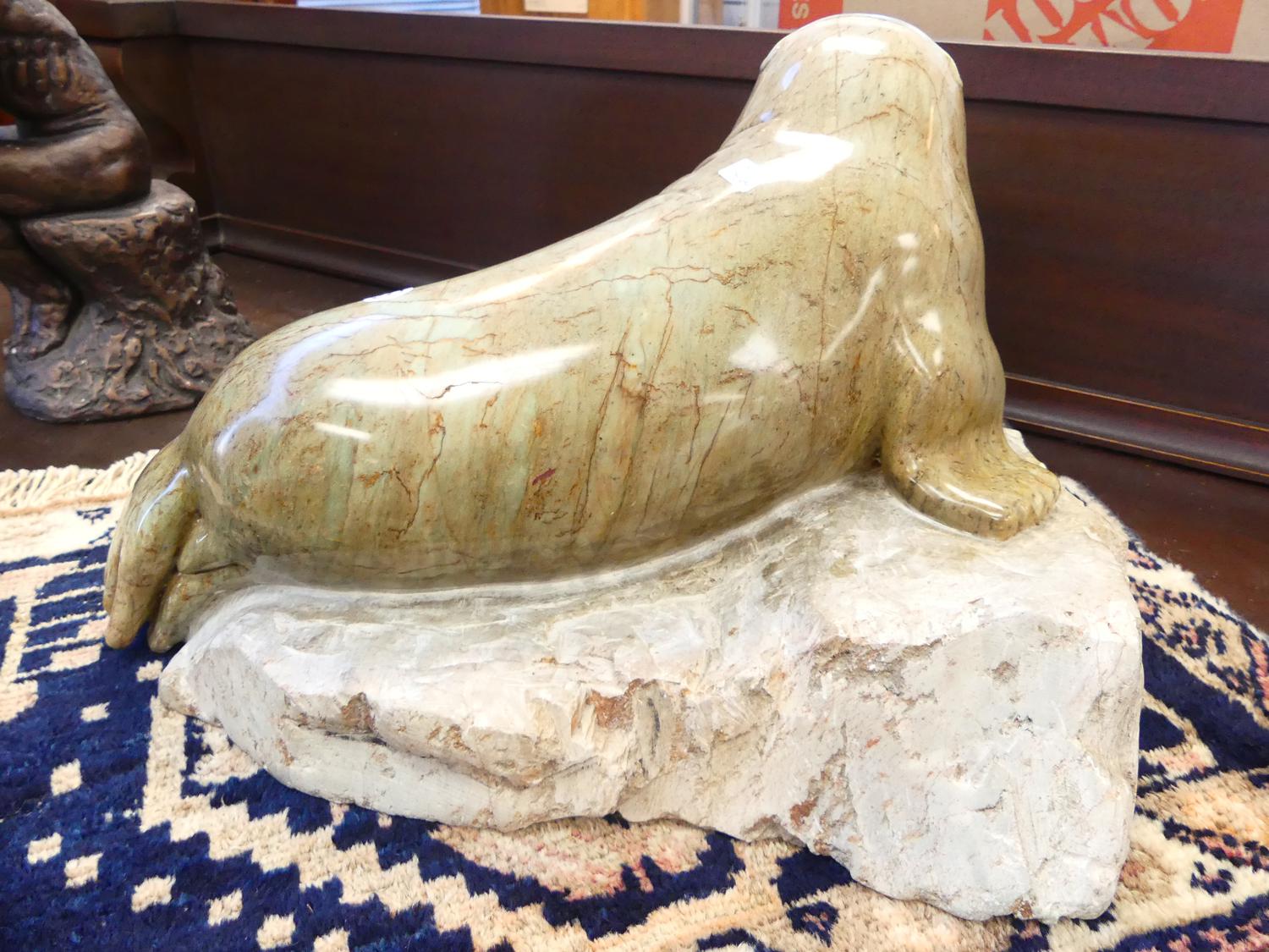 carved stone sculpture of a seal, 10" x 16" x 12"
