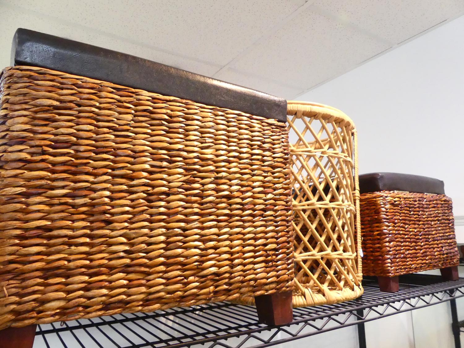 two ottoman storage boxes and a wicker bin