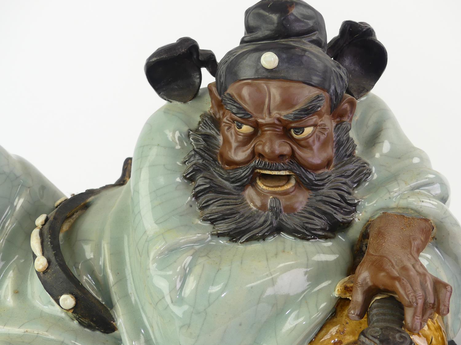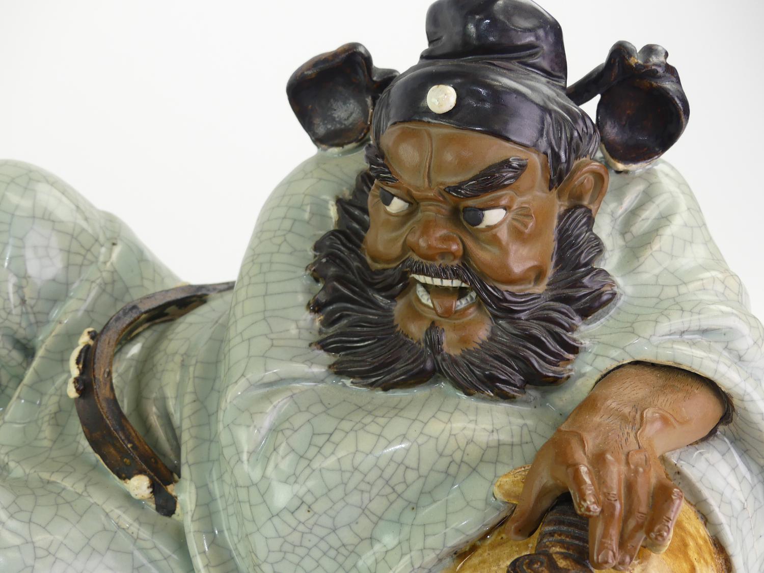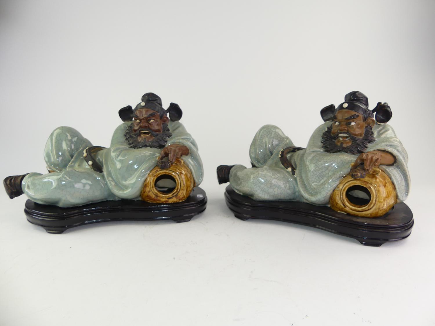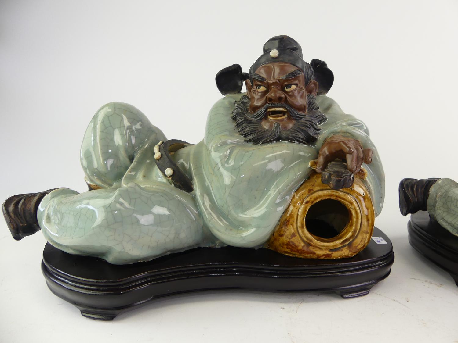 pair of shiwan reclining figures on stands, length 19"