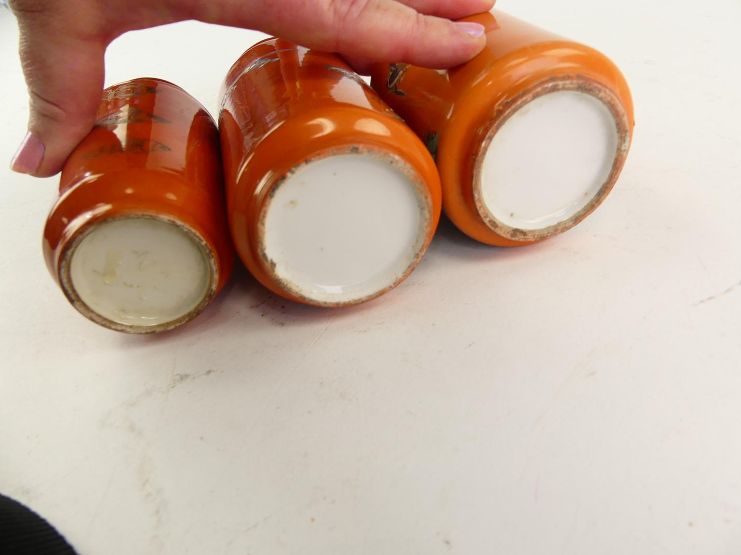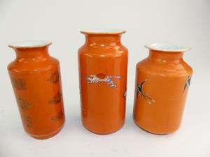 three chinese coral ground painted vases, ht. 5 1/2" and smaller
