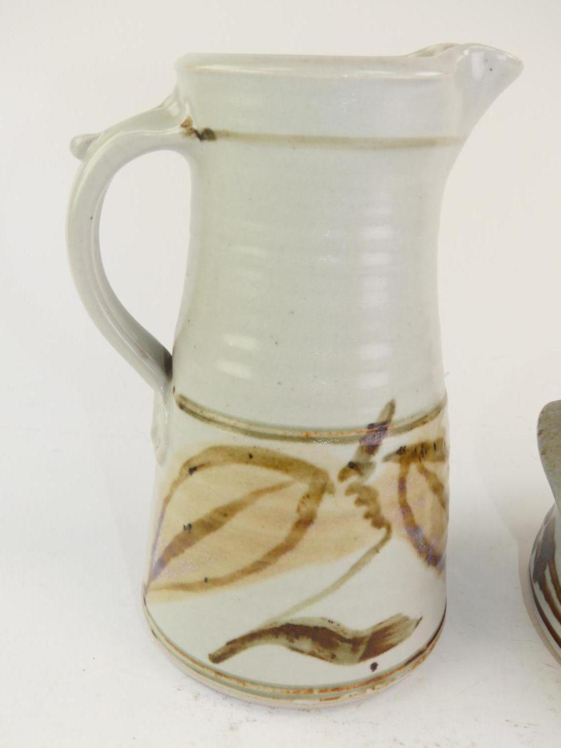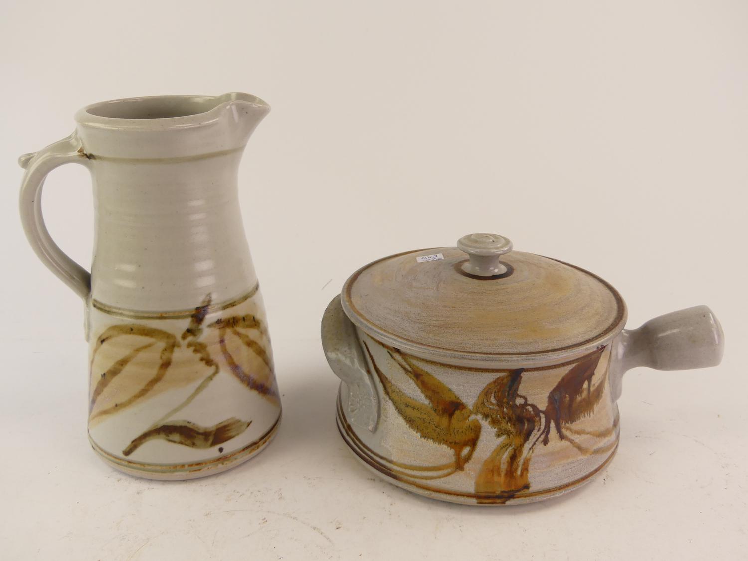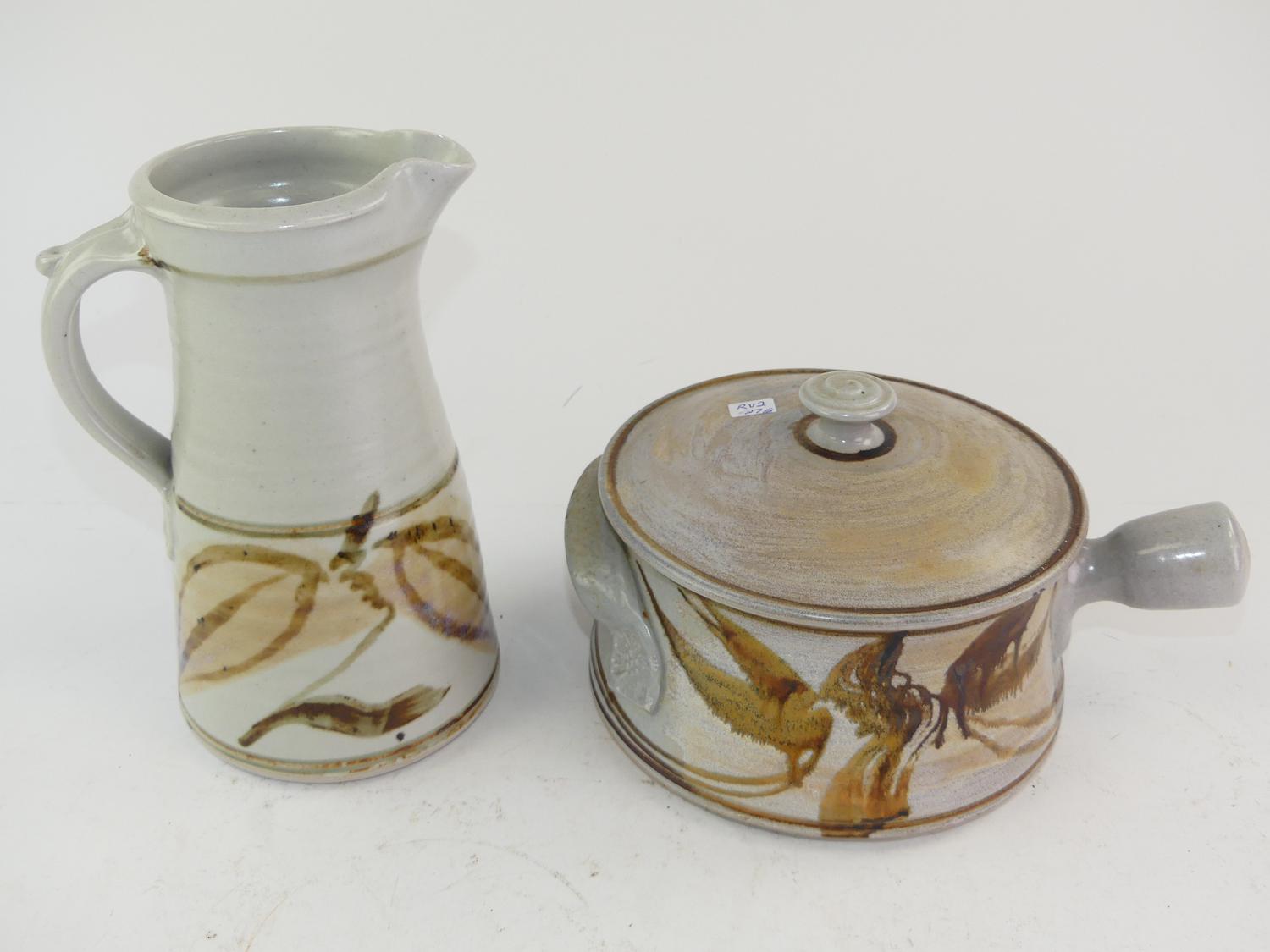 robin hopper art pottery pitcher and covered pot, ht. 9 1/2"