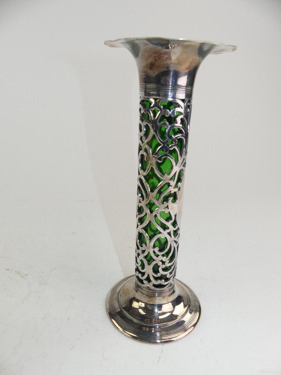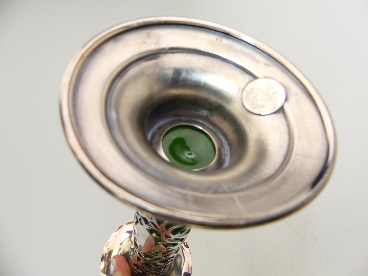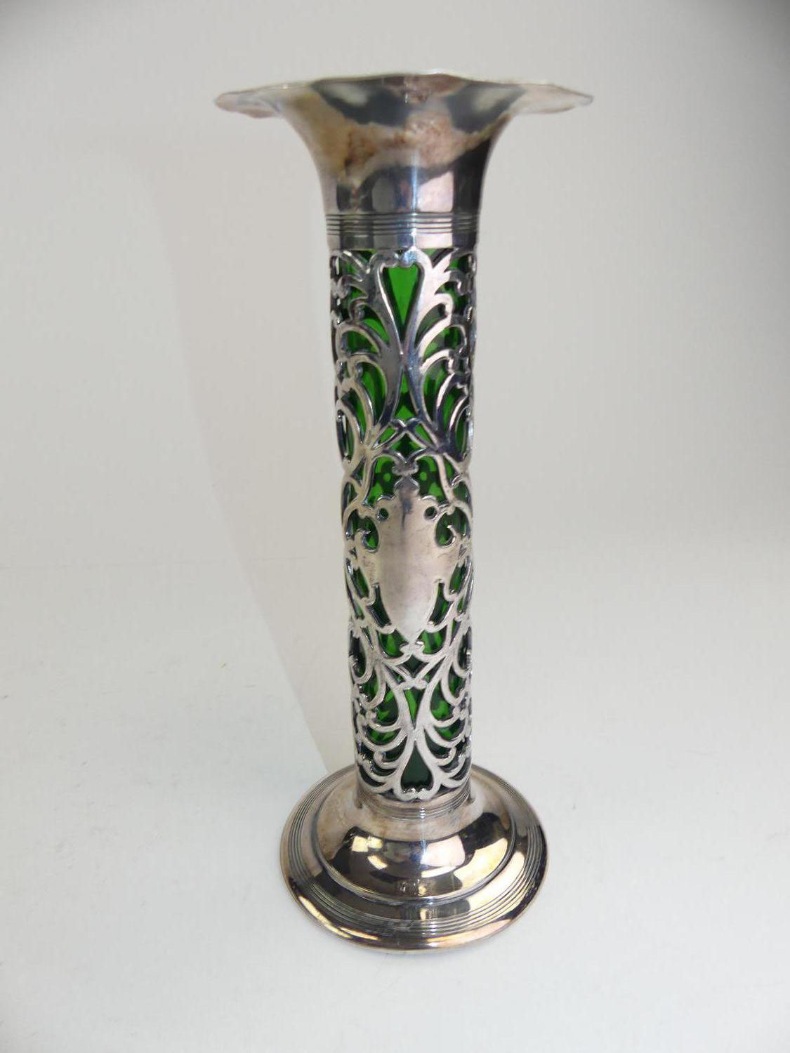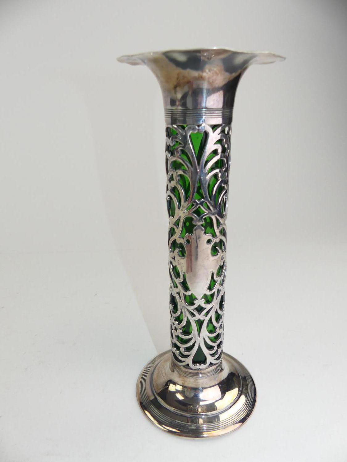 art nouveau silver plate green glass lined vase