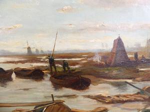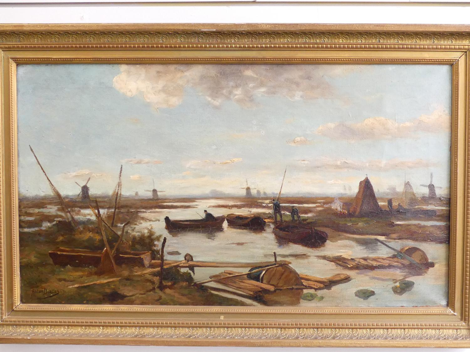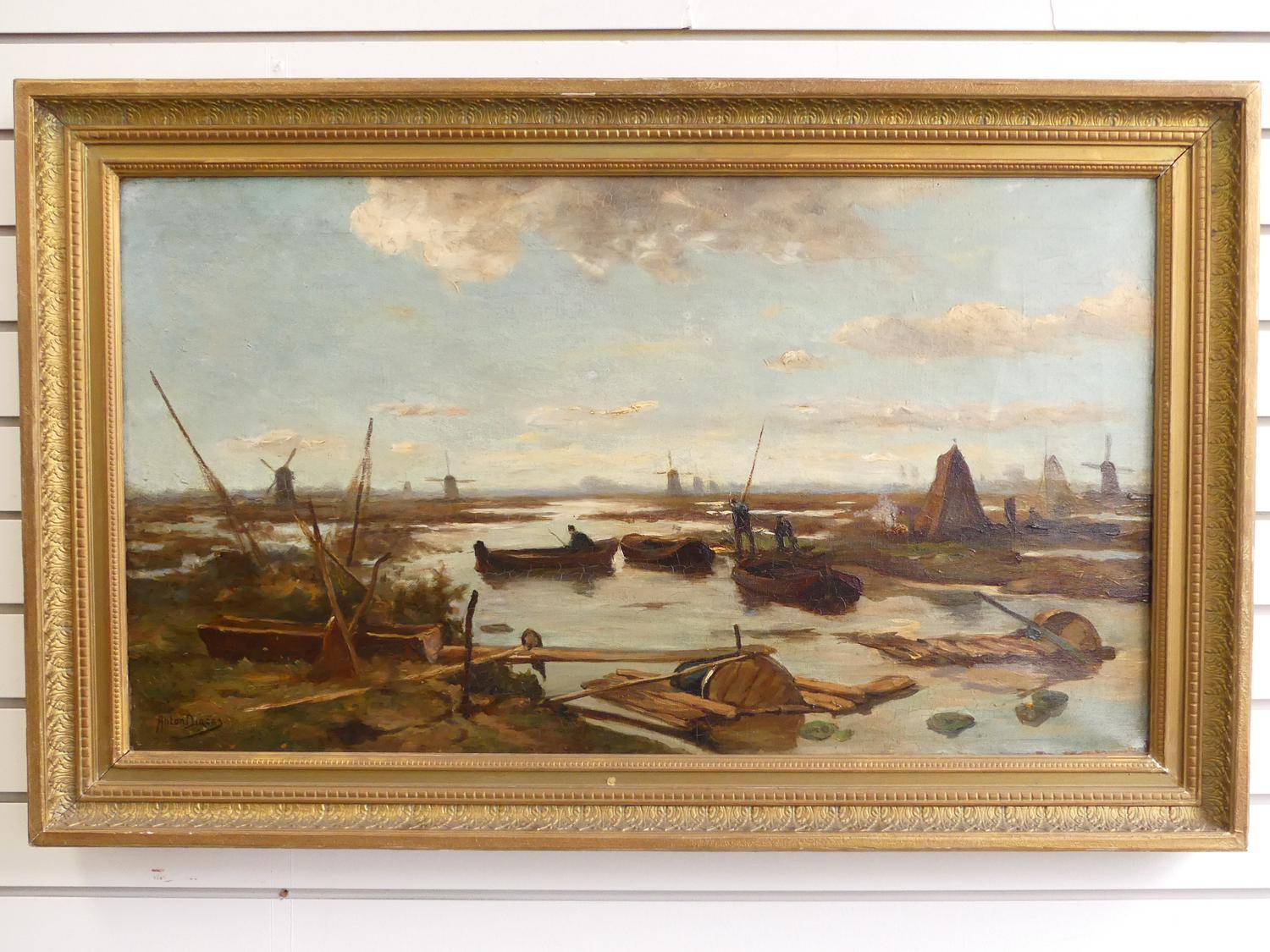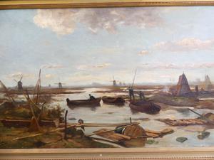 antonius bernardus dirckx(1878-1927), oil on board, 18" x 52", "dutch canal scene"
