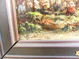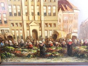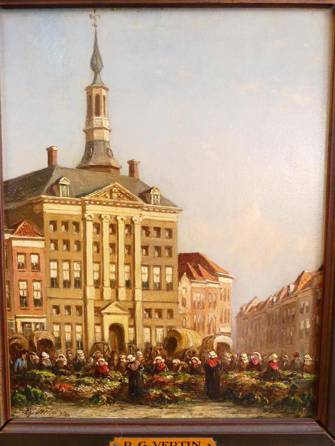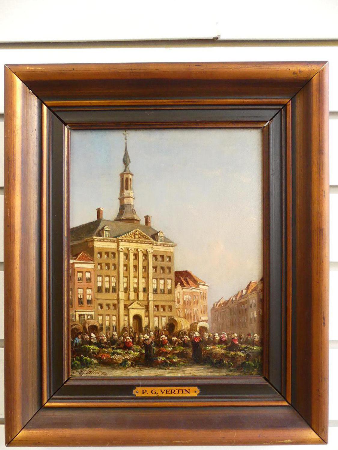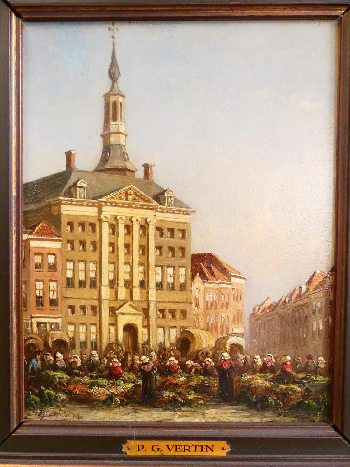 petrus gerardus vertin (1819-1893), d. 1886. oil on panel 9 1/4"x 7 1/2", "market in bois le due, stadhuis, rotterdam, netherlands":