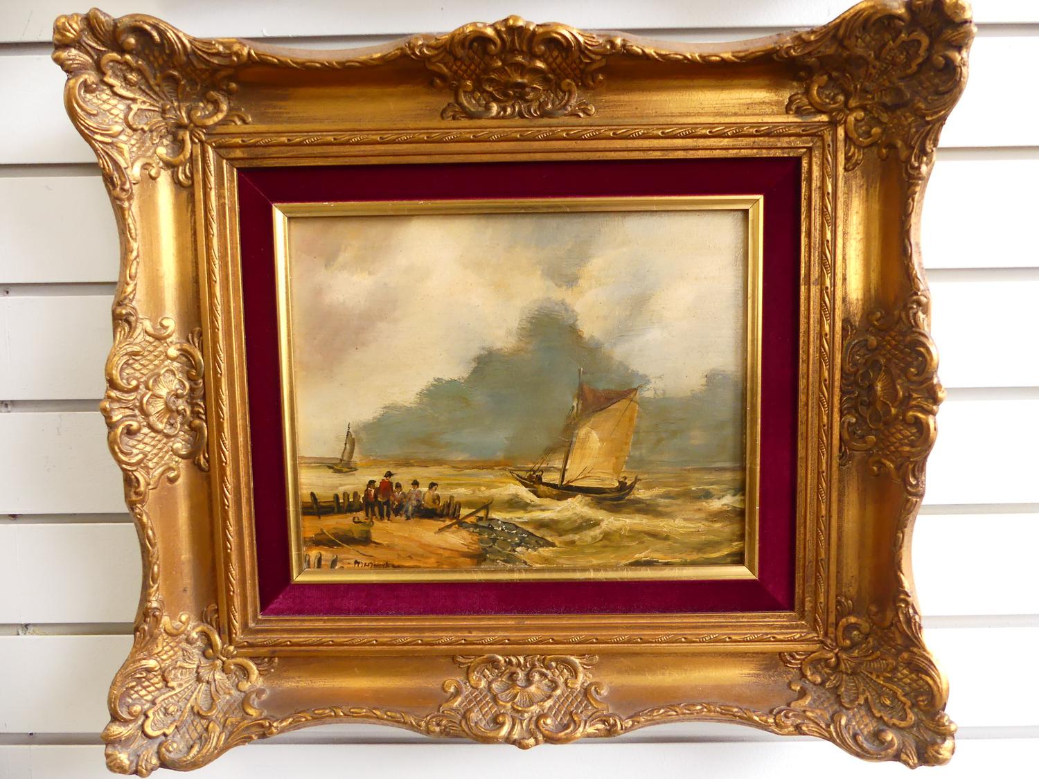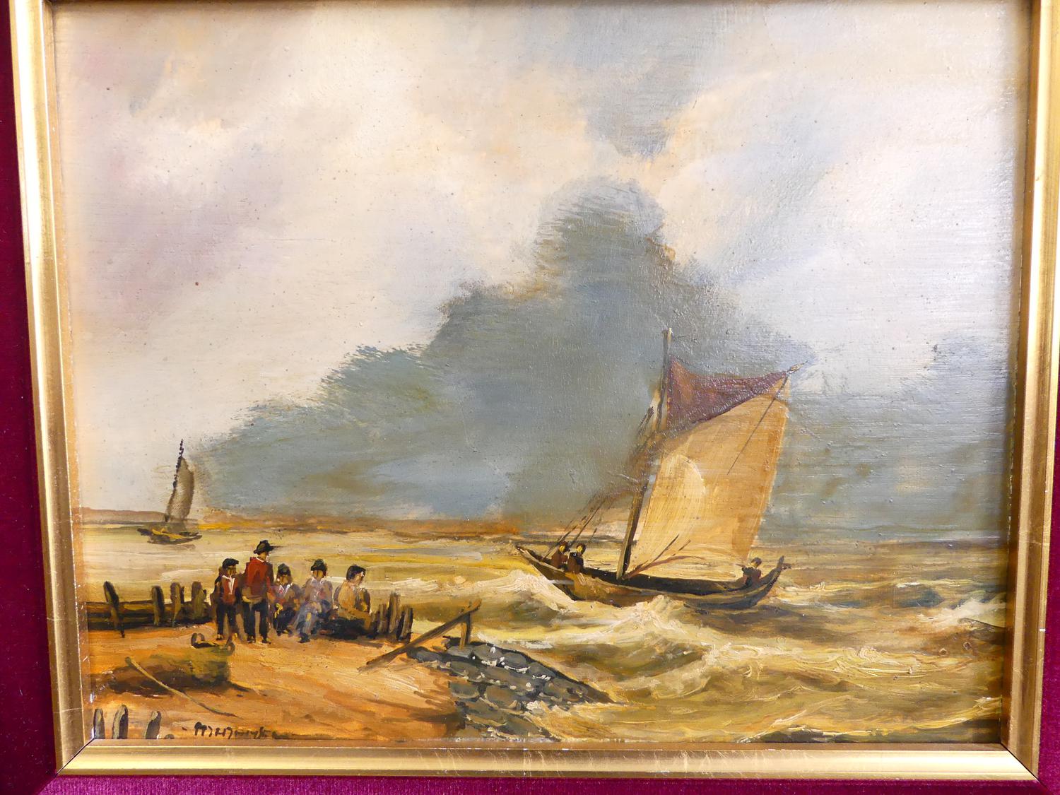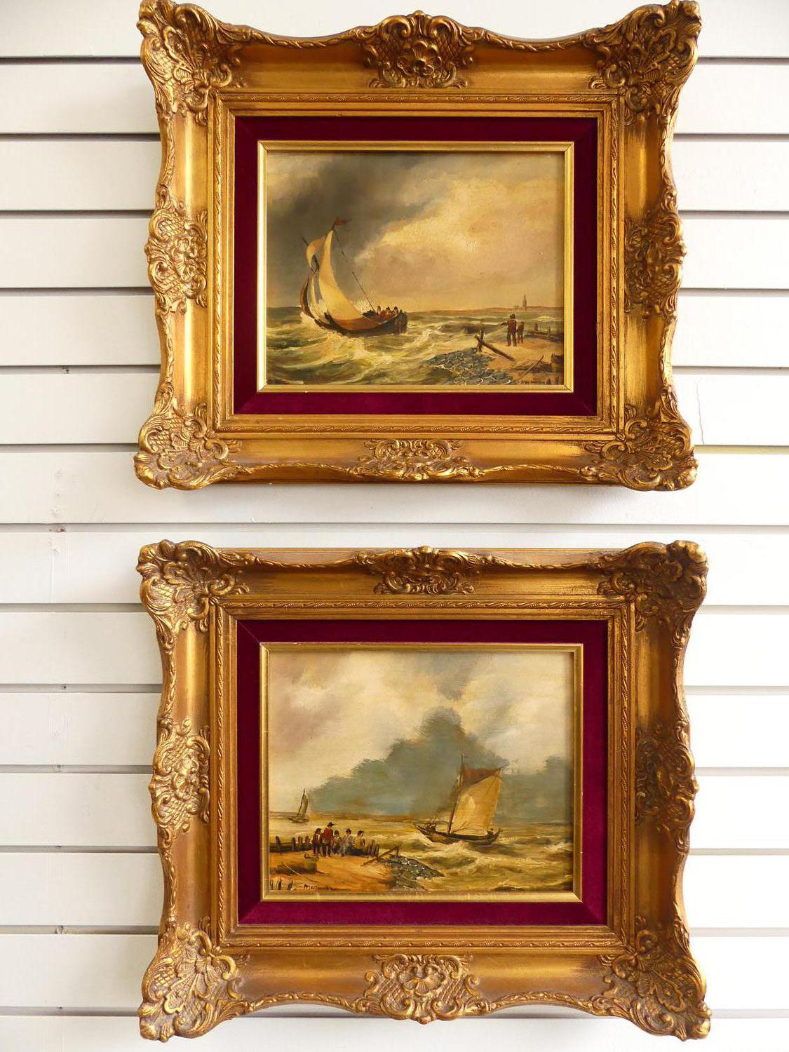 pair of mid century dutch school, oil on board, indistinctly signed, 9" x 11", "fishing boats"