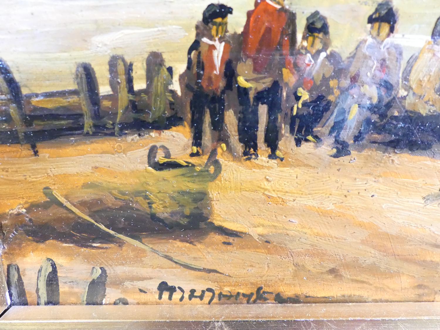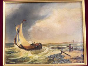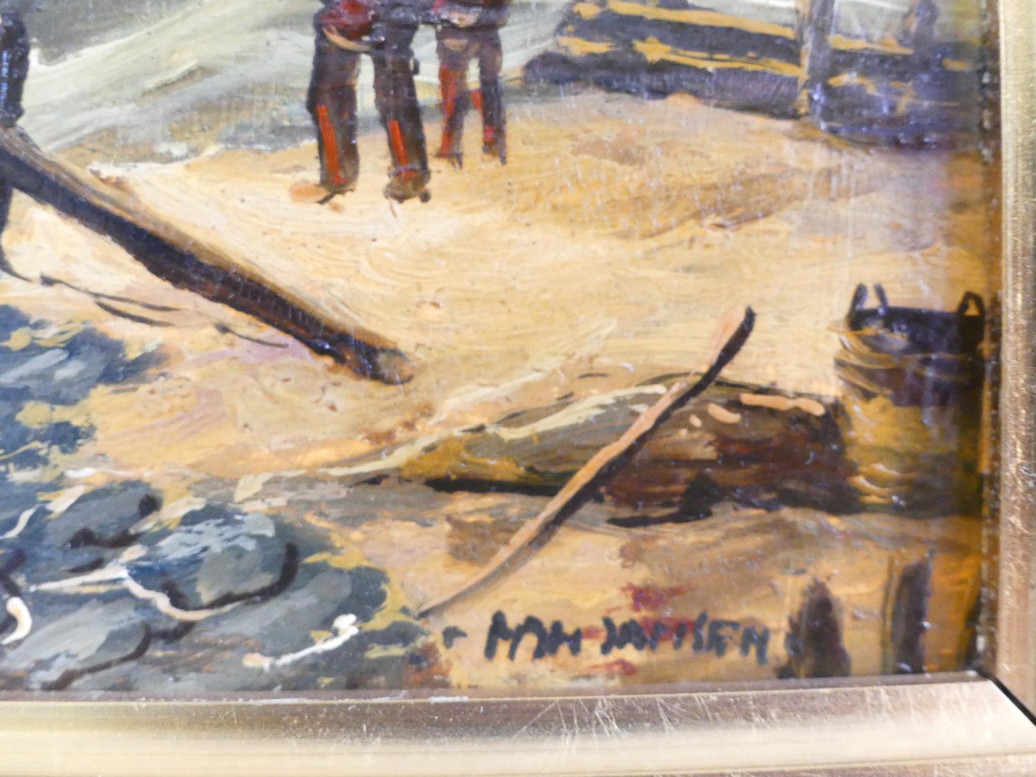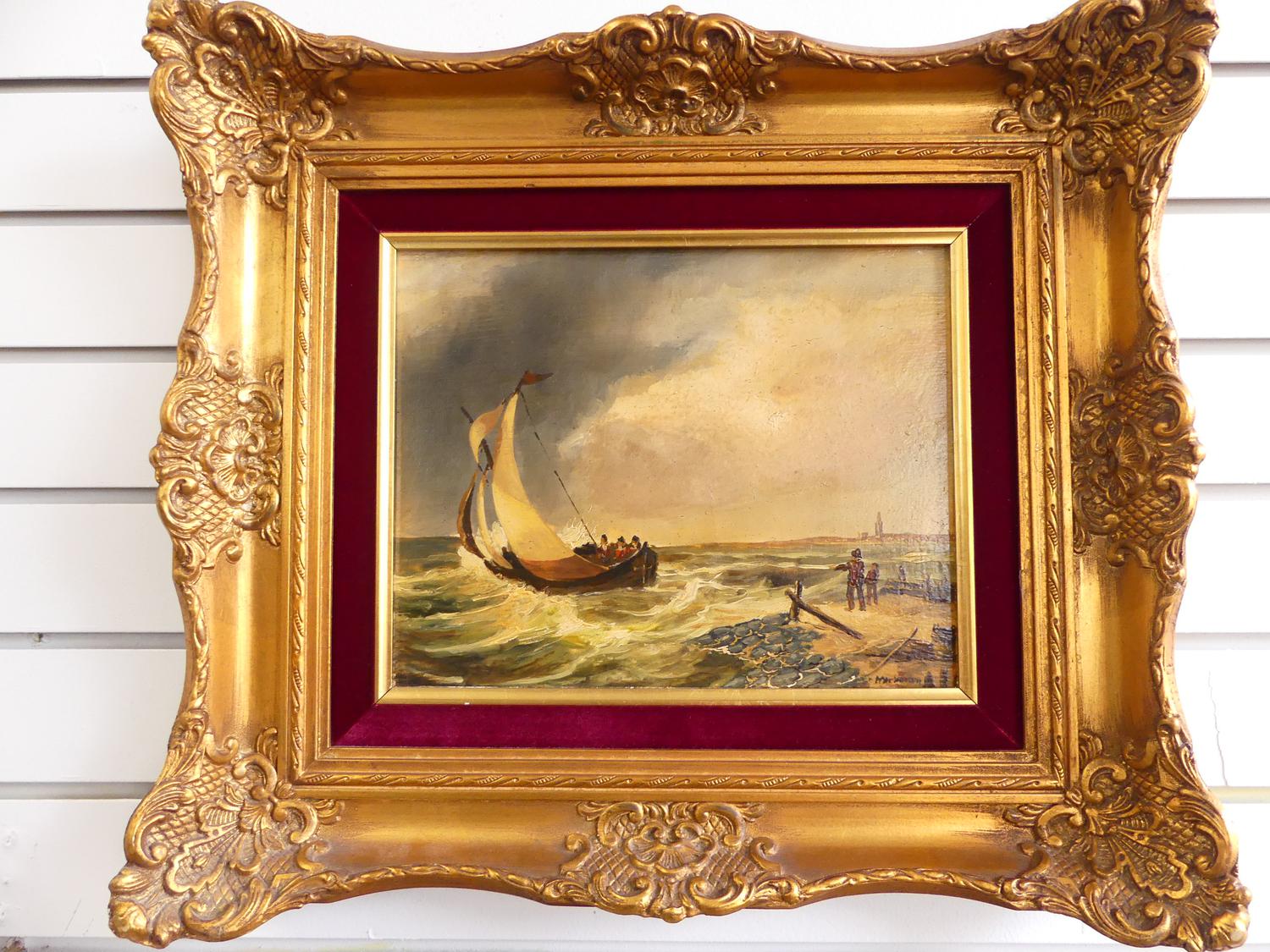 pair of mid century dutch school, oil on board, indistinctly signed, 9" x 11", "fishing boats"