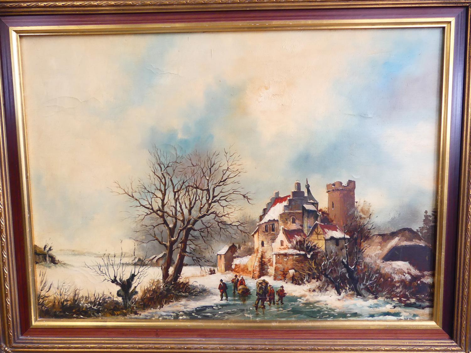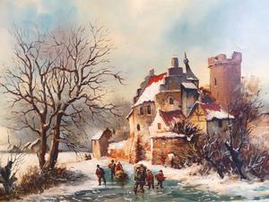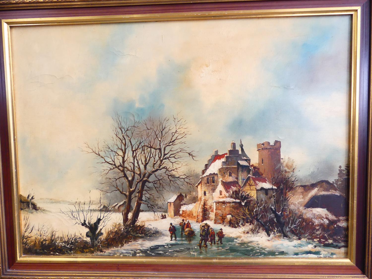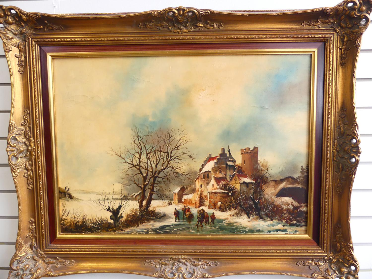j. b. arts, oil on canvas, 20" x 27", "dutch winter scene with skaters"