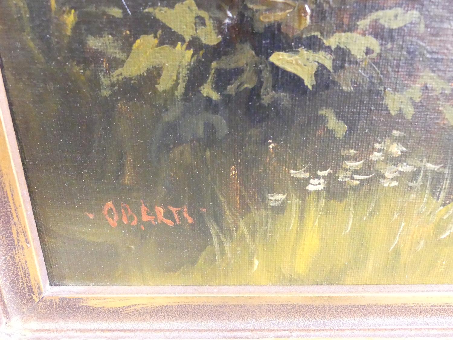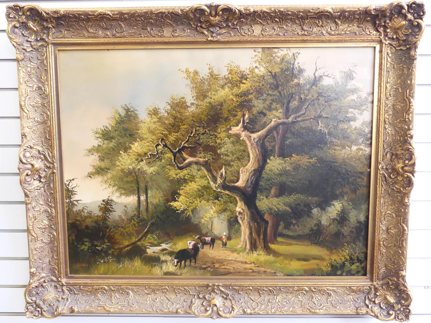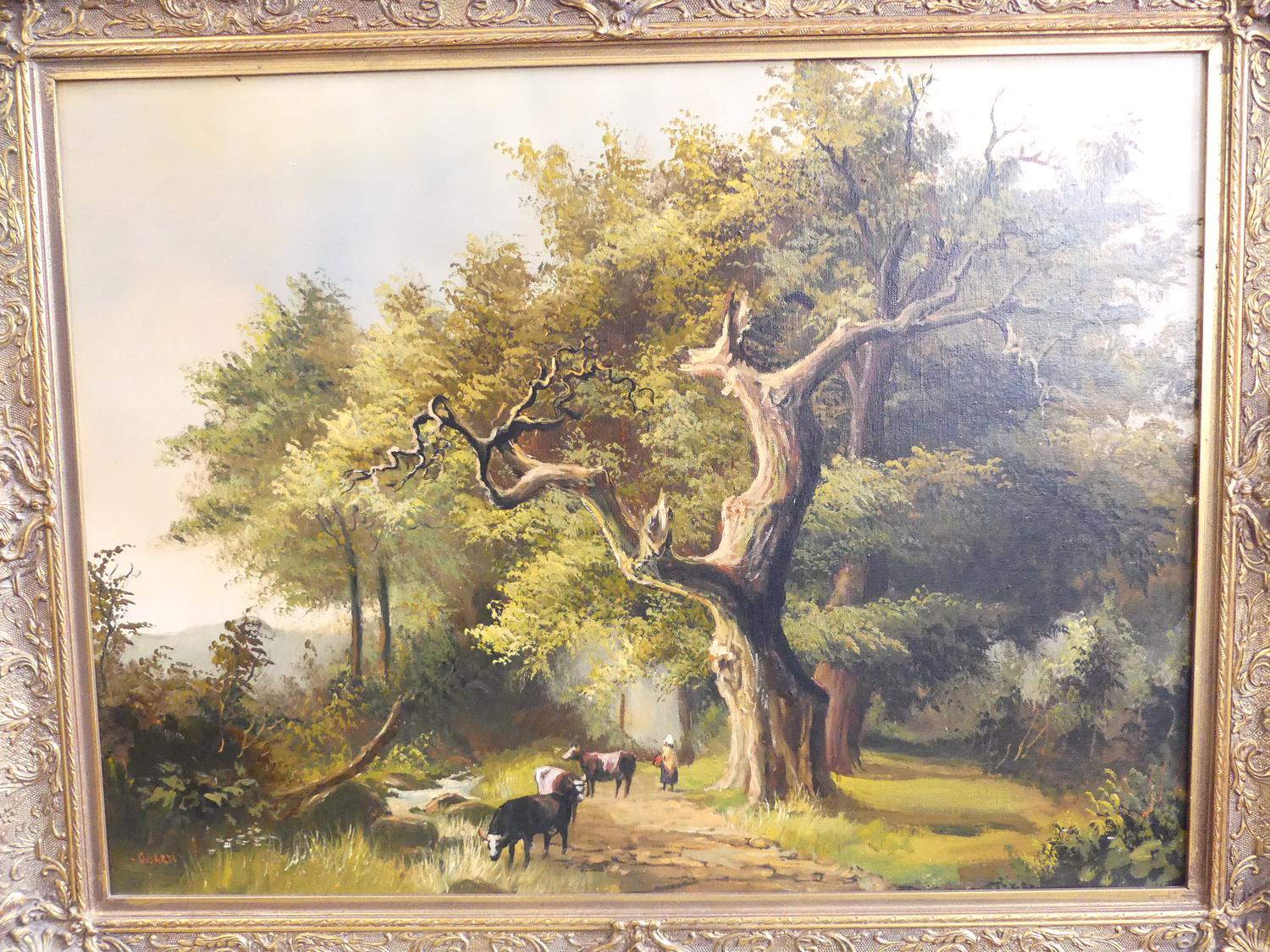 j.b. arts, oil on canvas, 24" x 32", "forrest landscape with cattle"