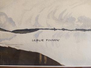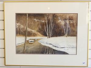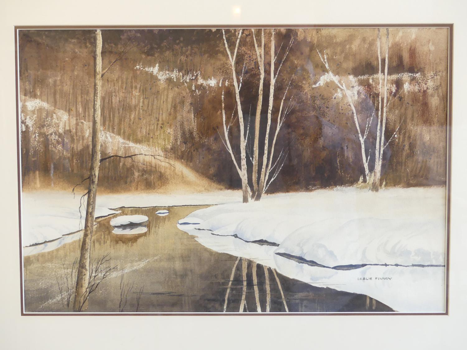 leslie finney, watercolor, 13" x 18 1/2", "winter scene with birches"