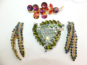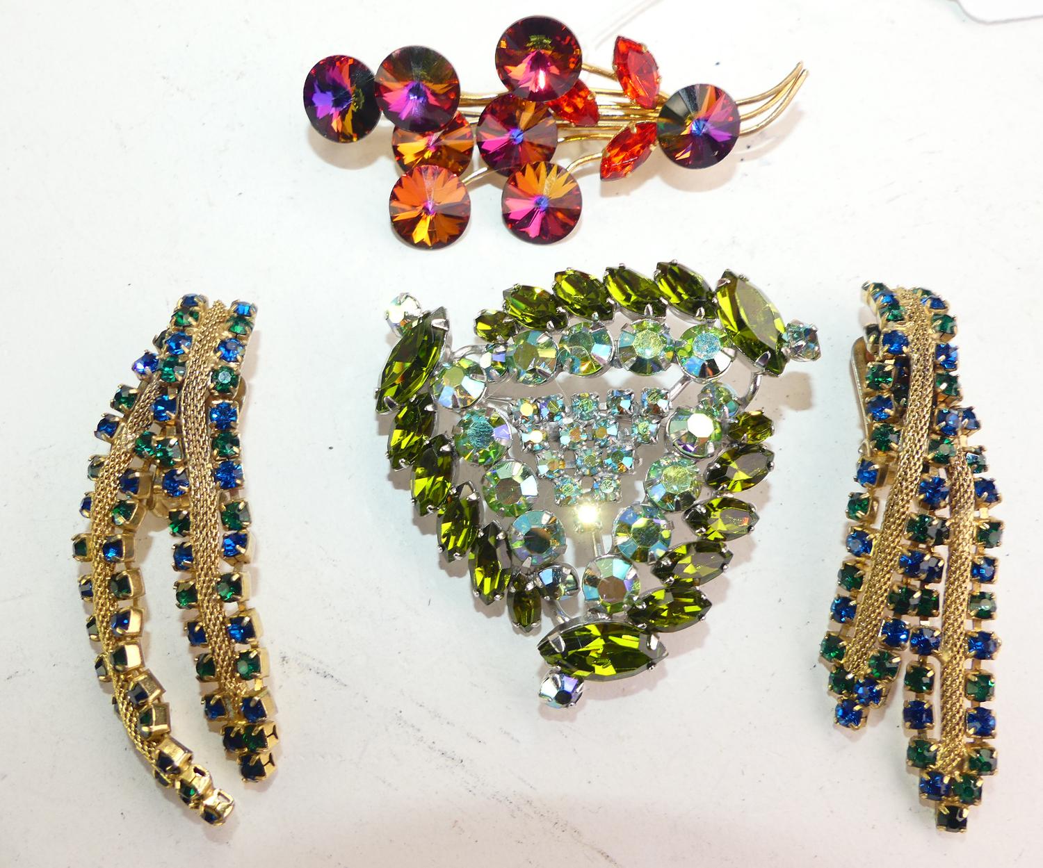 1950s rhinestone earrings, and two brooches