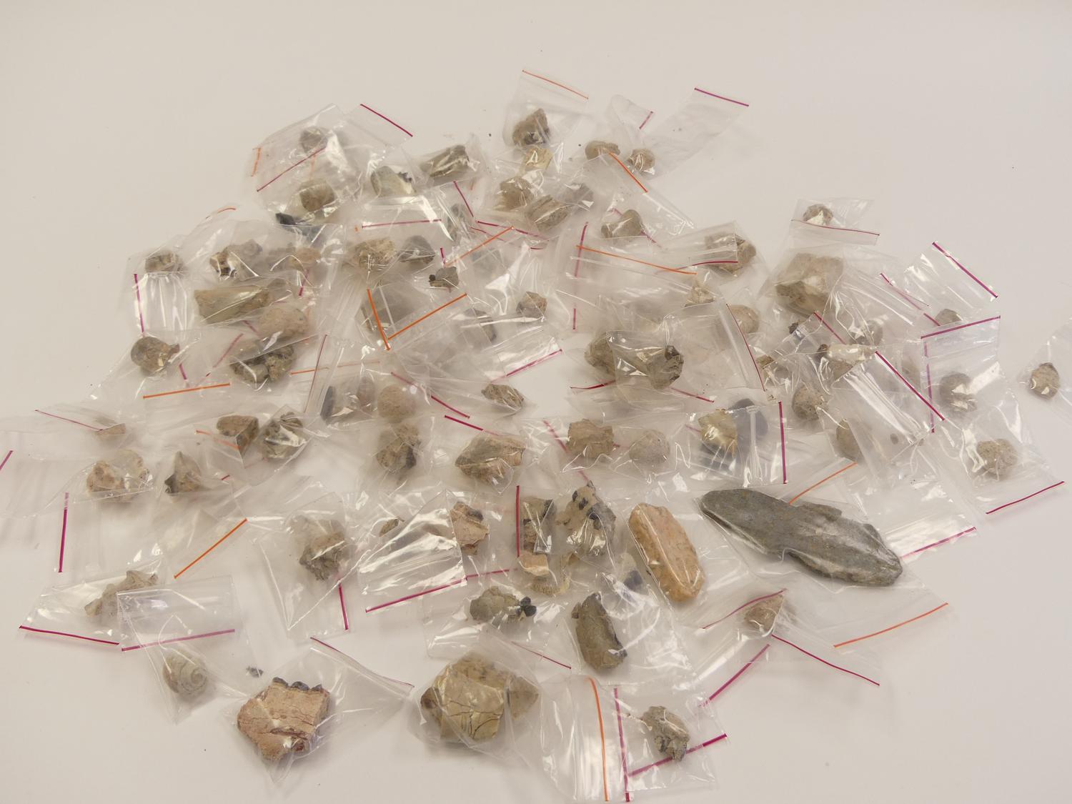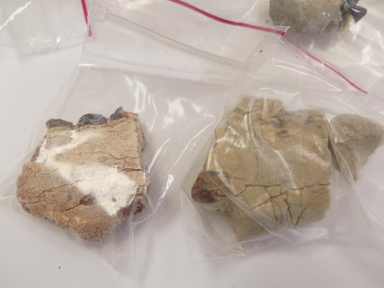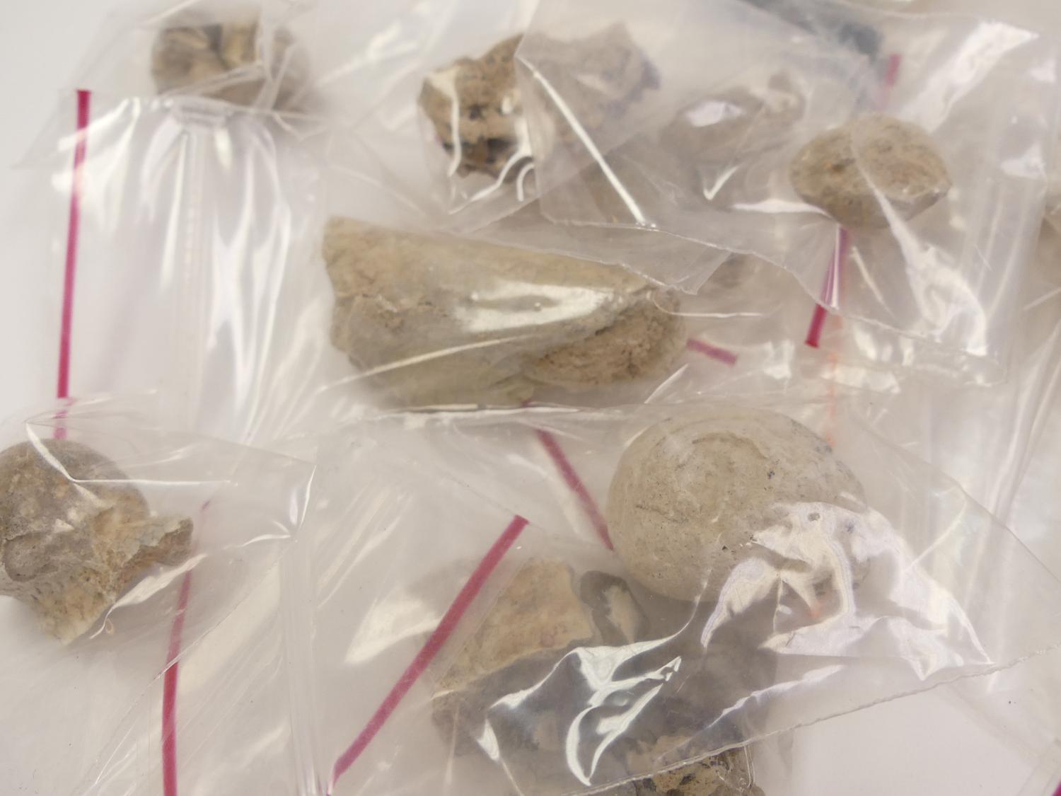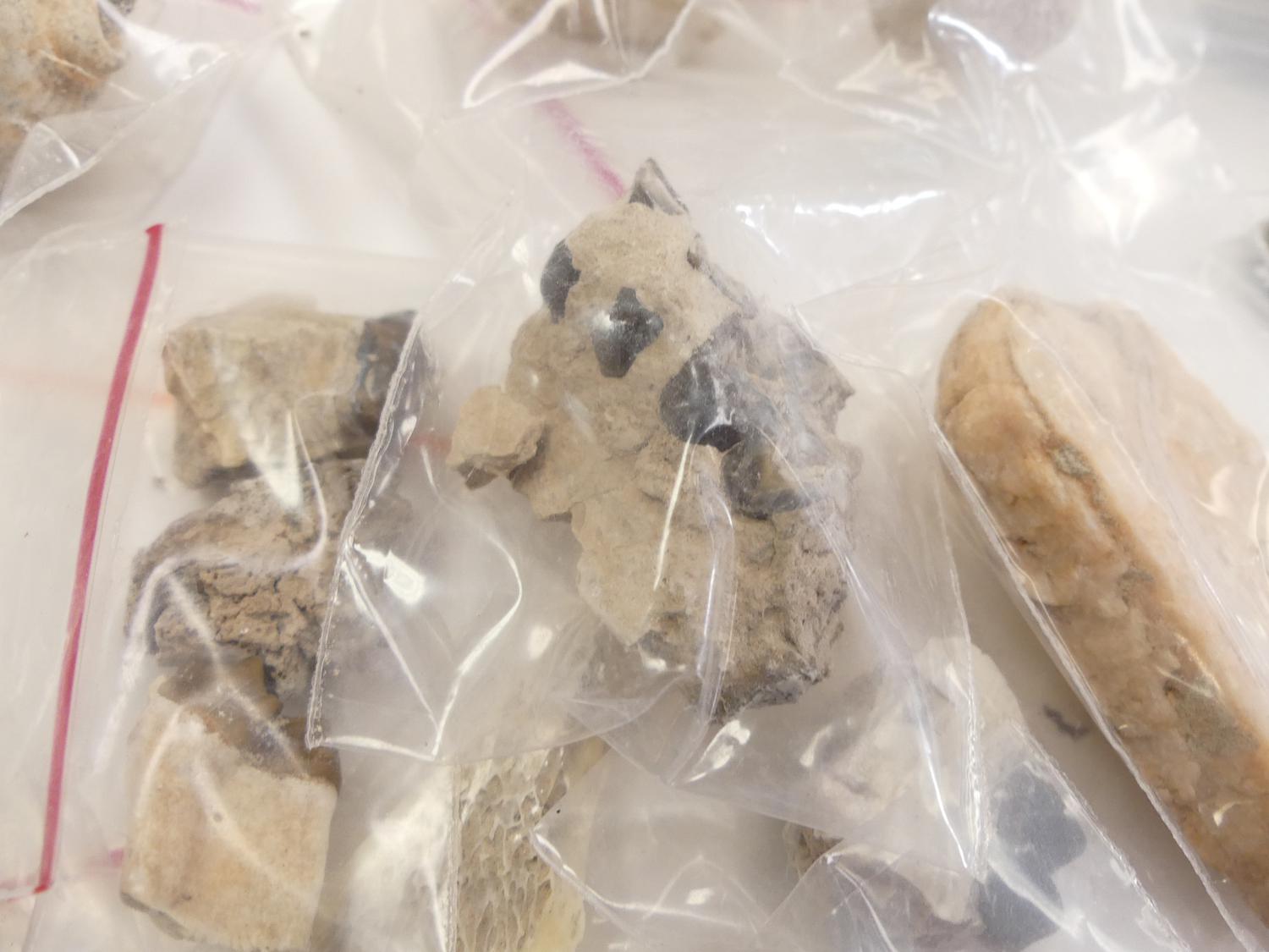 lot of fossil dinosaur bones and teeth, 4 1/2" and smaller