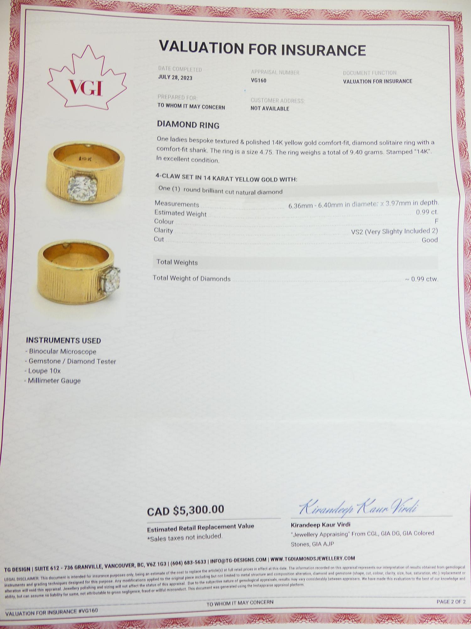 14k gold diamond ring, size 4, .99cts, f/vs2, with appraisal, weighing approx 9.6 grams