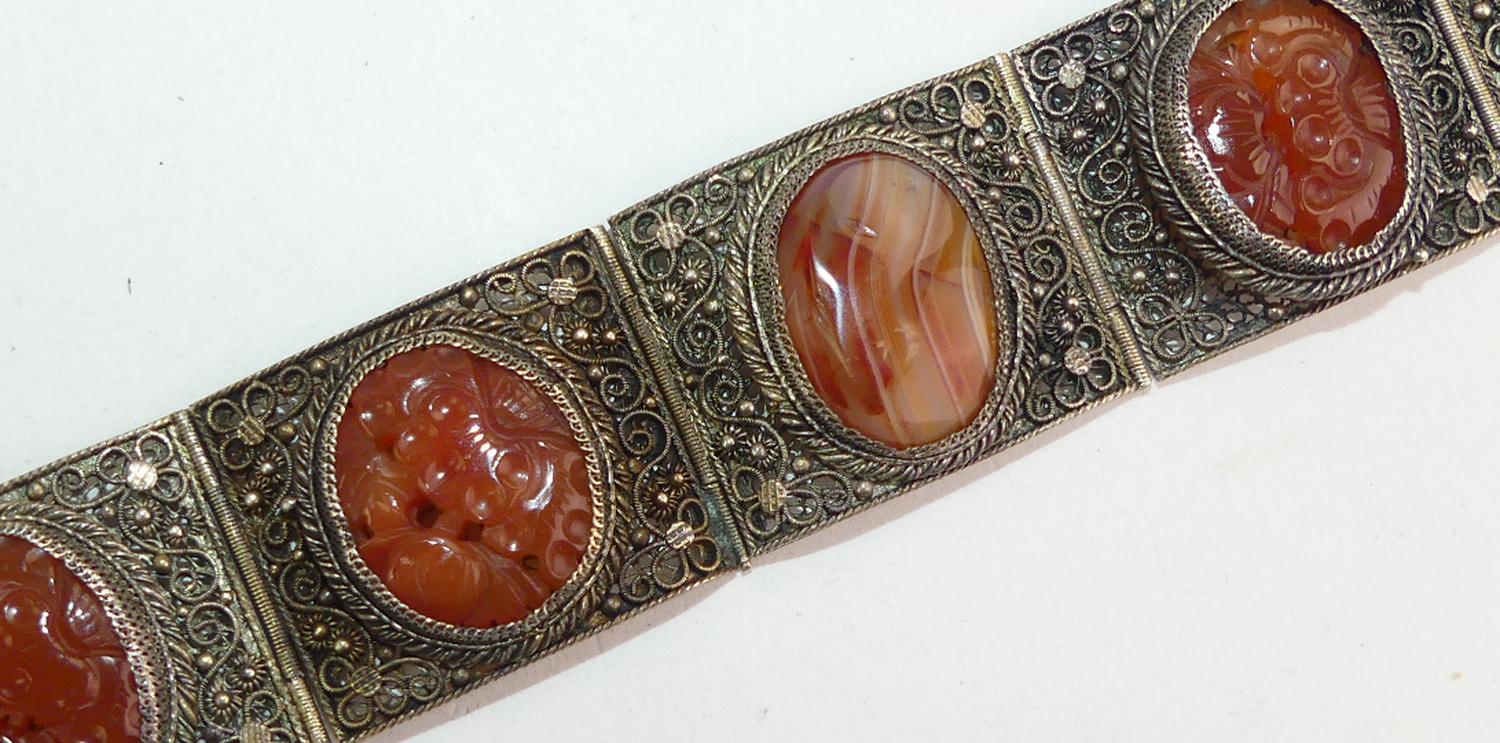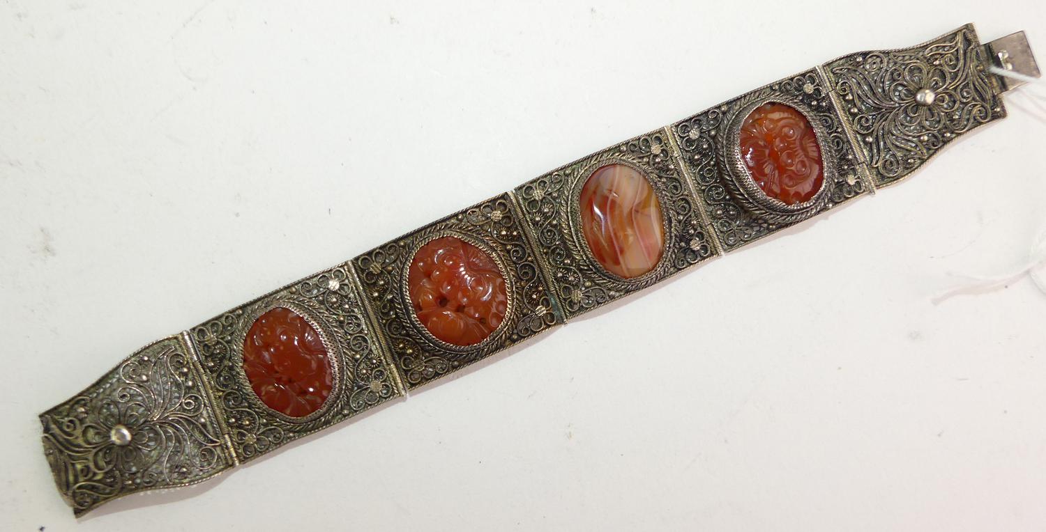 antique chinese silver filigree carnelian panel bracelet, length 7"