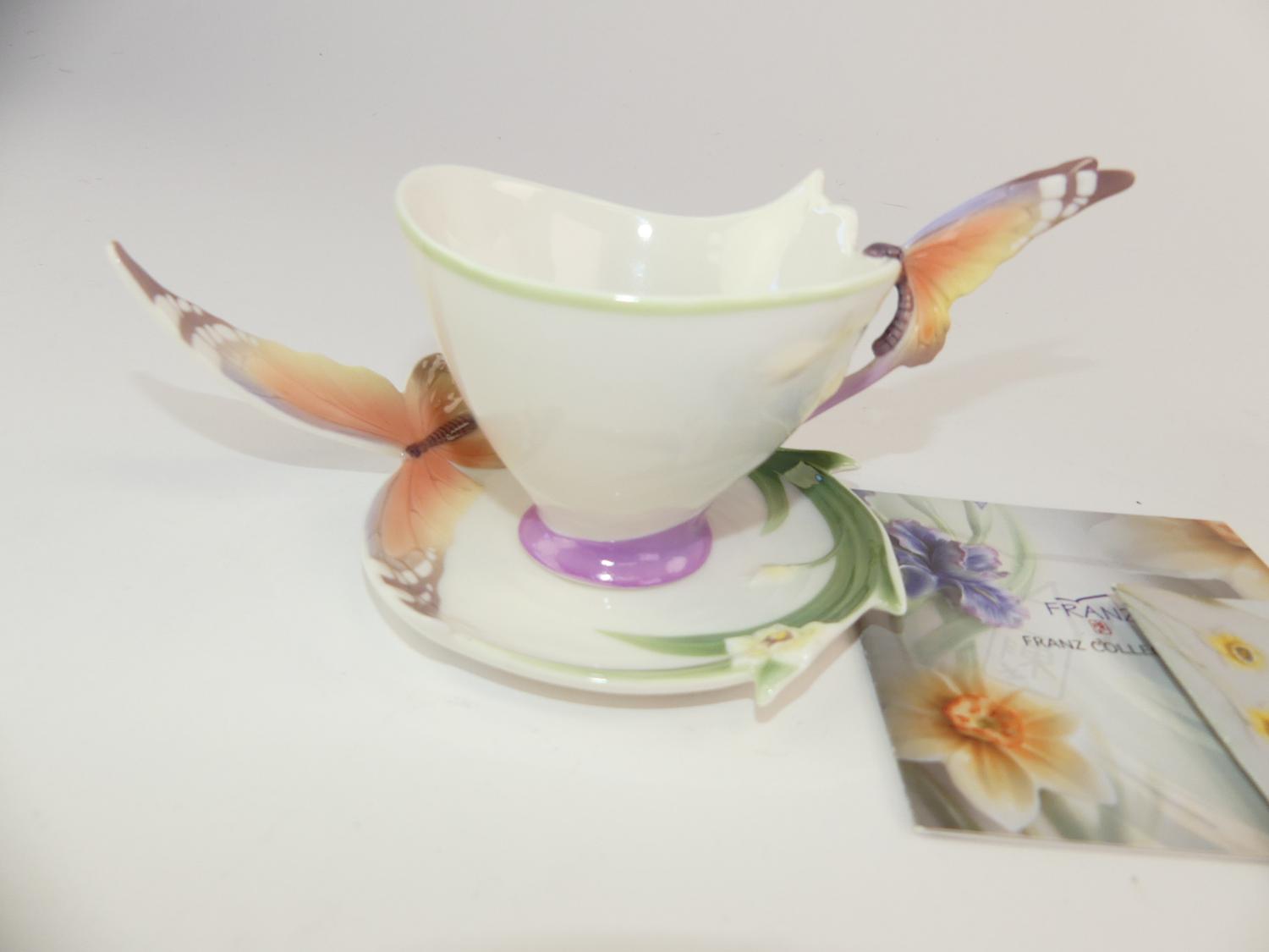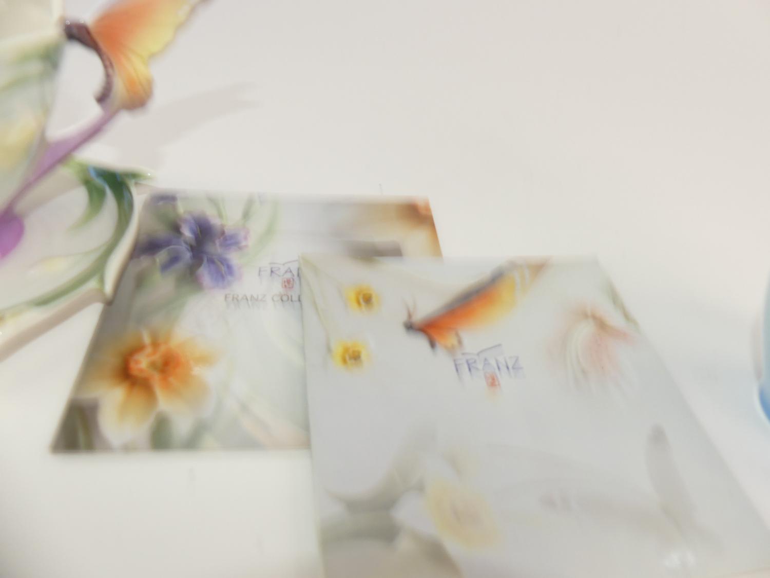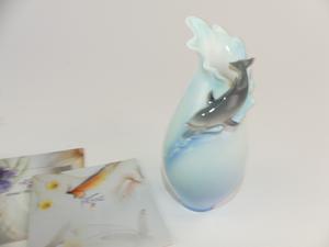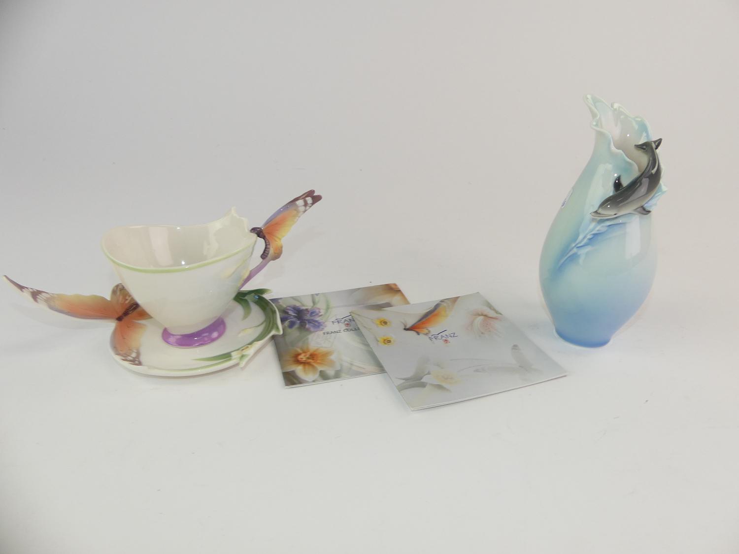 franz butterfly tea cup and saucer with a dolphin vase, ht. 6" or smaller