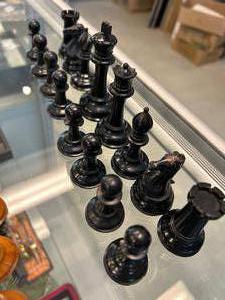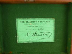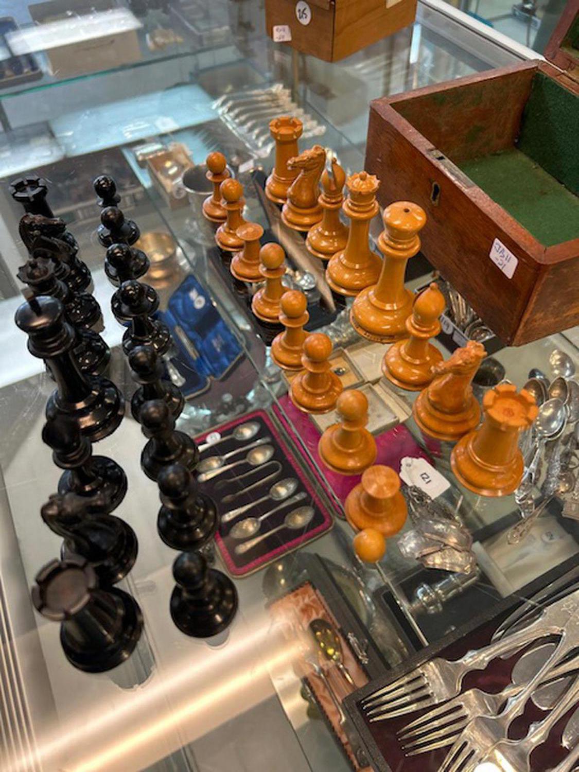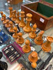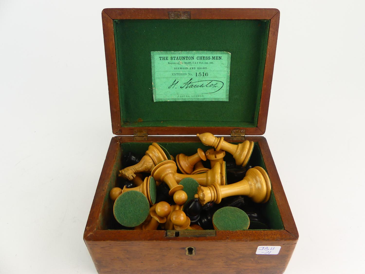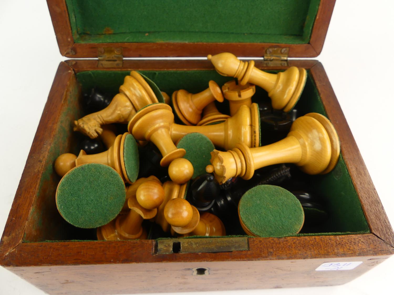 antique set of boxwood and ebony "the staunton chess-men" by jaques london in a walnut box, 32 pieces some damage