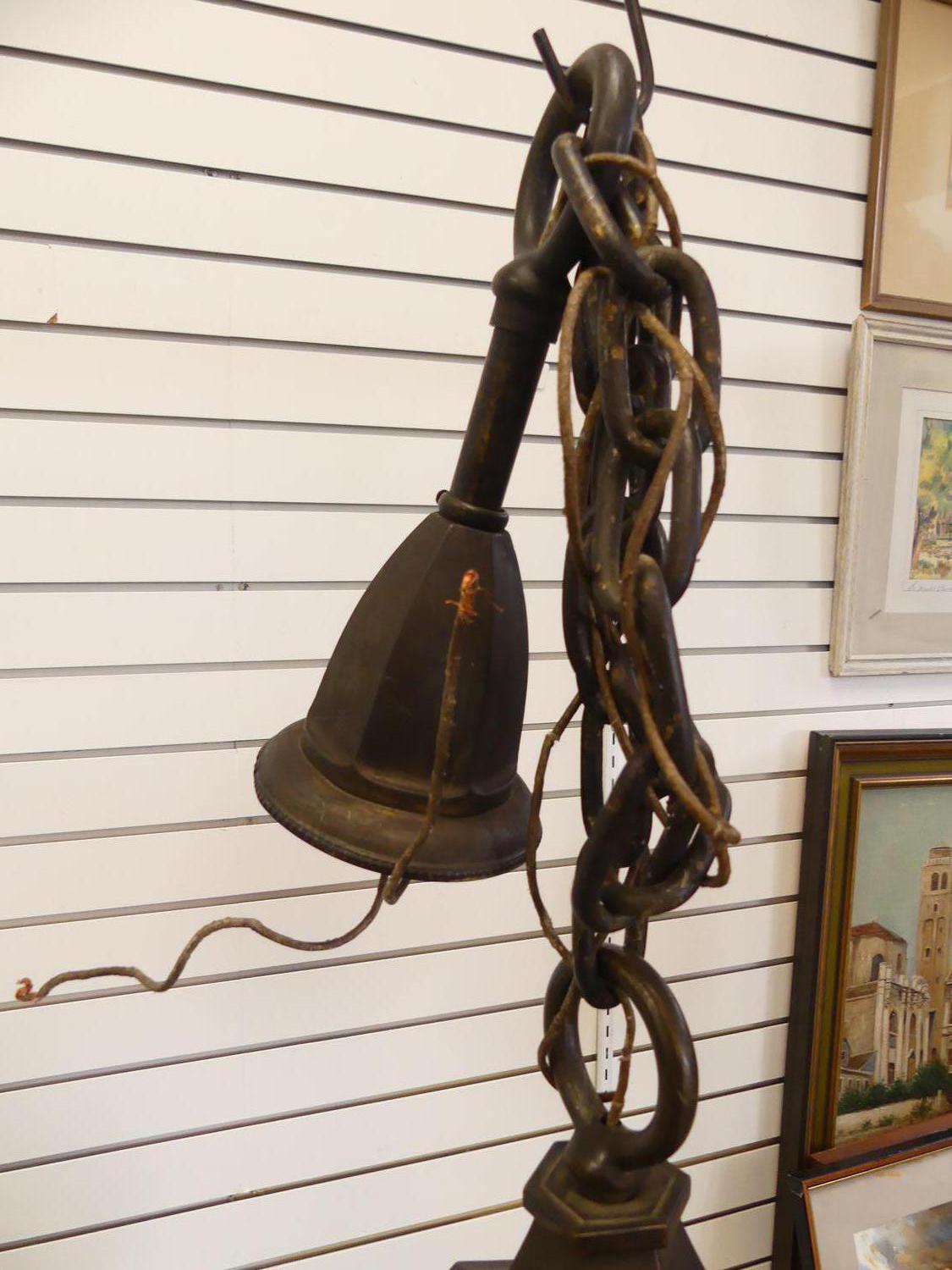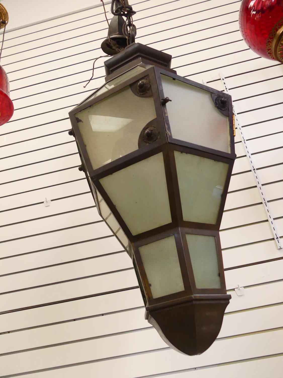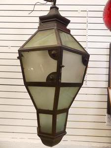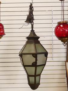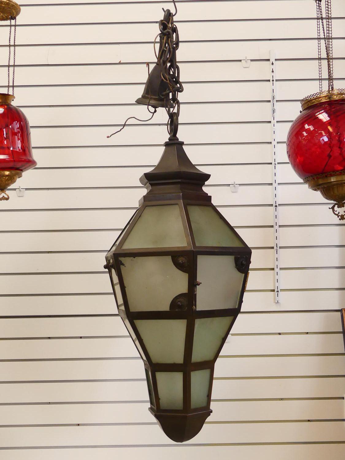 antique brass and glass hanging light fixture, with heavy chain