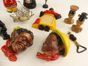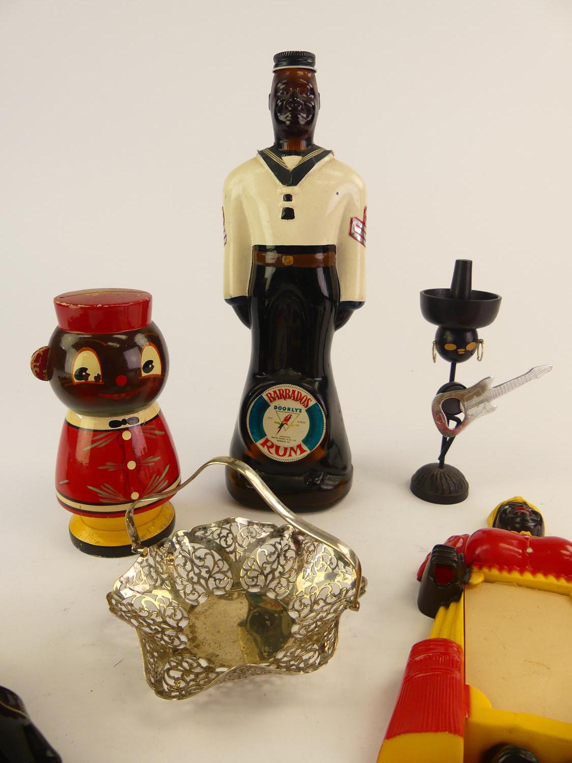 lot of black americana related items including an aunt jemima note pad holder, doorley's barbados rum figural bottle, wooden bell-boy penny bank, etc.