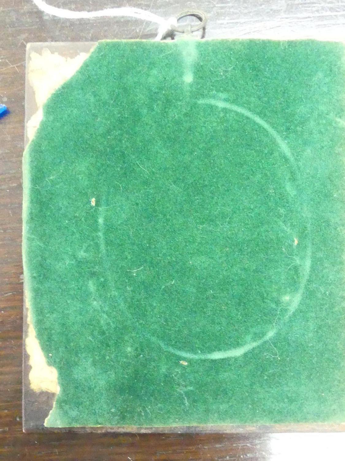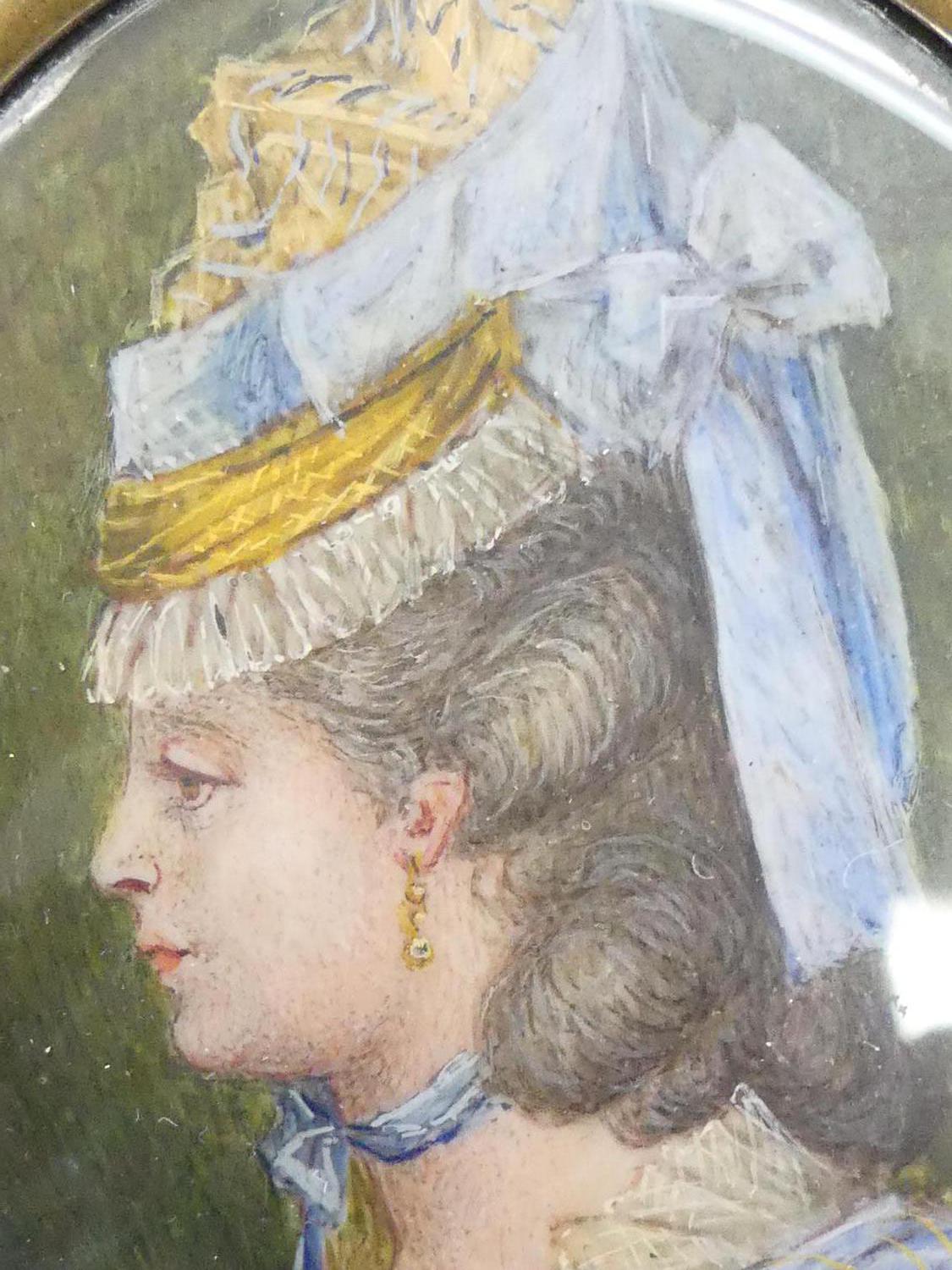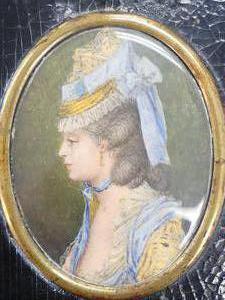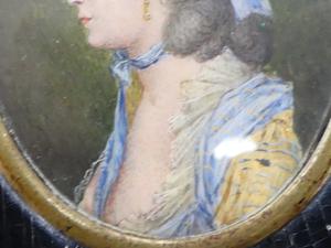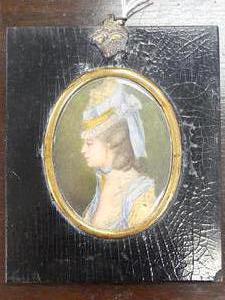 19th century miniature portrait of a woman with blue hat, 3" x 2 1/2"