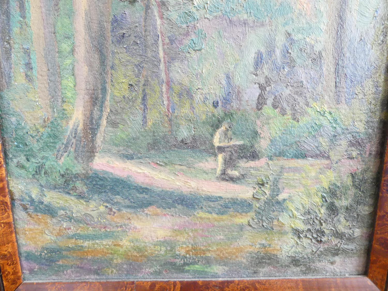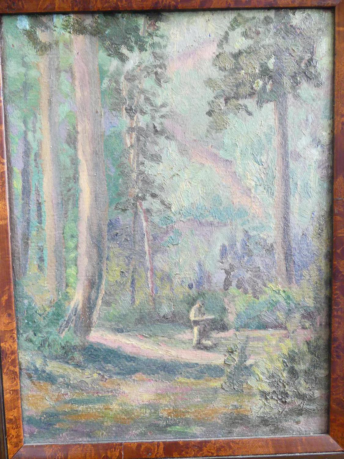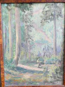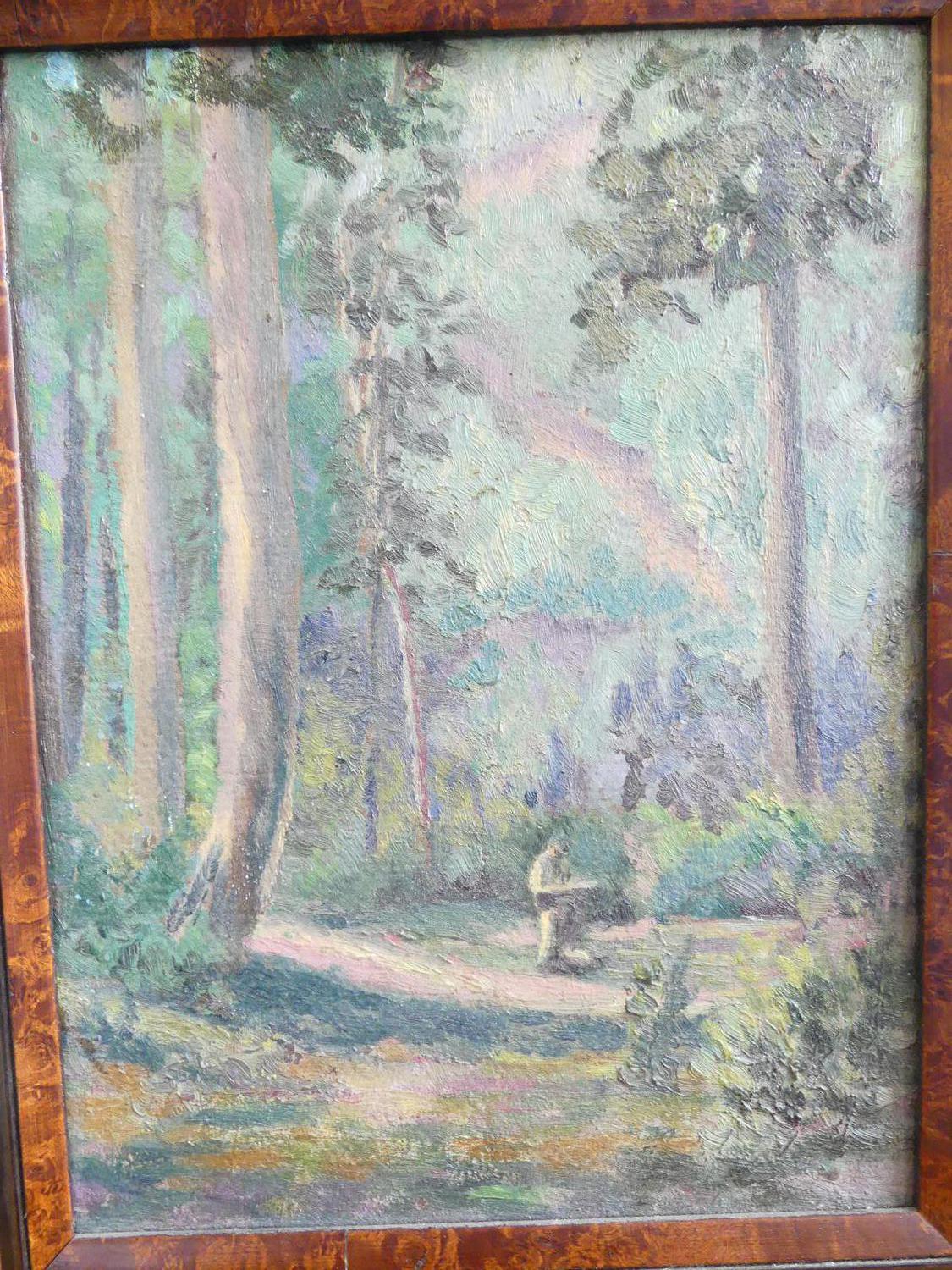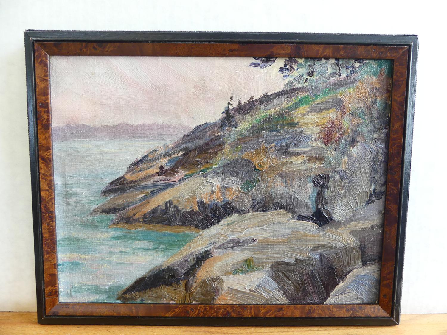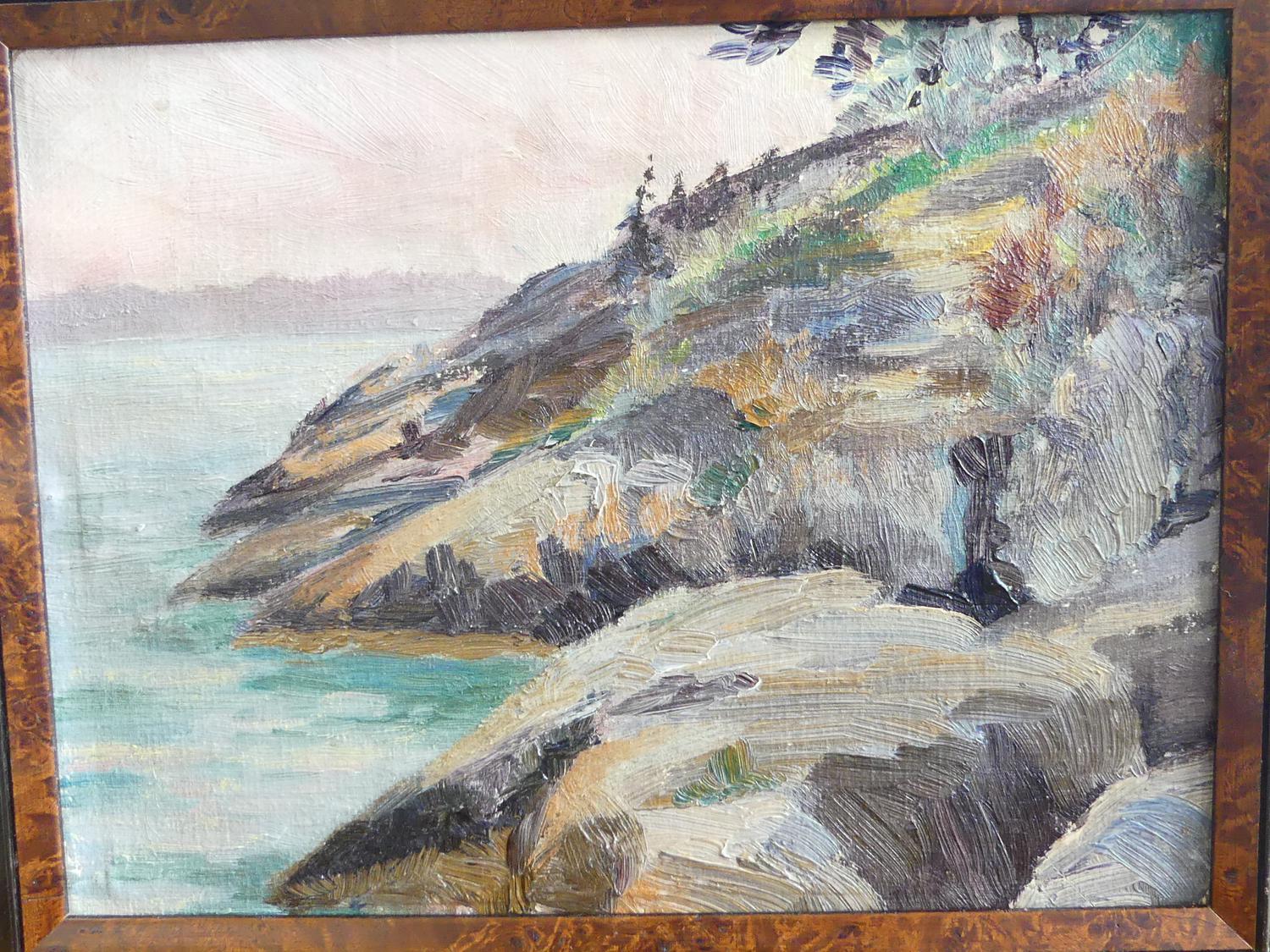 early 20th century canadian school unsigned double sided oil on board, 7 1/2" x 10", "west coast forrest" & "west coast shoreline"