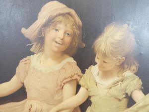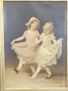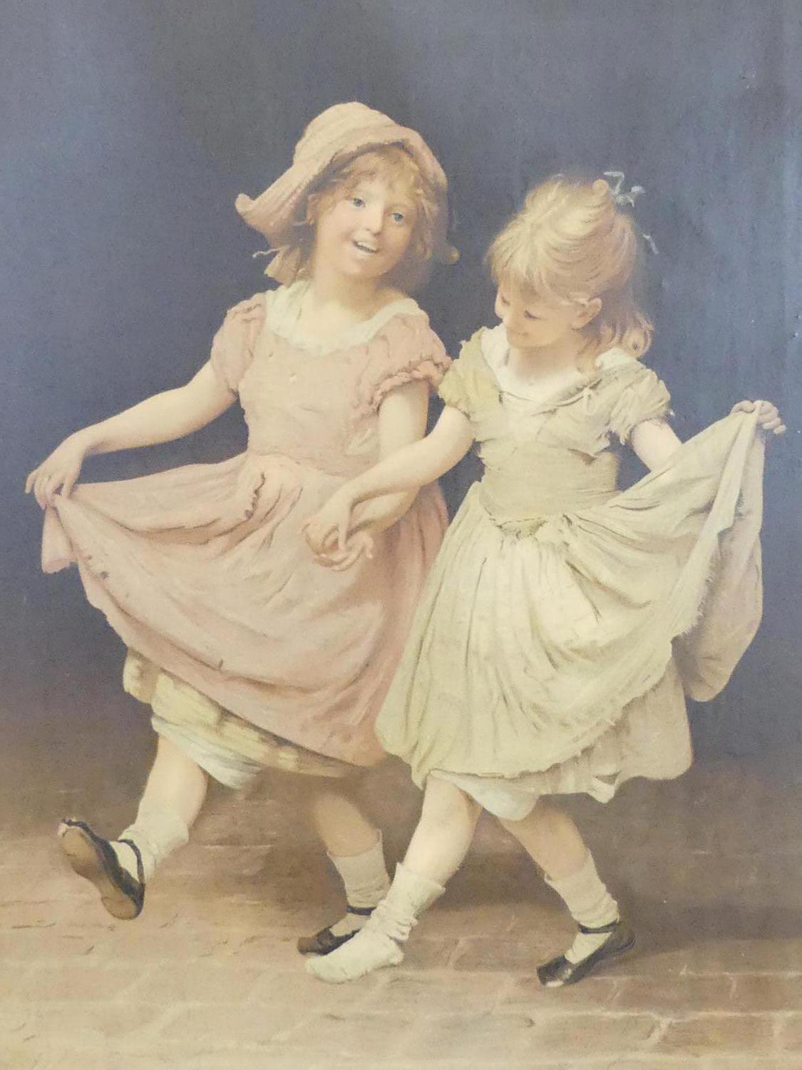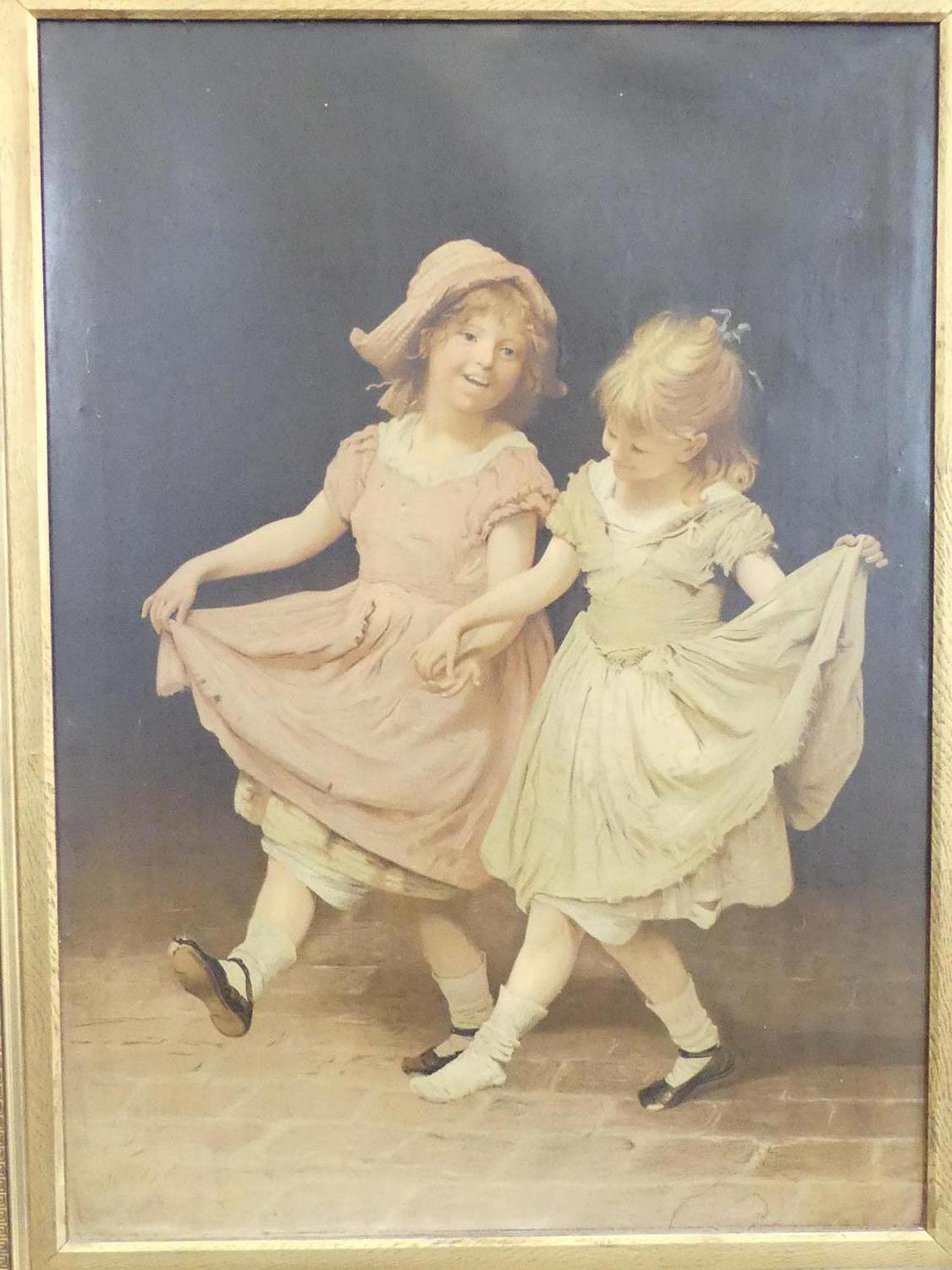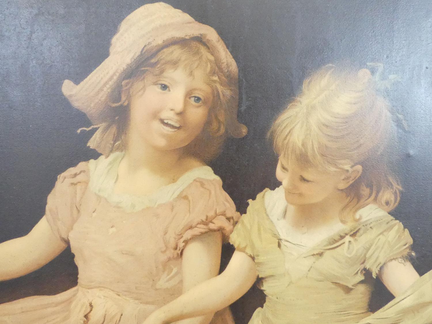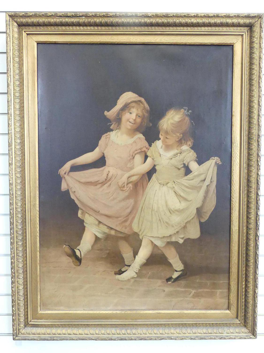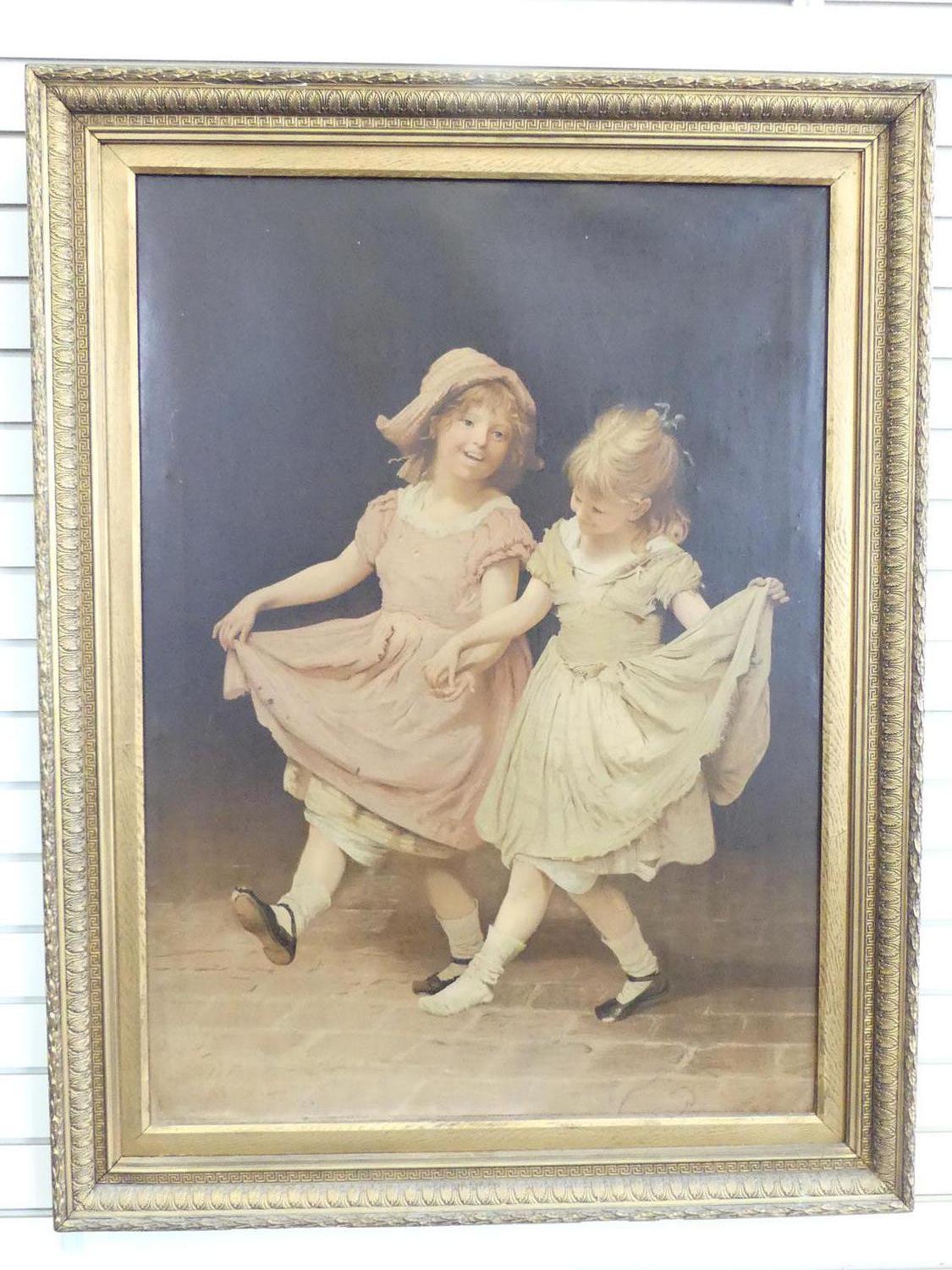 large antique gilt framed canvas print "joyful little girls", overall 46" x 35 1/2"