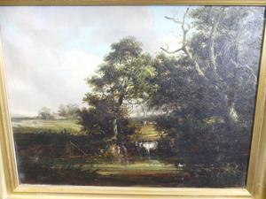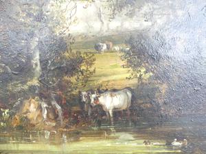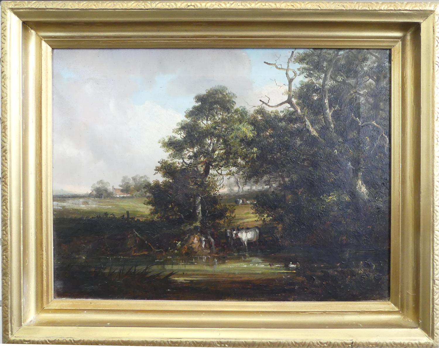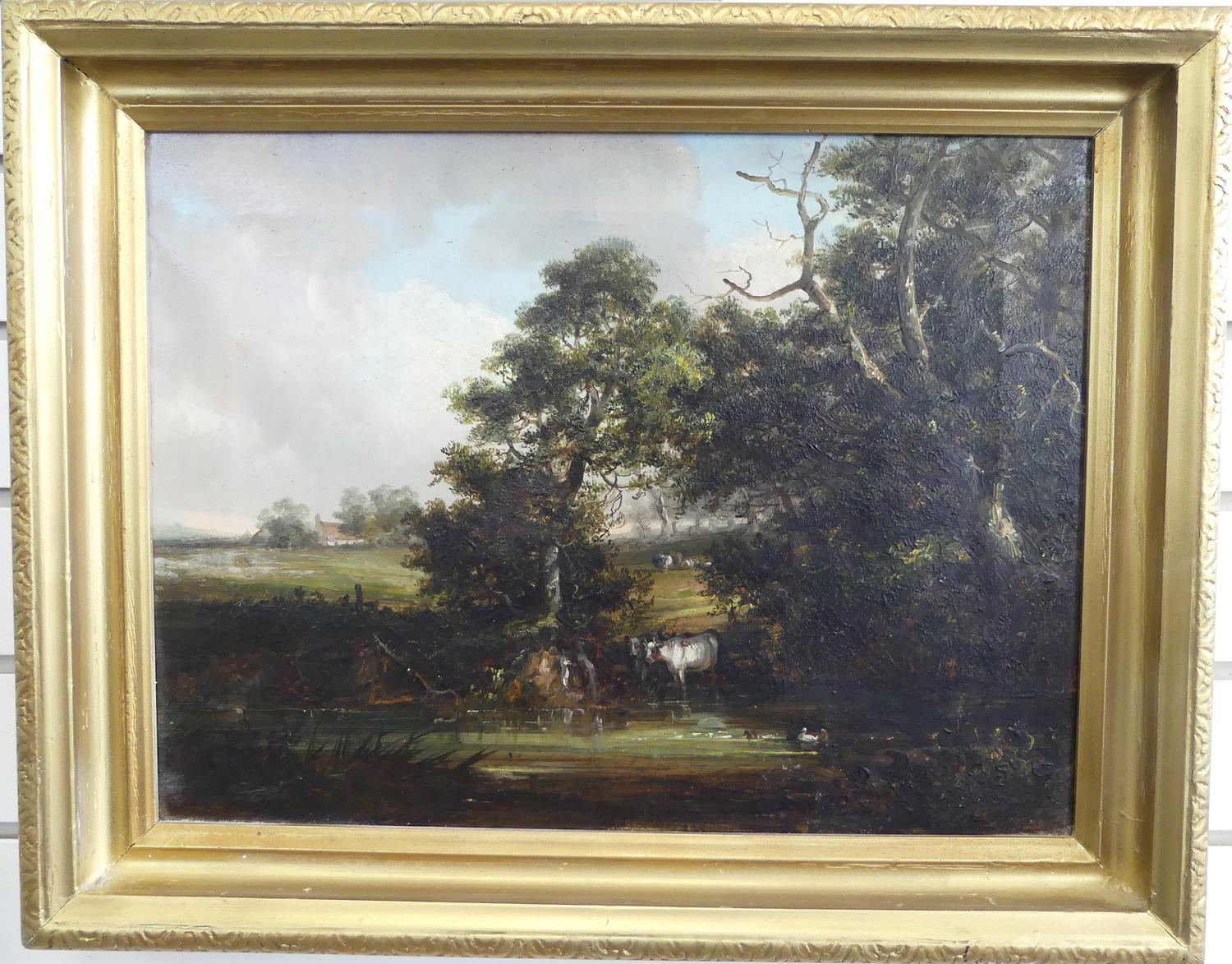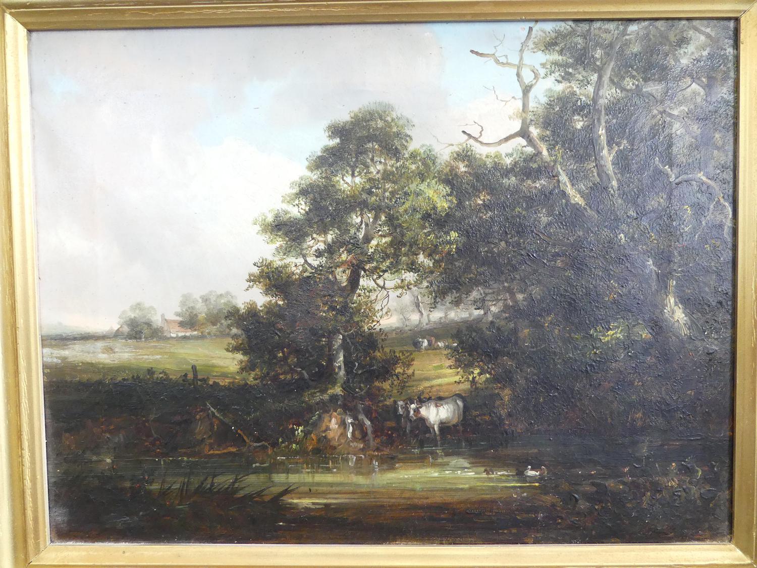 19th century english school oil on canvas, 12" x 16", "landscape with trees and cows"