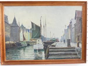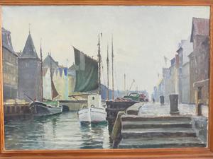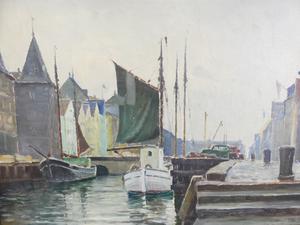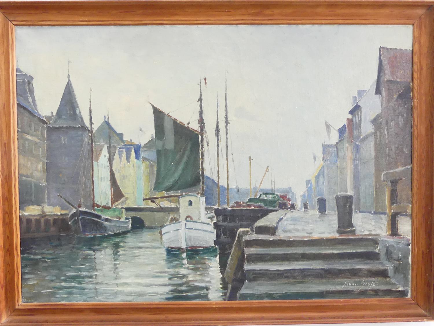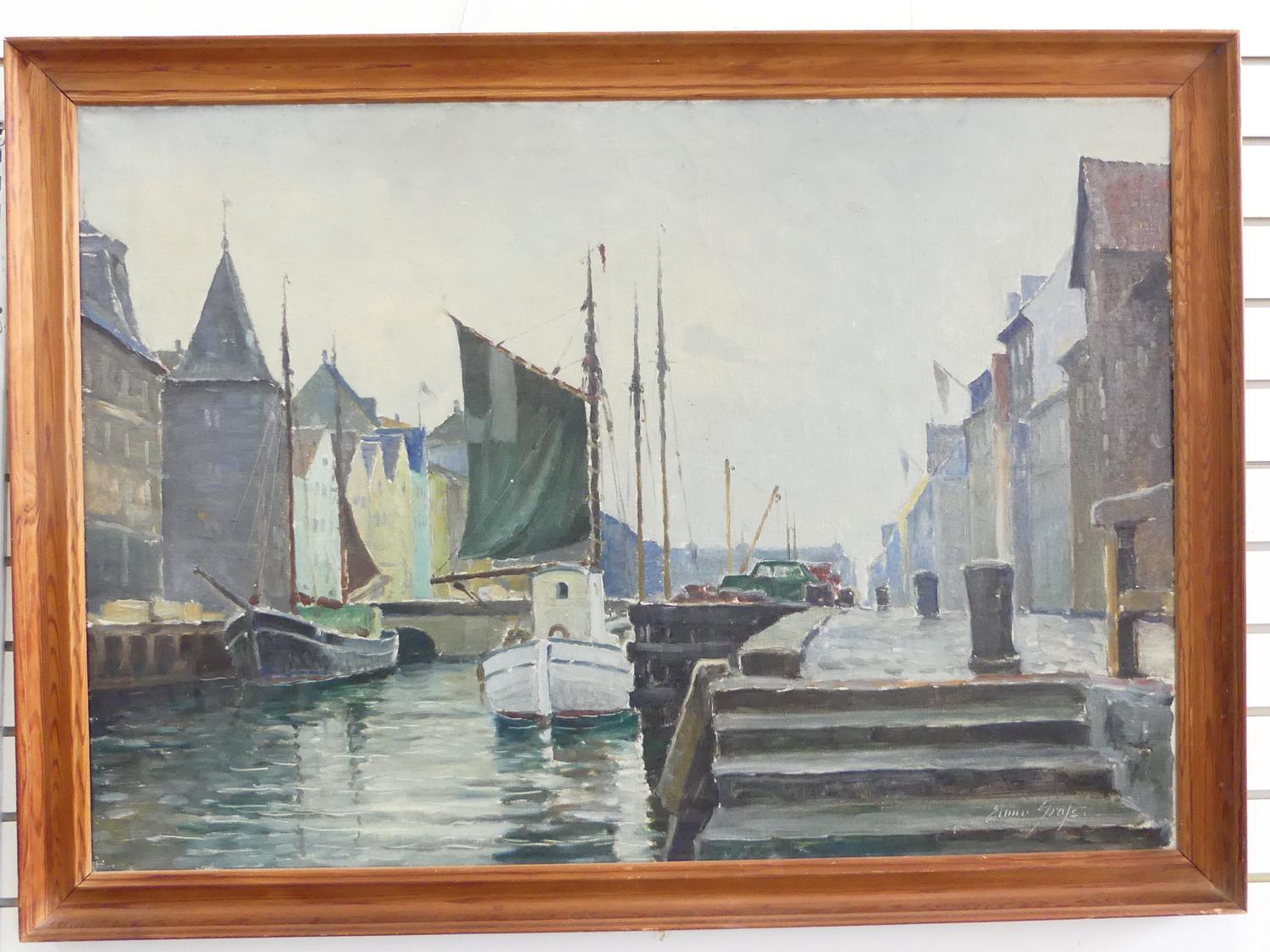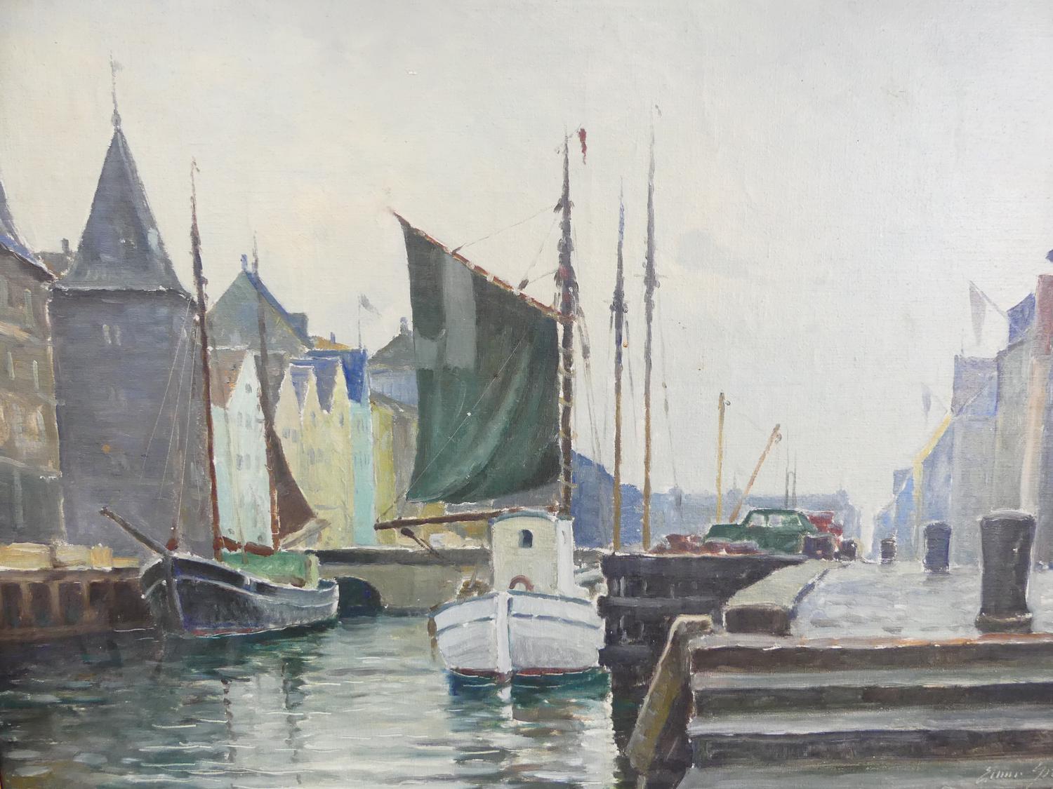 einar gross (1895-1962), oil on canvas, 27" x 38", "fischerboote im hafen"
