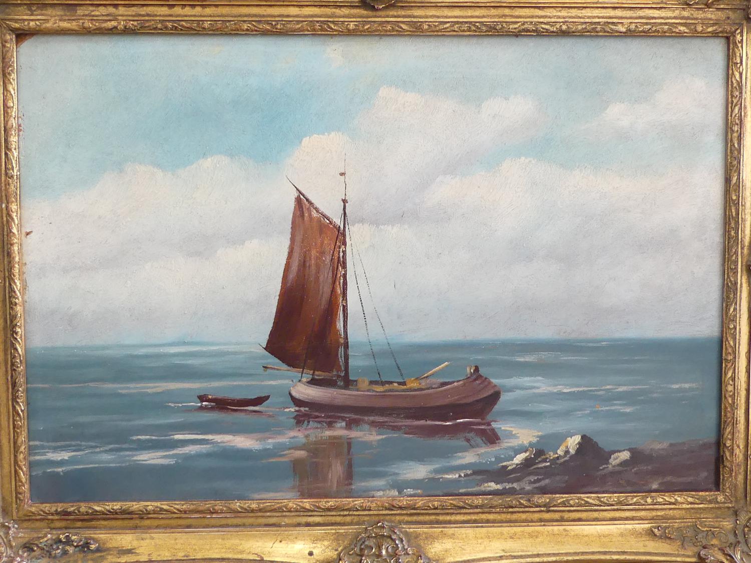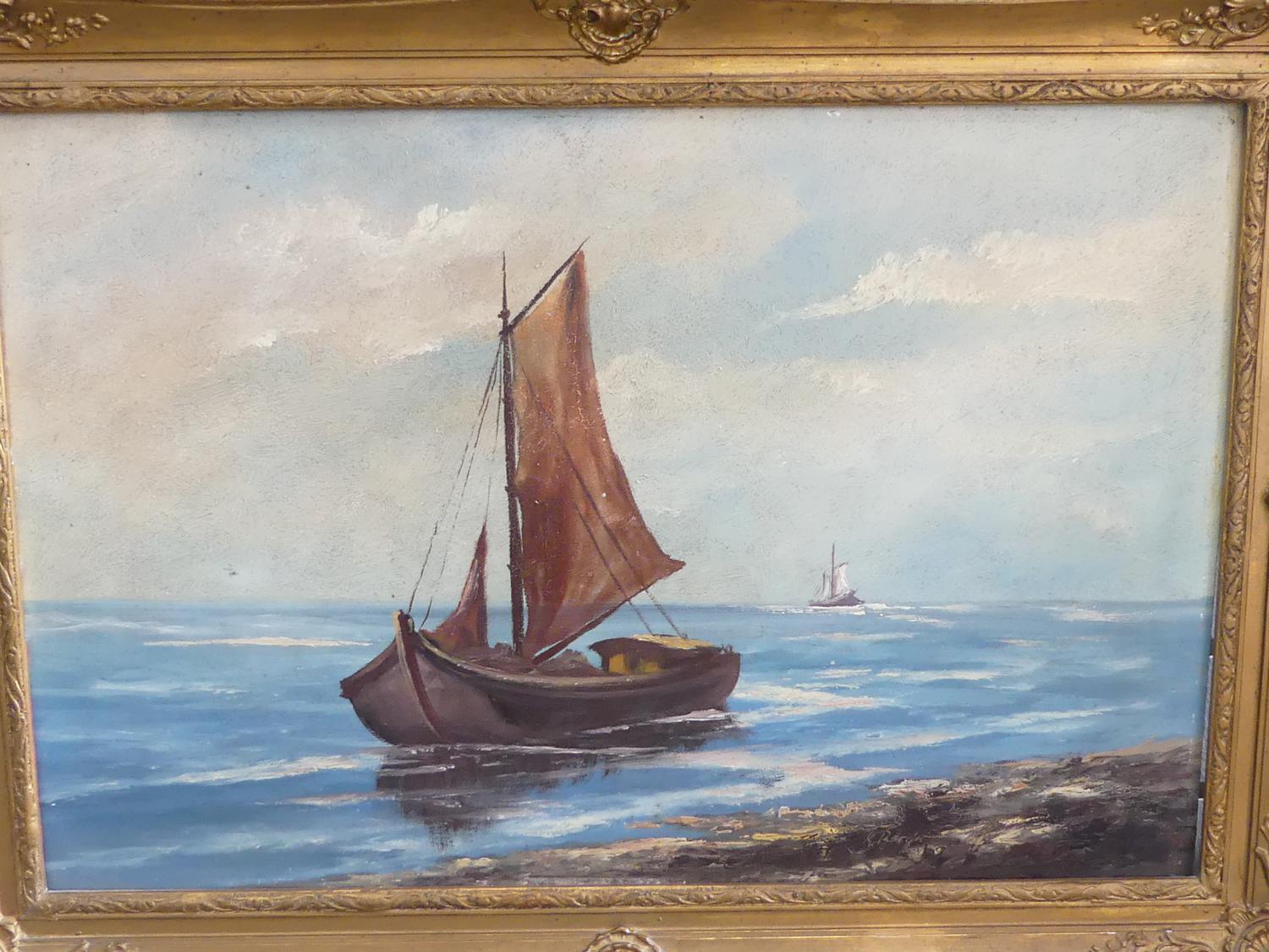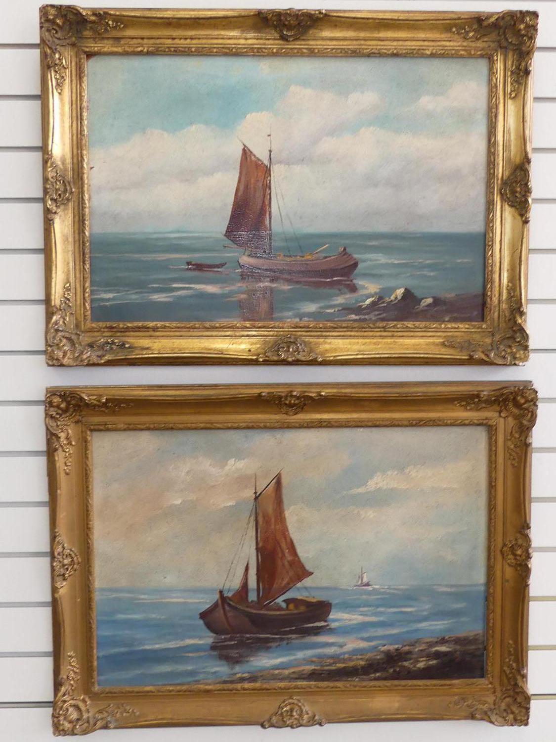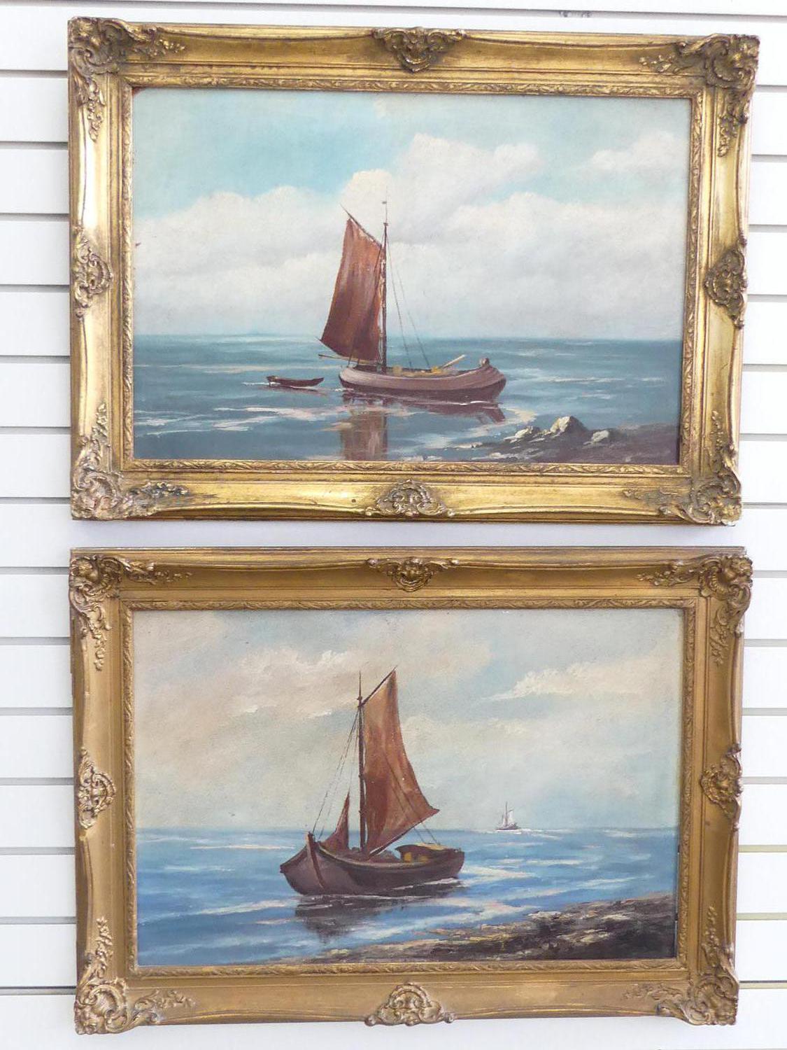 pair of early 20th century gilt framed oil on boards, 15" x 23", "fishing boats"