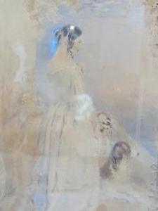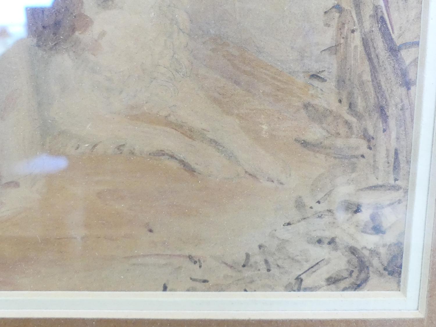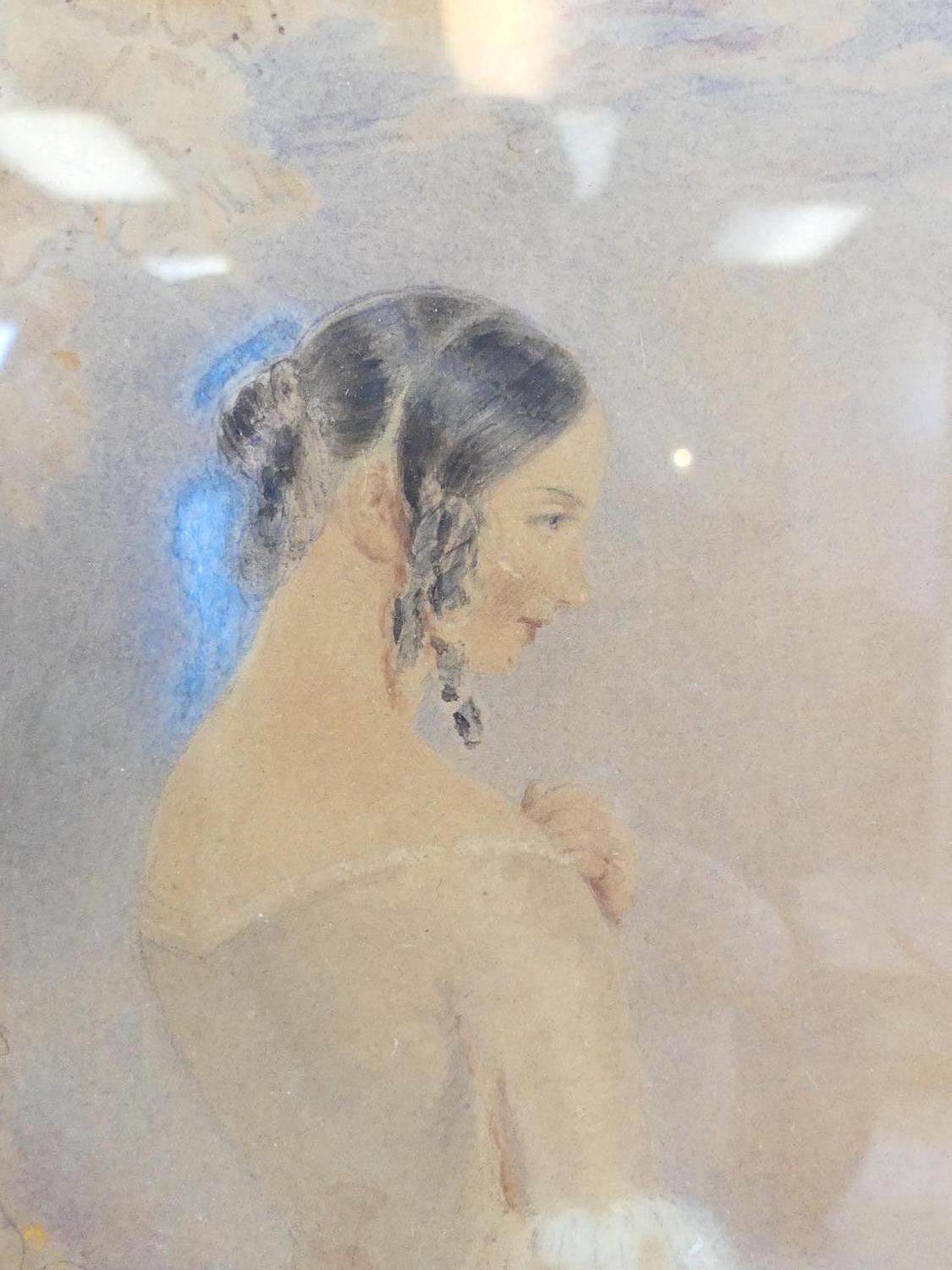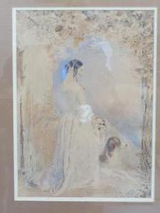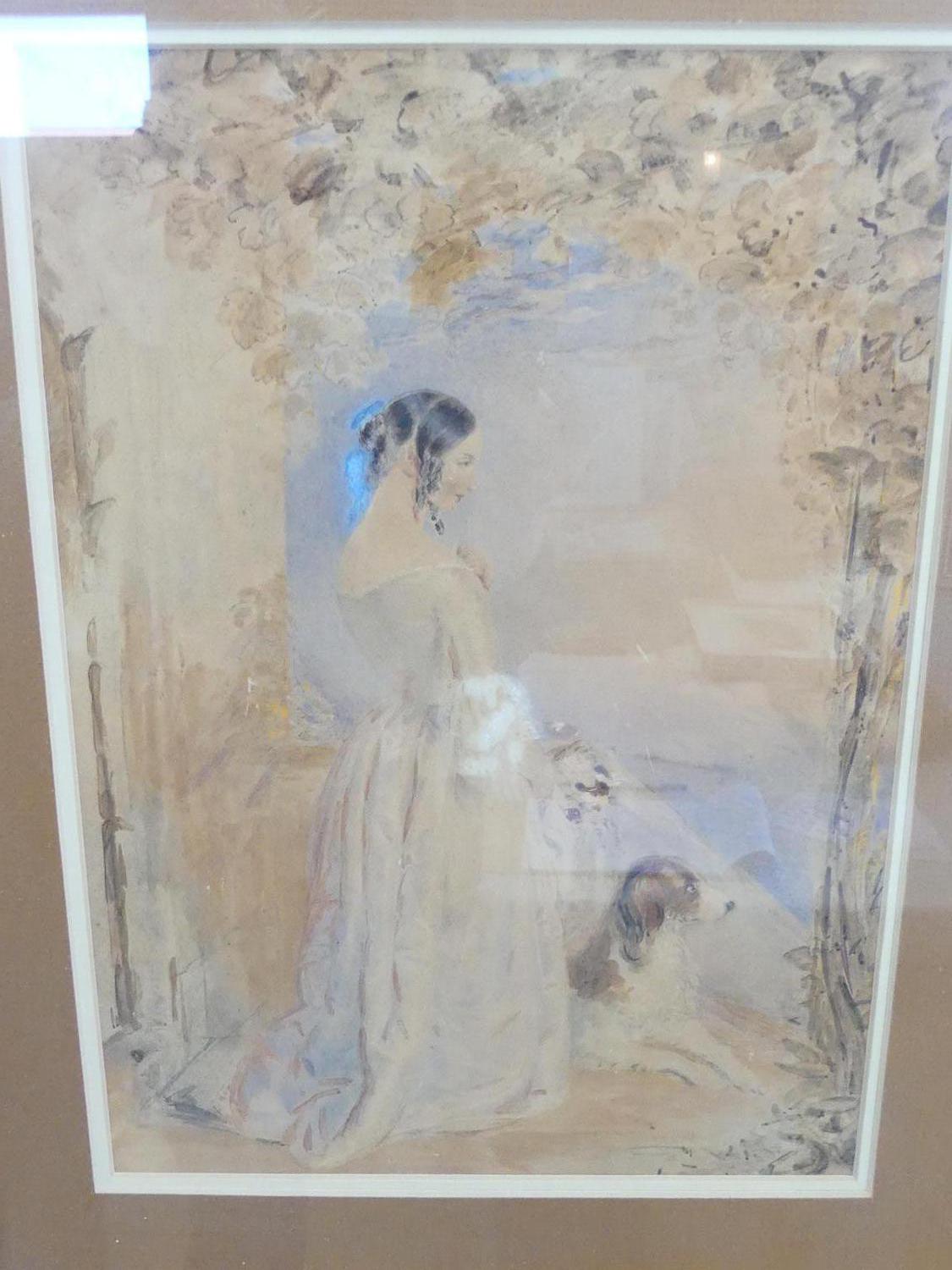 art nouveau period watercolour and gouache, unsigned, 14" x 10", "young lady with blue ribbon and dog"