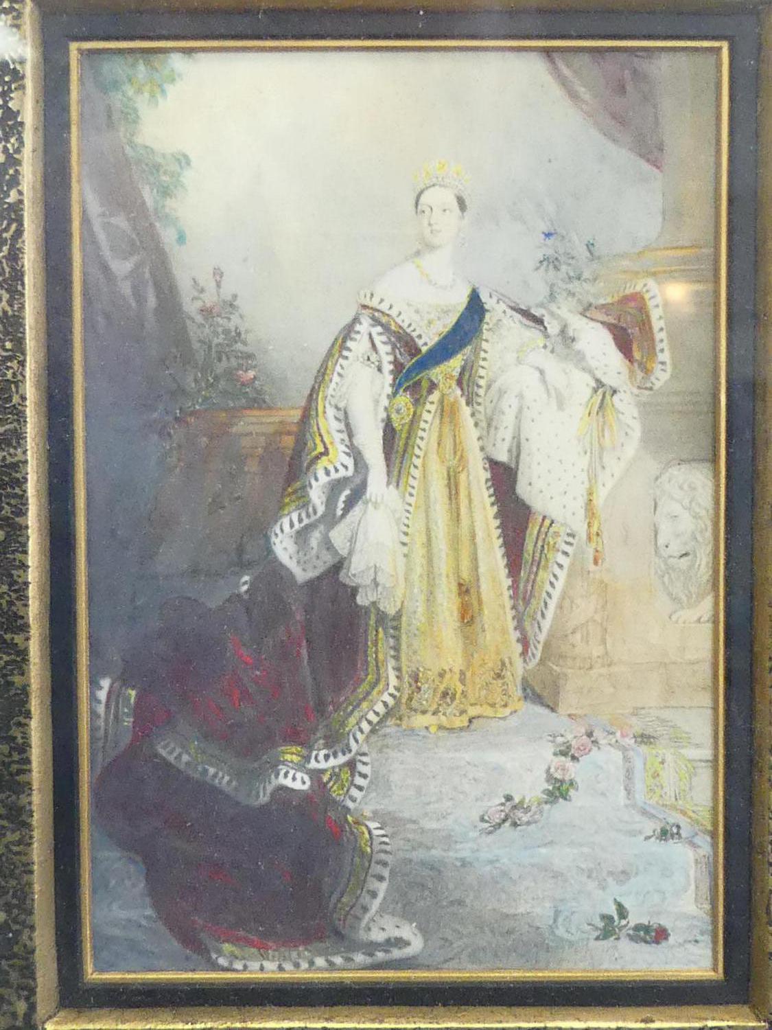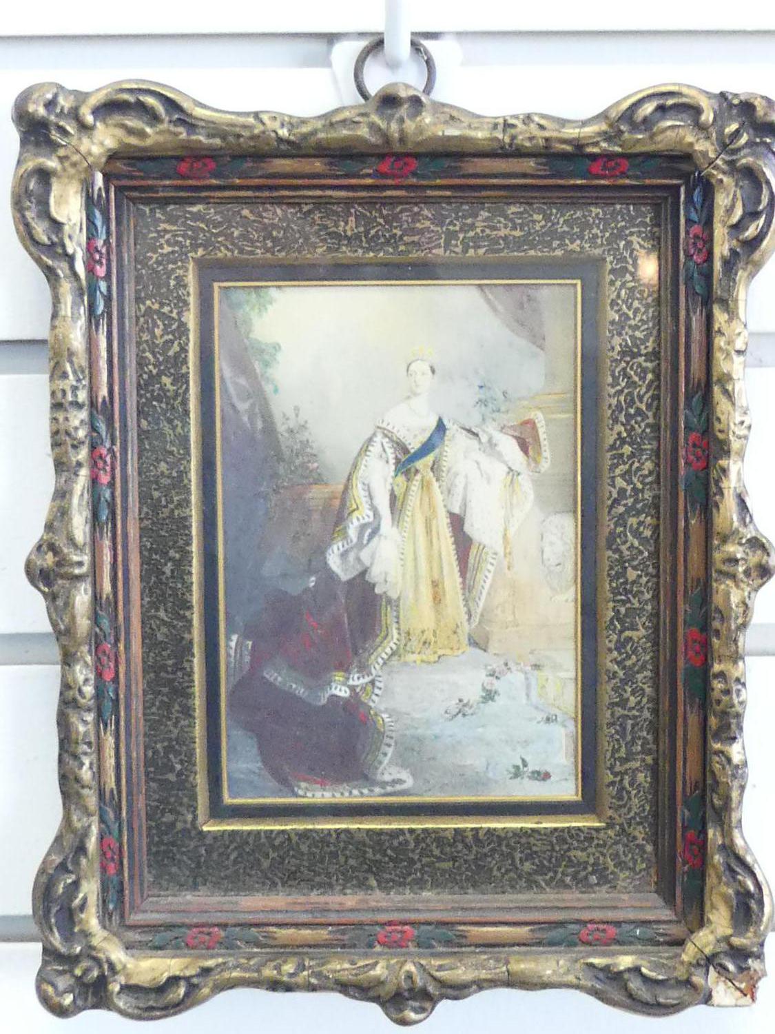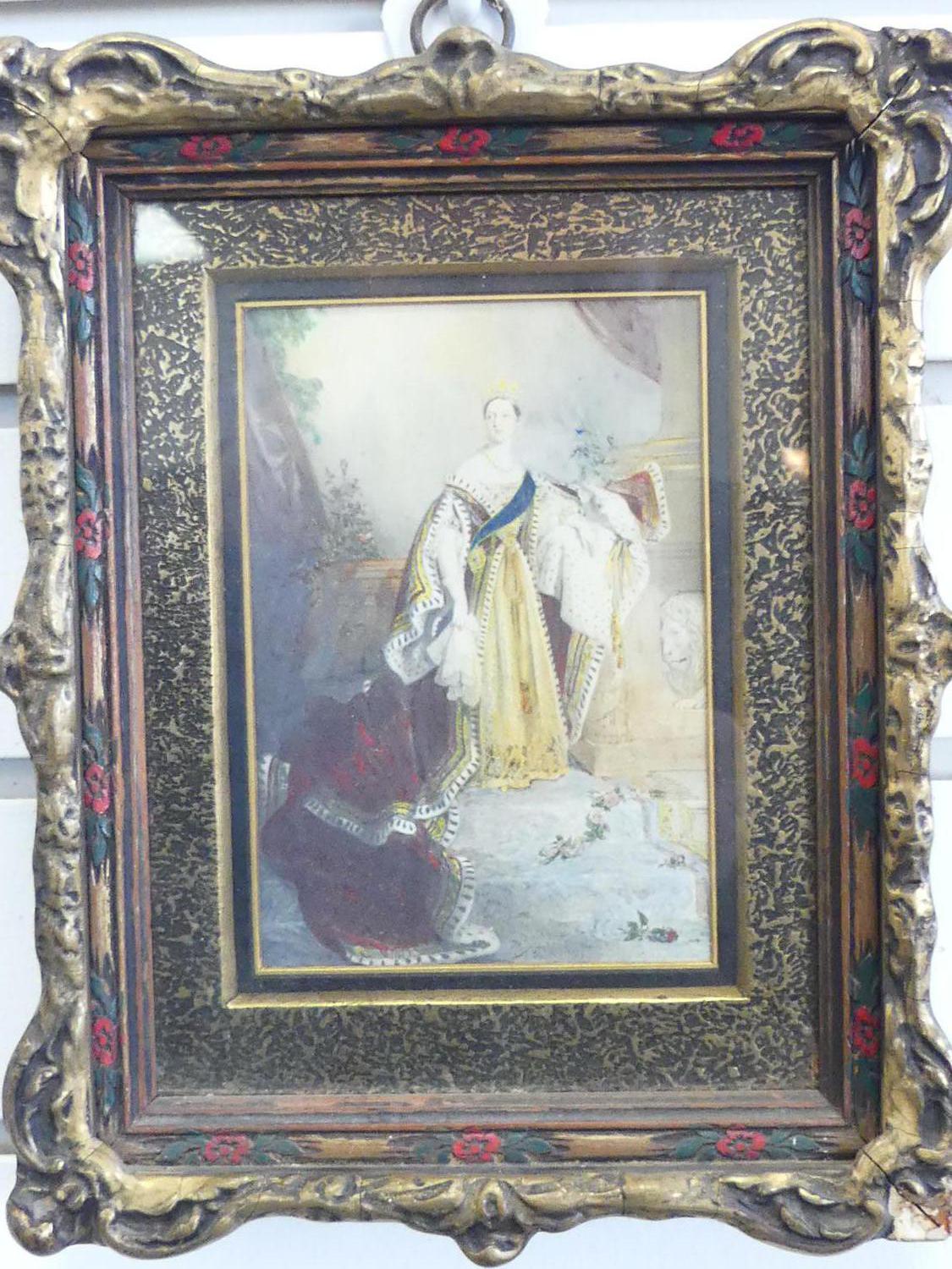19th century gilt framed hand coloured print "queen victoria coronation robes", overall 9" x 7 1/4"