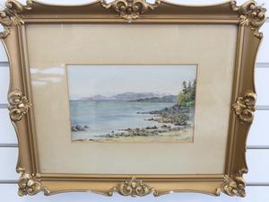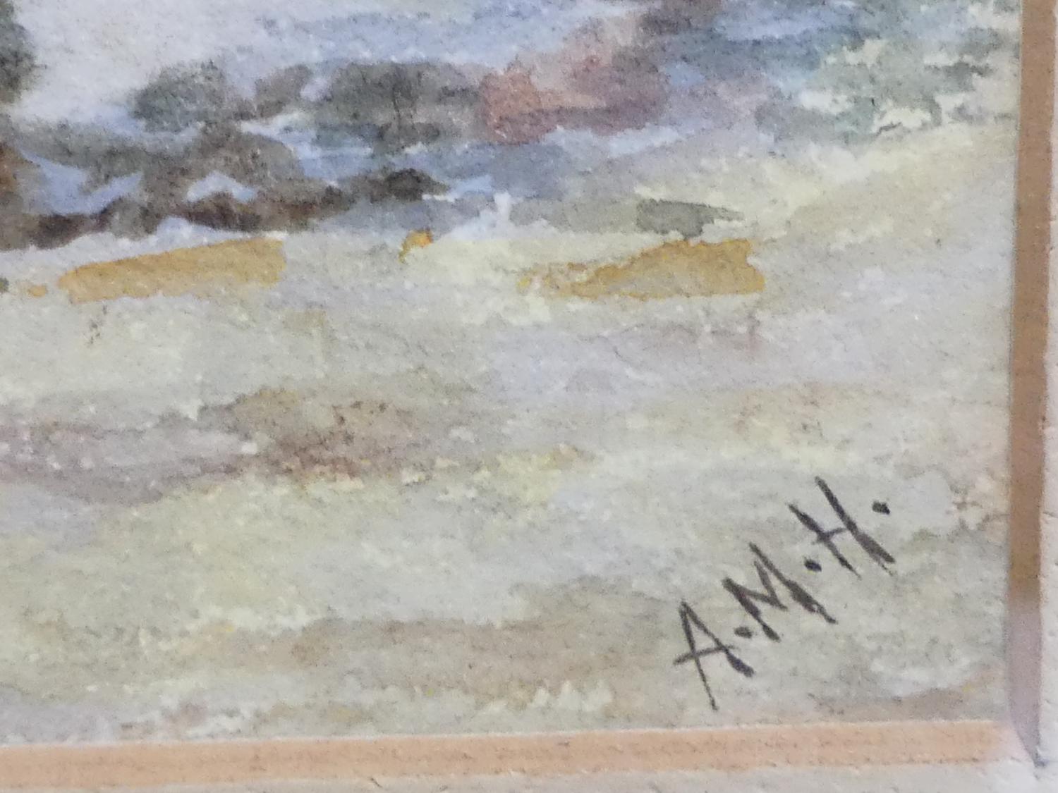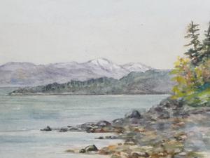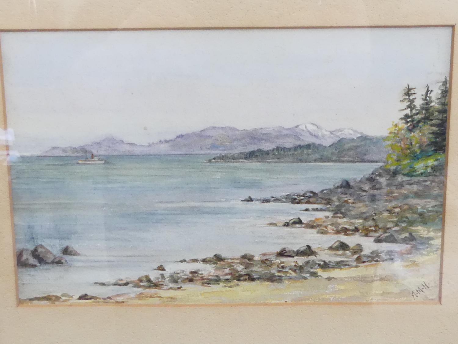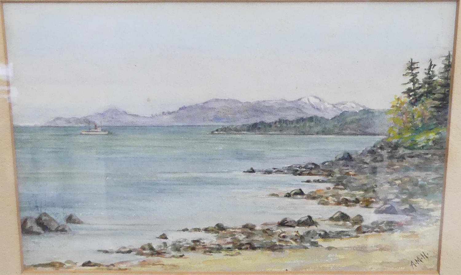 early 20th century watercolour bearing initials a.m.h., 5 1/2" x 8 1/2", "sea scape from vancouver island"
