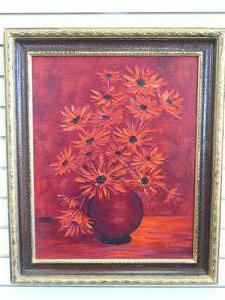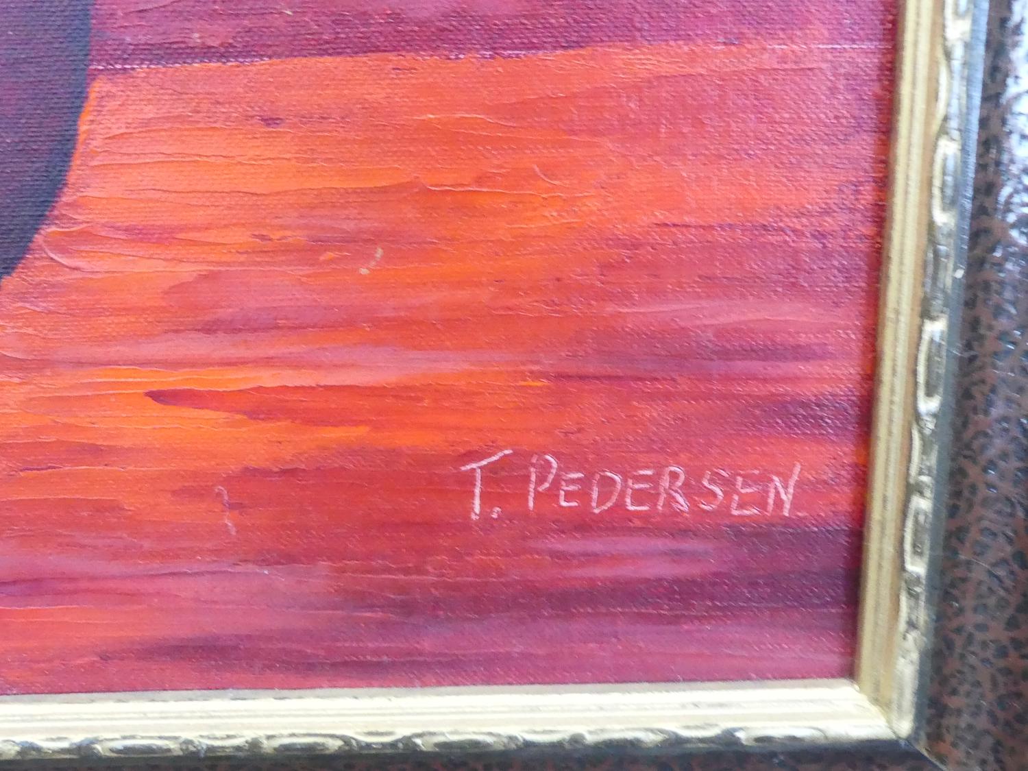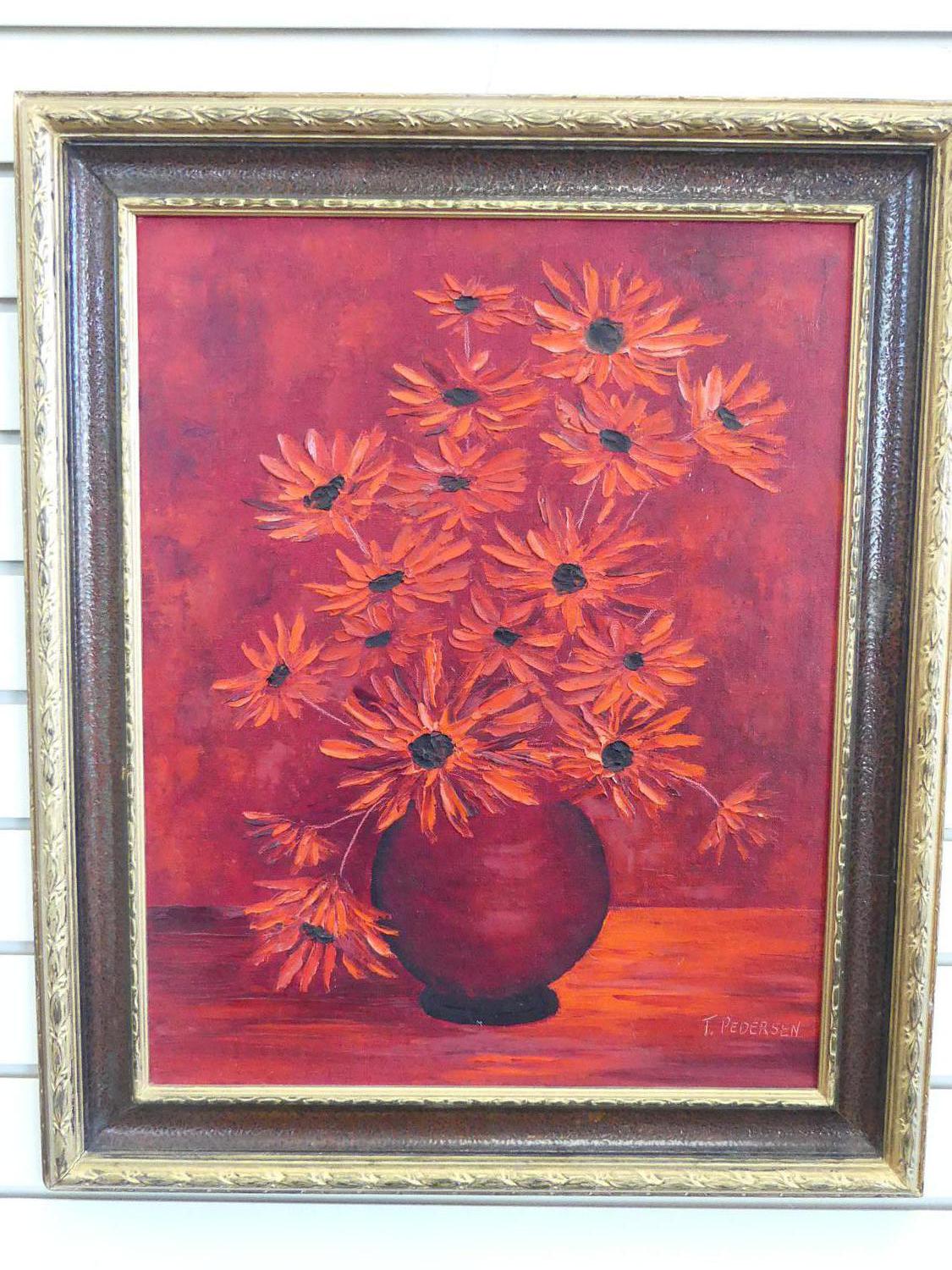 t. pedersen, oil on board, 20" x 16", "stillife in red"