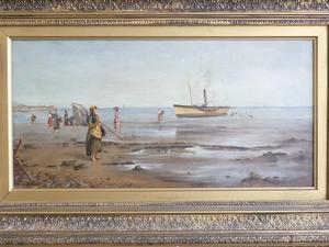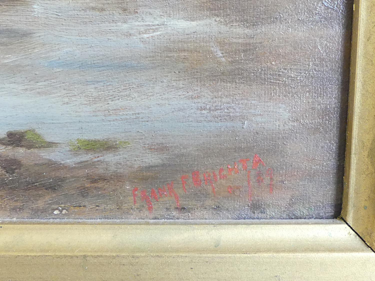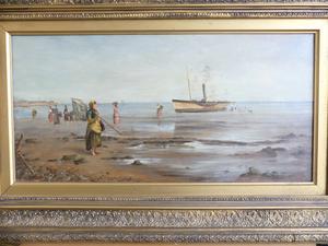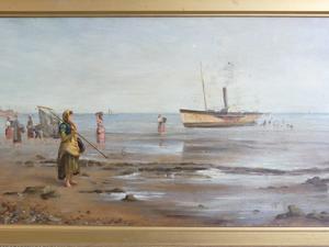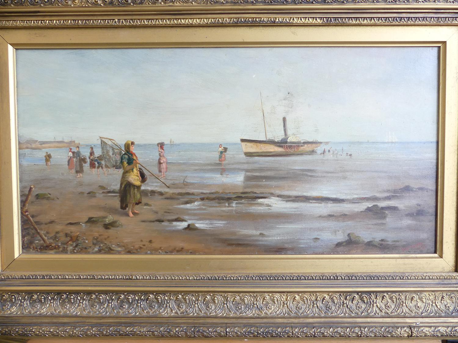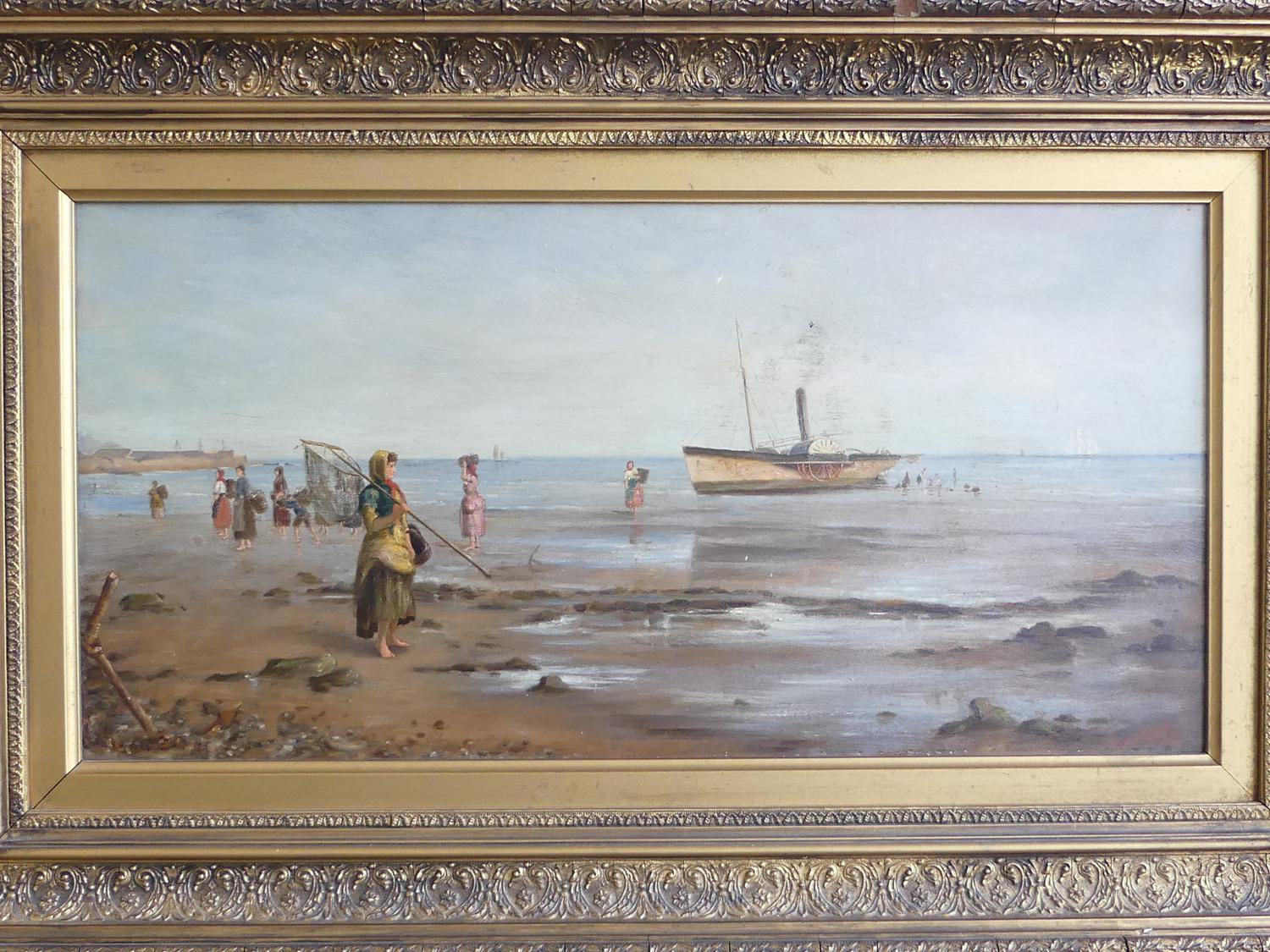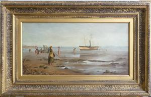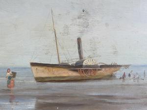 frank f. brichta (act.1888-1898), oil on canvas, 12" x 24", "shore scene with figures and paddle steamer"