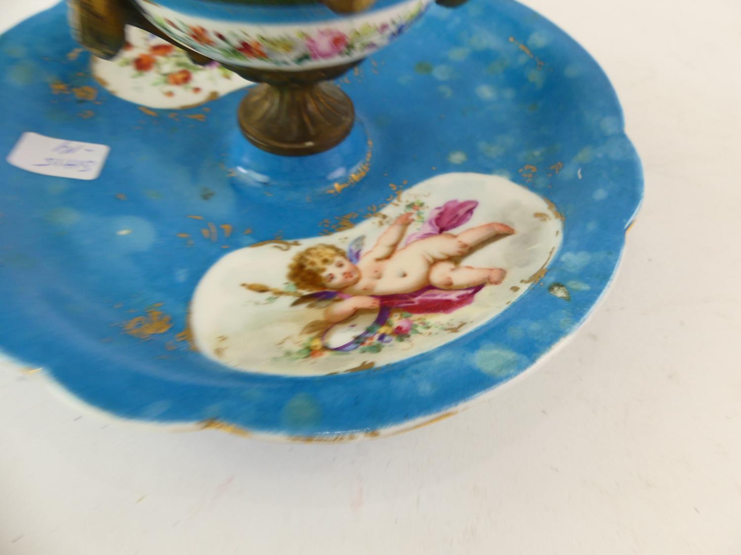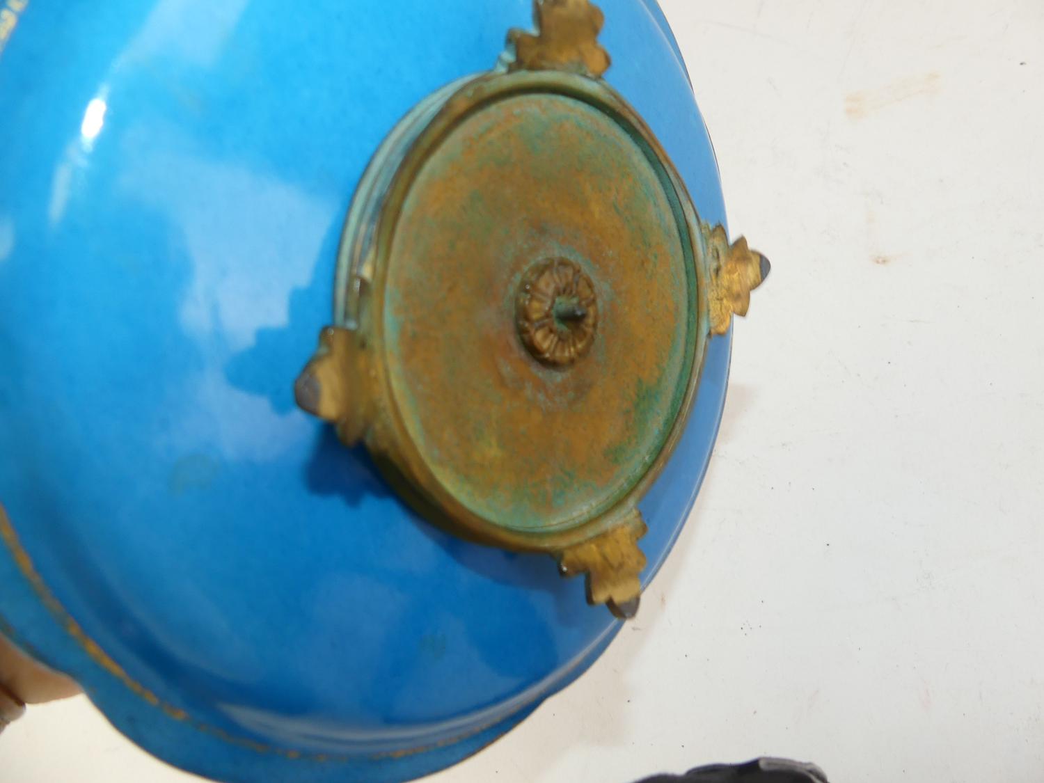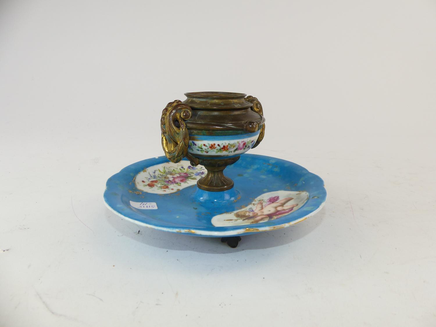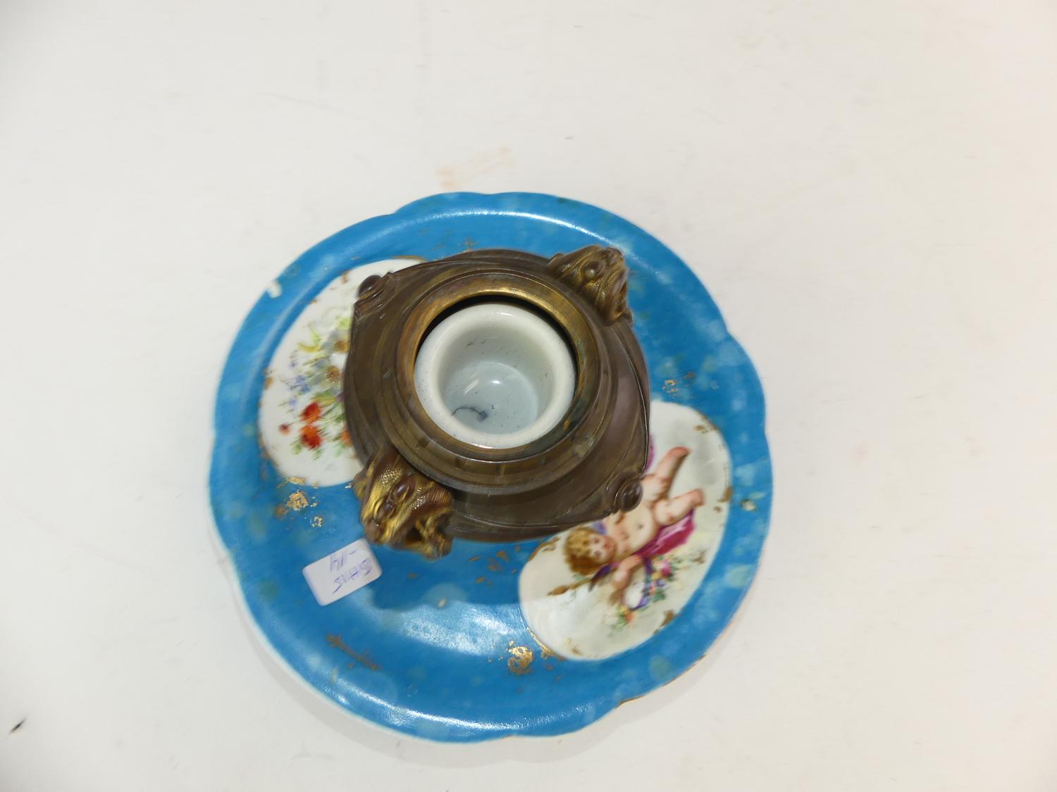 19th century french gilt metal mounted porcelain ink well, 4" x 6 1/2"