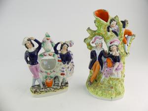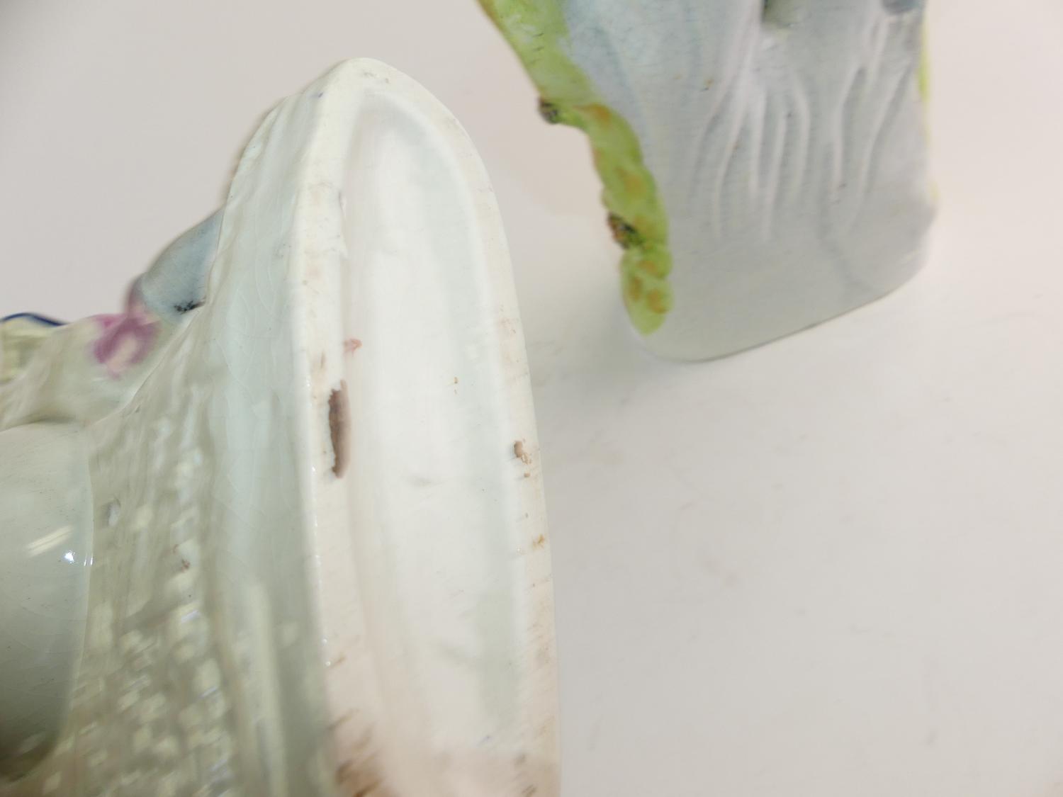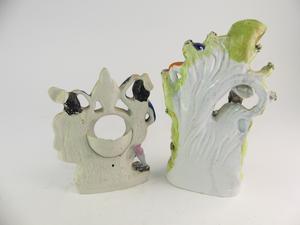 2 staffordshire figural spill vases, chips, ht 12" and smaller