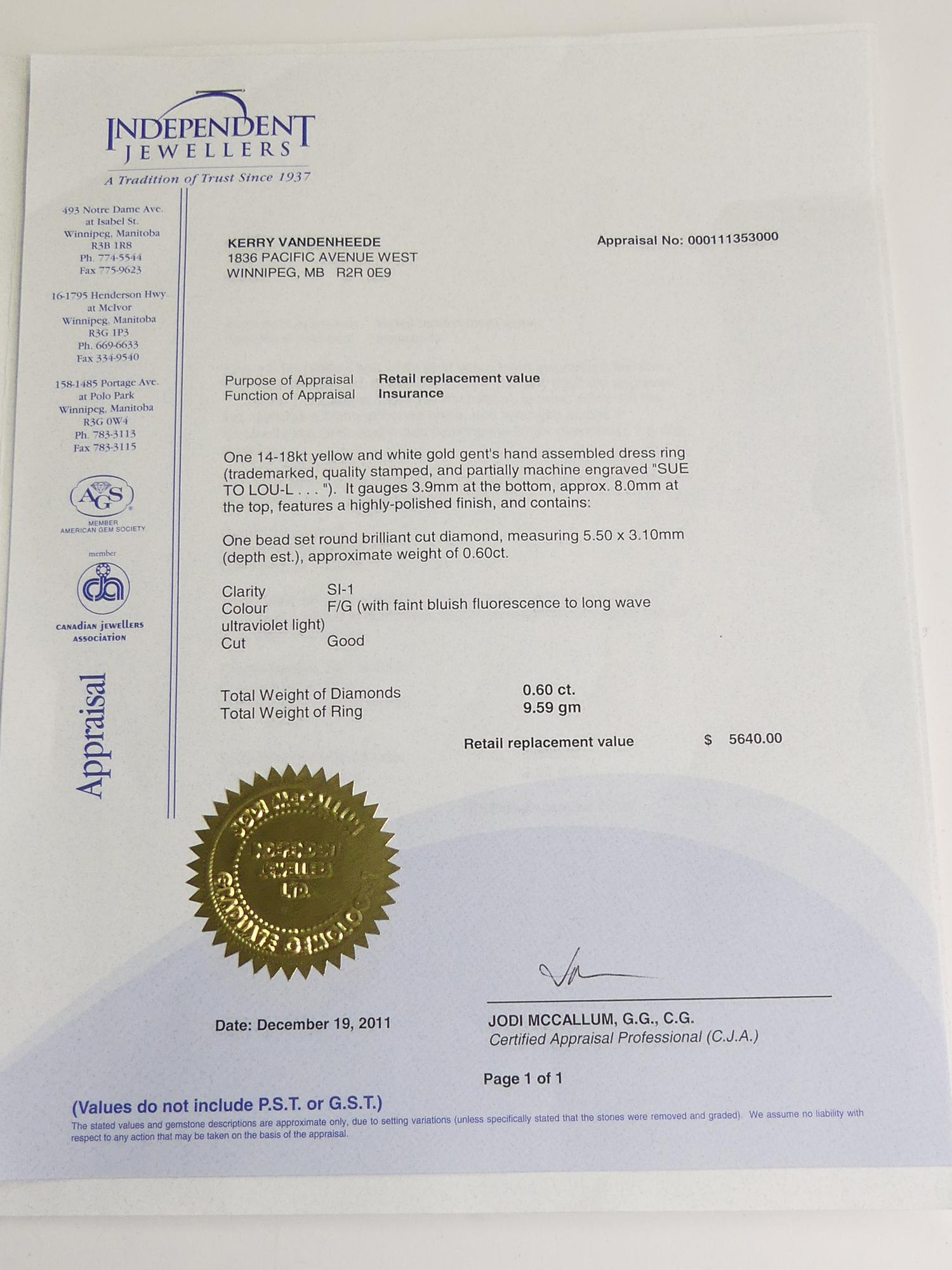 14-18k yellow and white gold diamond ring, .60ct si-1 f/g, 9.59 grams, with appraisal