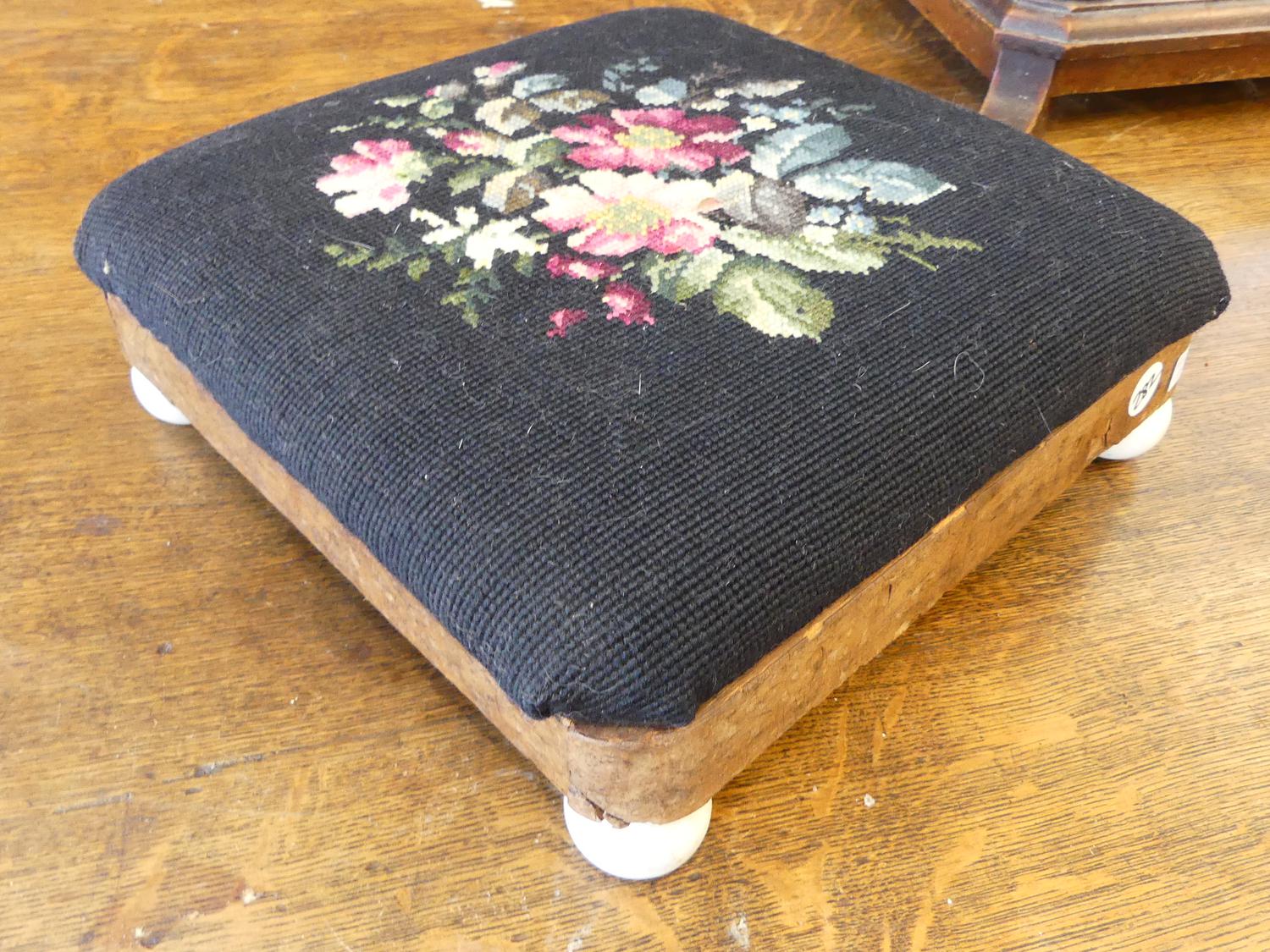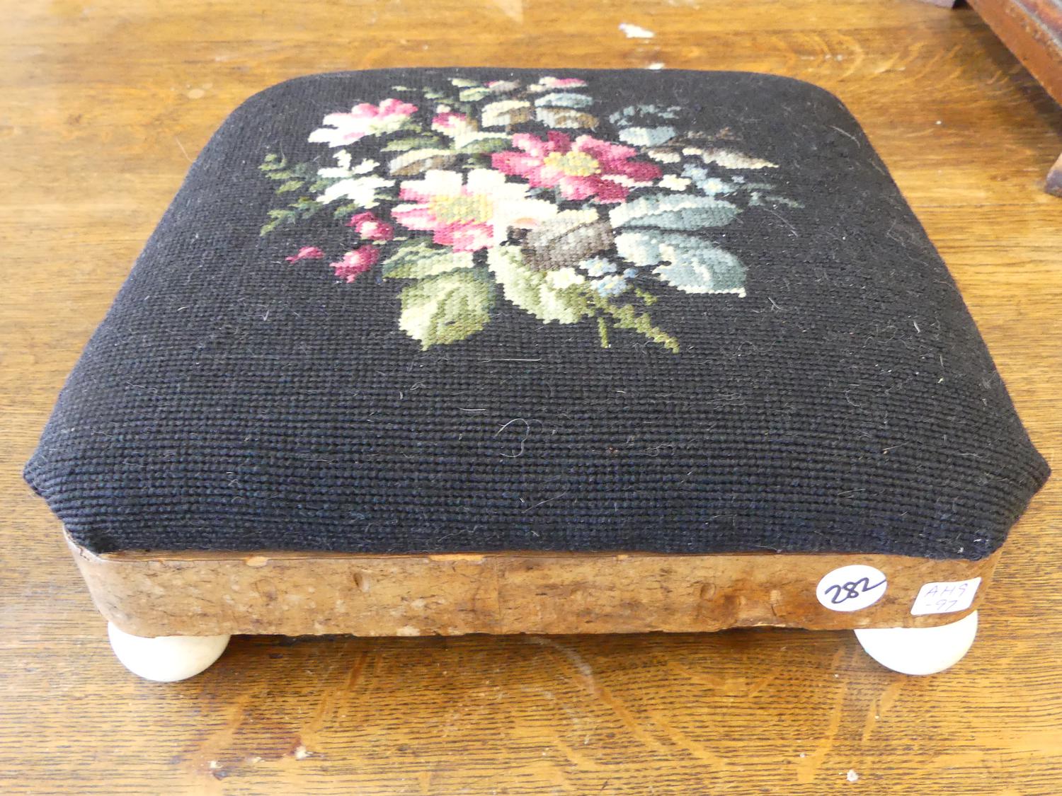 needlepoint upholstered foot stool, 4" x 11" x 11"