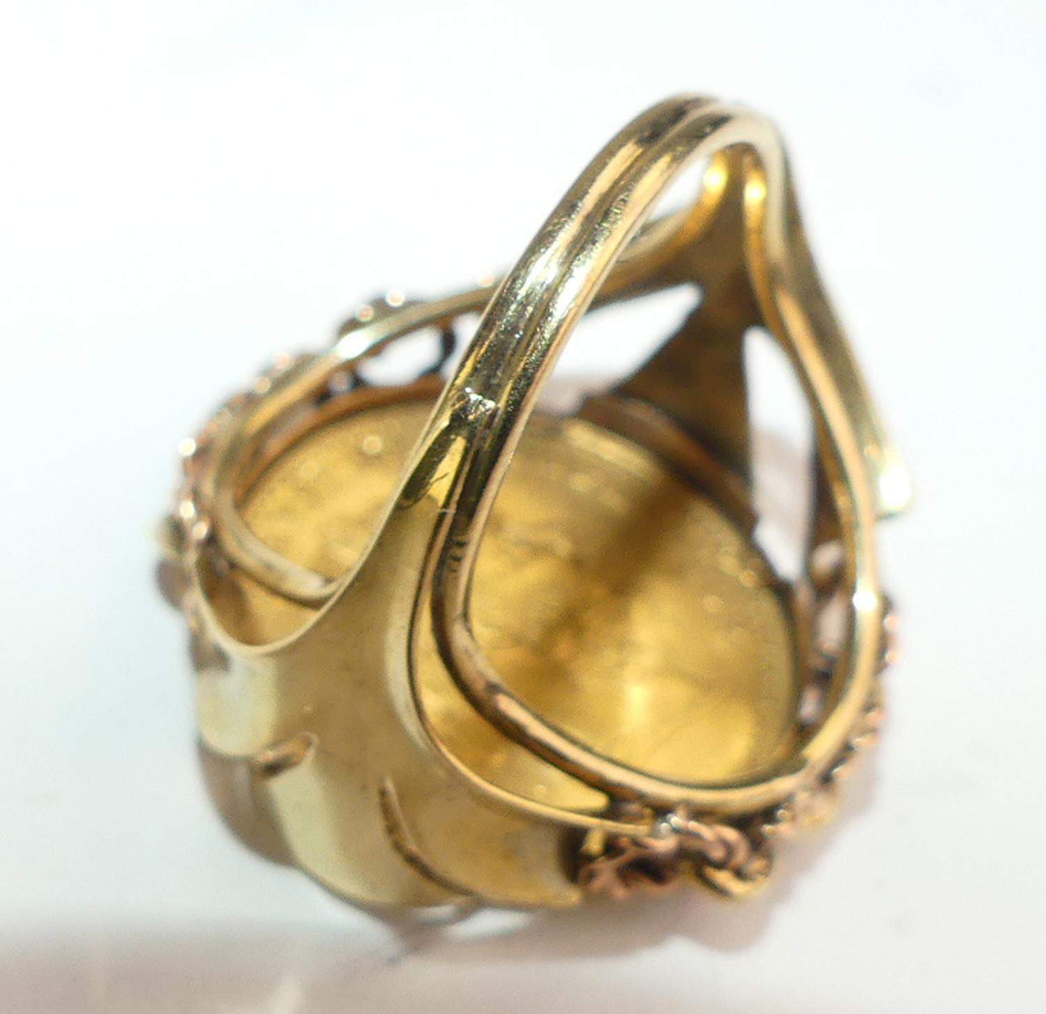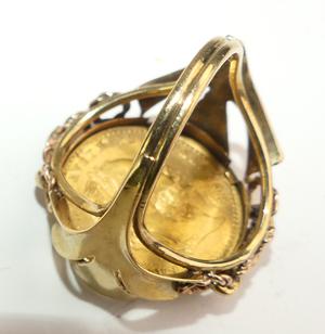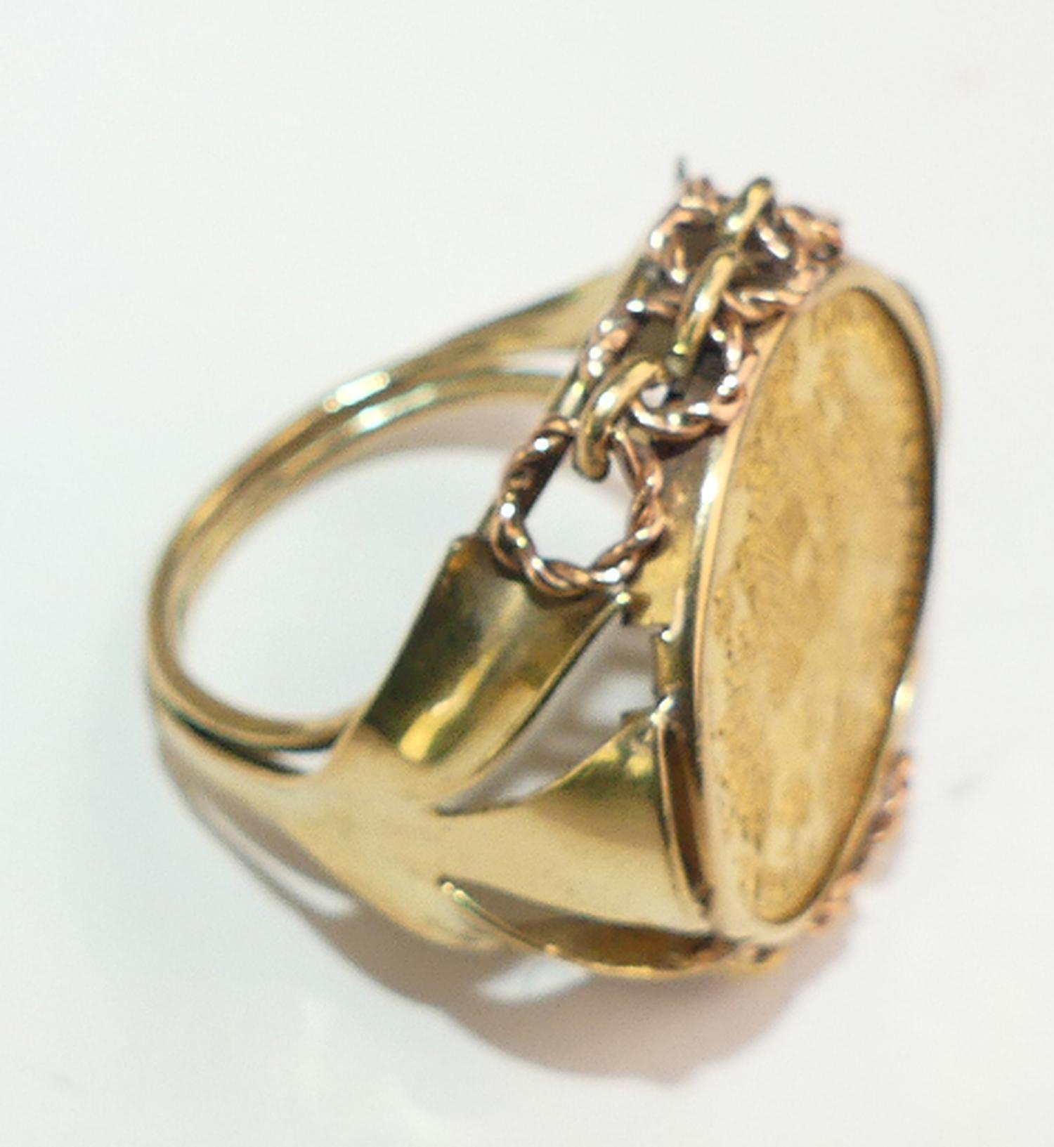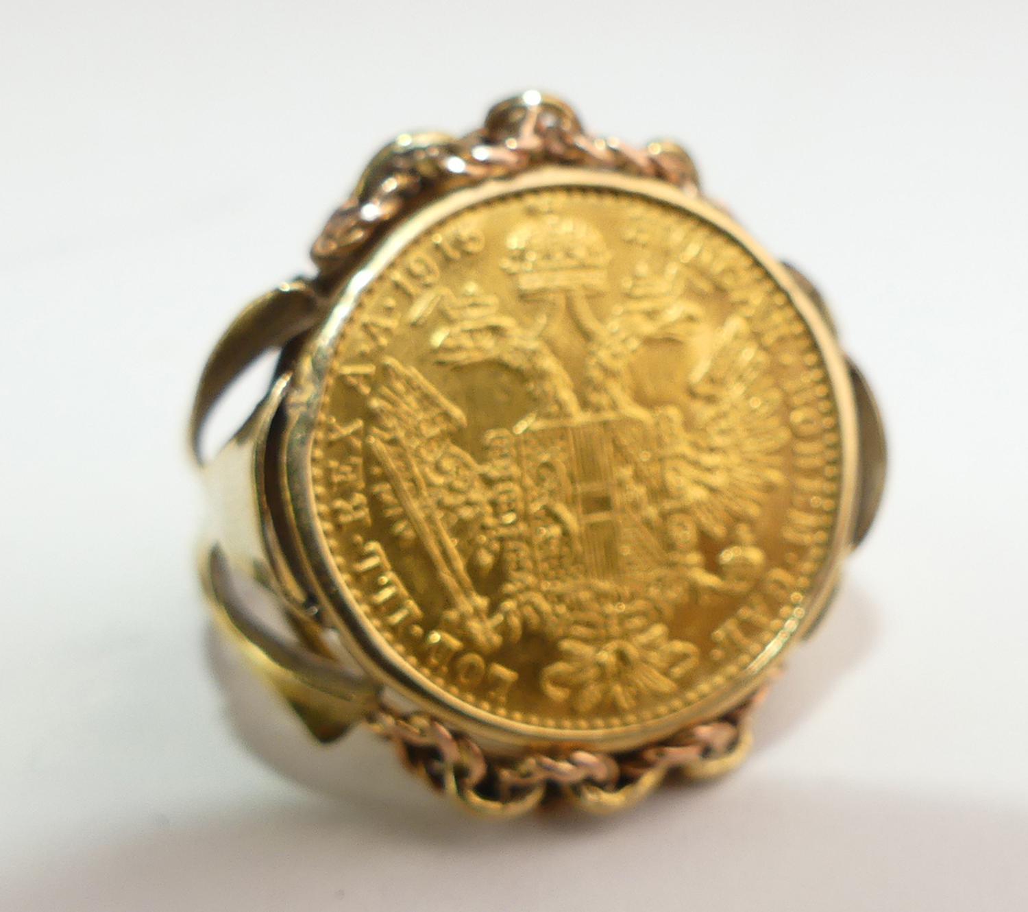 14k yellow gold ring mounted with 1915 austrian ducat, size 7 1/2", 8.5 grams