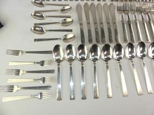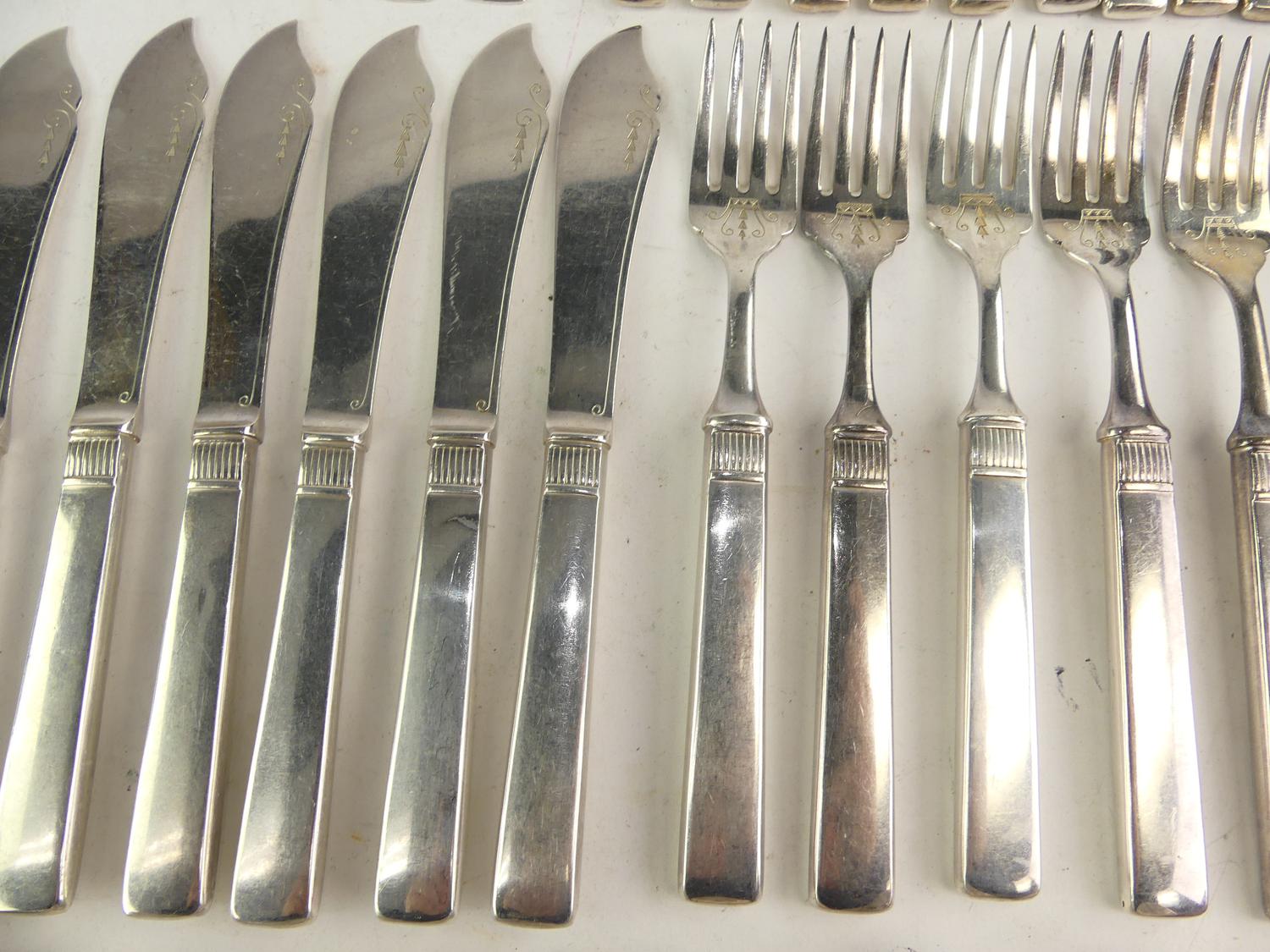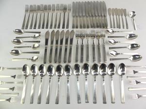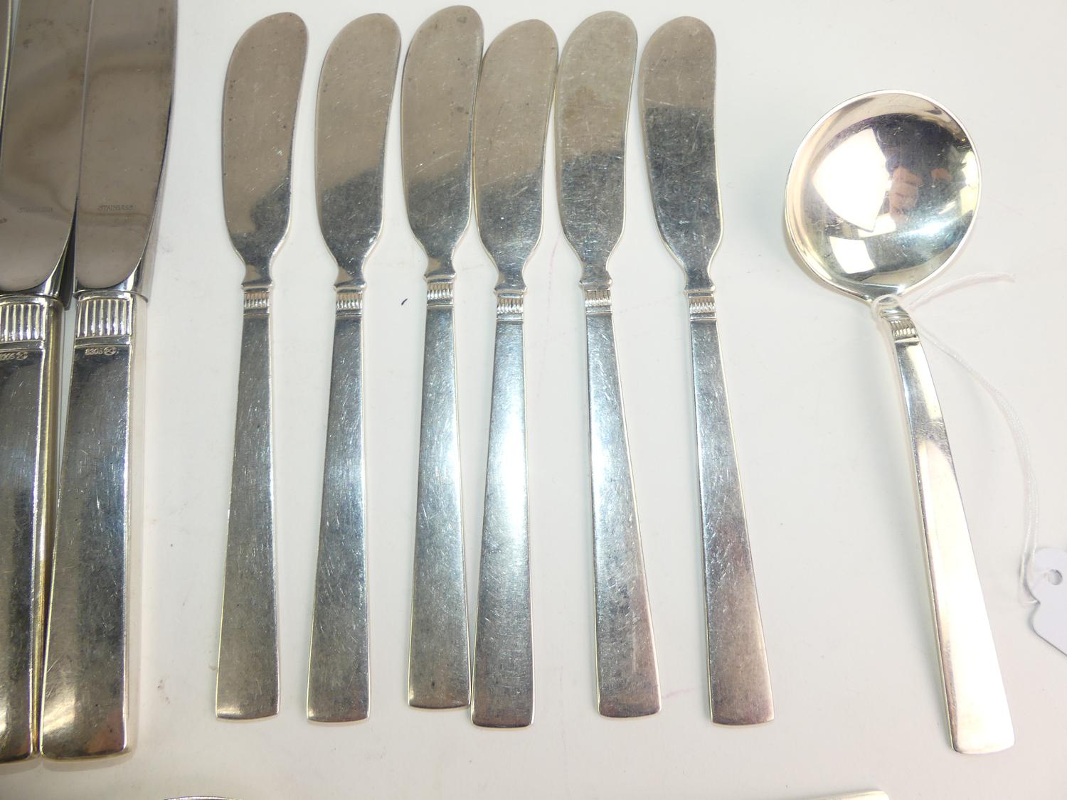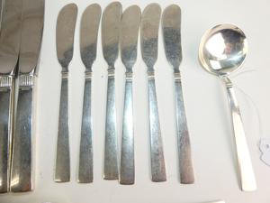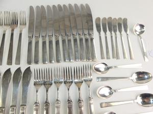 mid century 78 pc set of prince harald pattern 830 silver flatware, norway, 1636, grams of weighable silver, plus 11 dinner knives, 6 fish forks, 6 fish knives, with silver handles