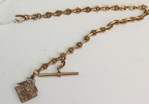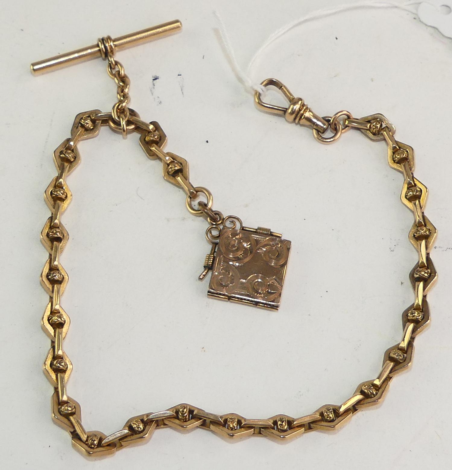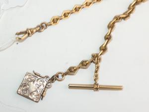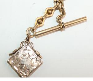 victorian gold filled watch chain with locket fob, vest bar, length 12 1/2"