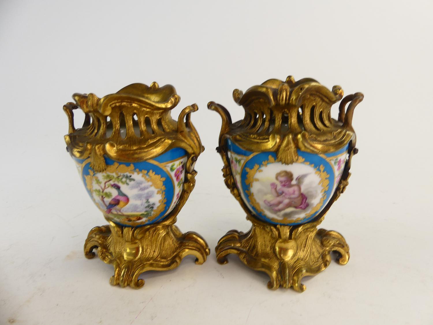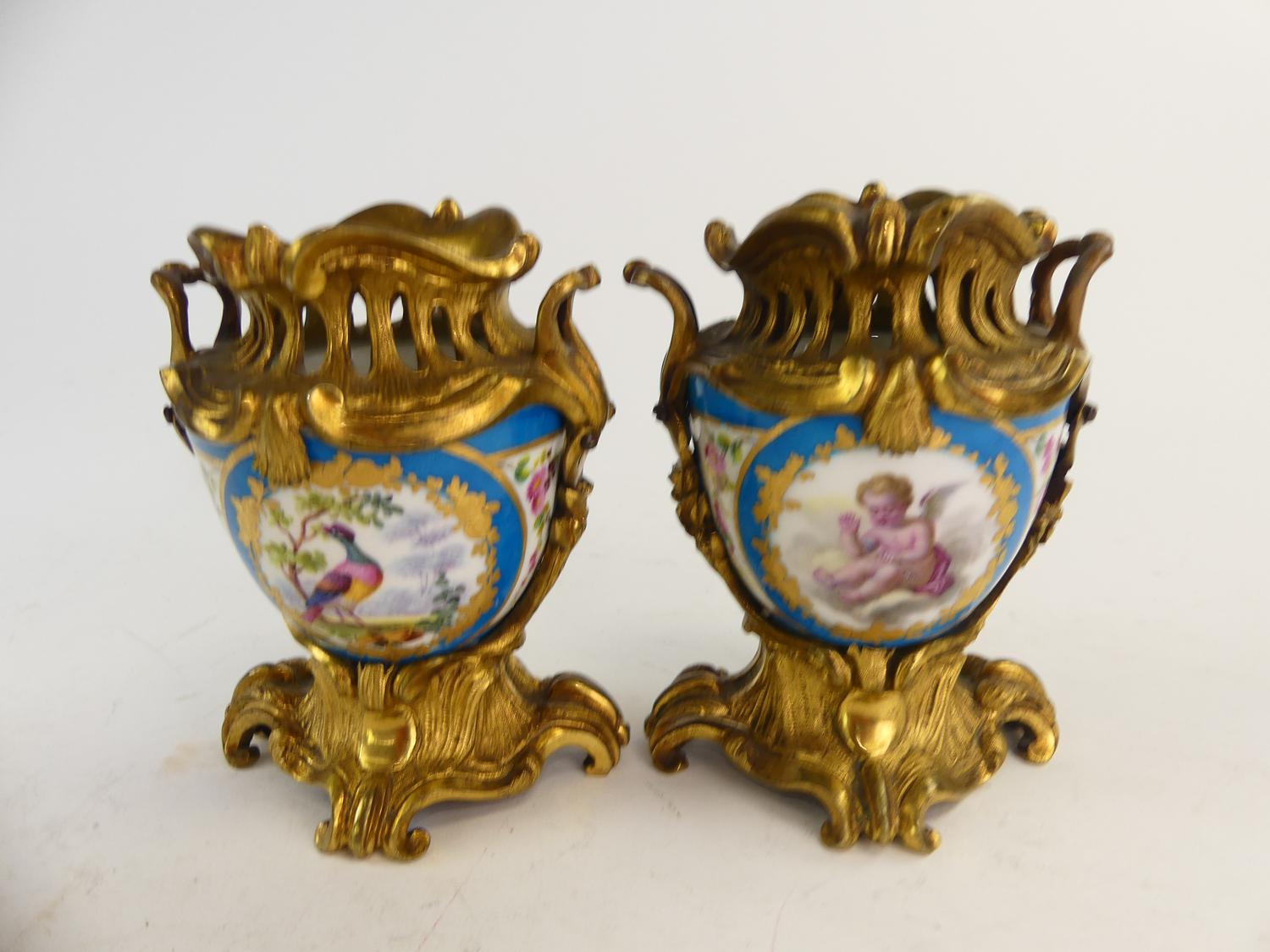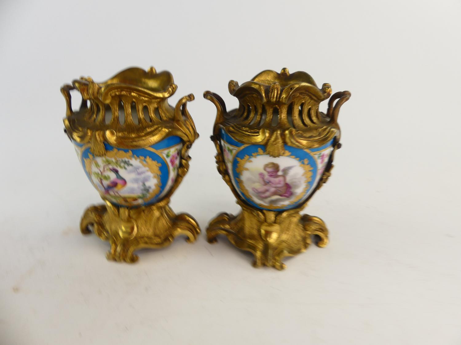 pair of 19th century french sevres style gilt bronze mounted porcelain vases, ht. 4 1/2"