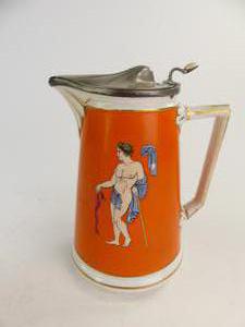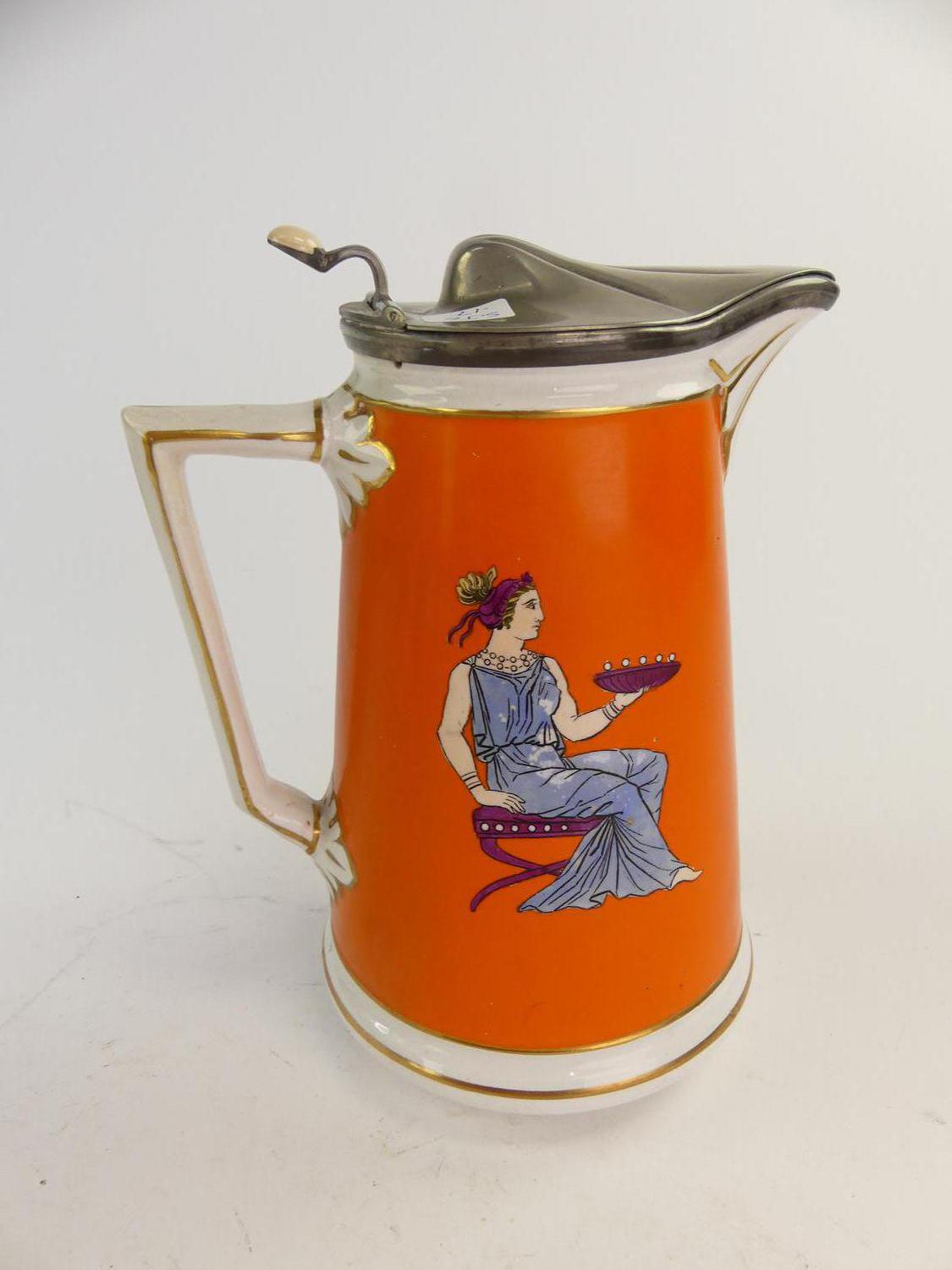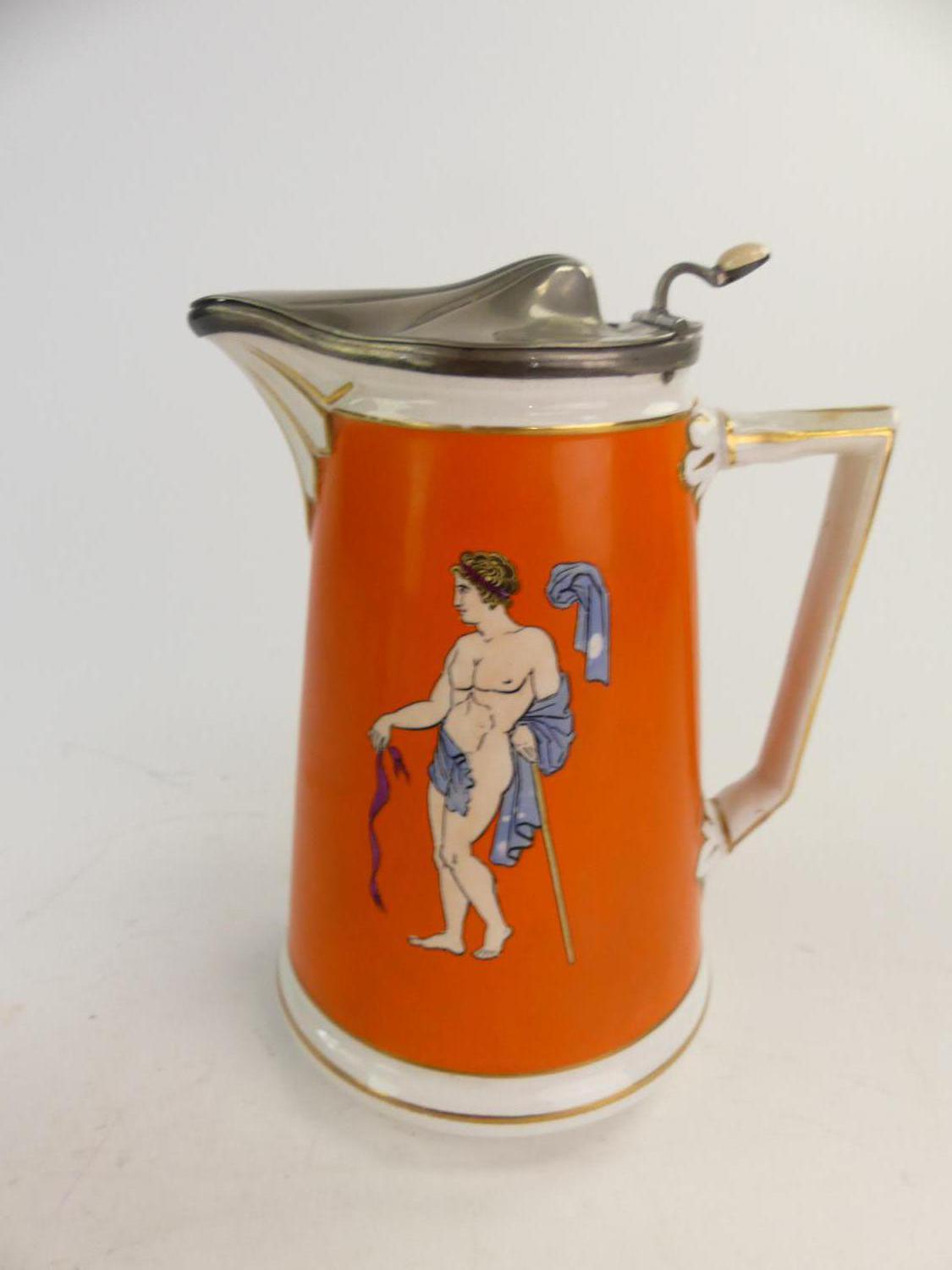etruscan revival porcelain jug with pewter lid, english circa 1850, ht. 9"