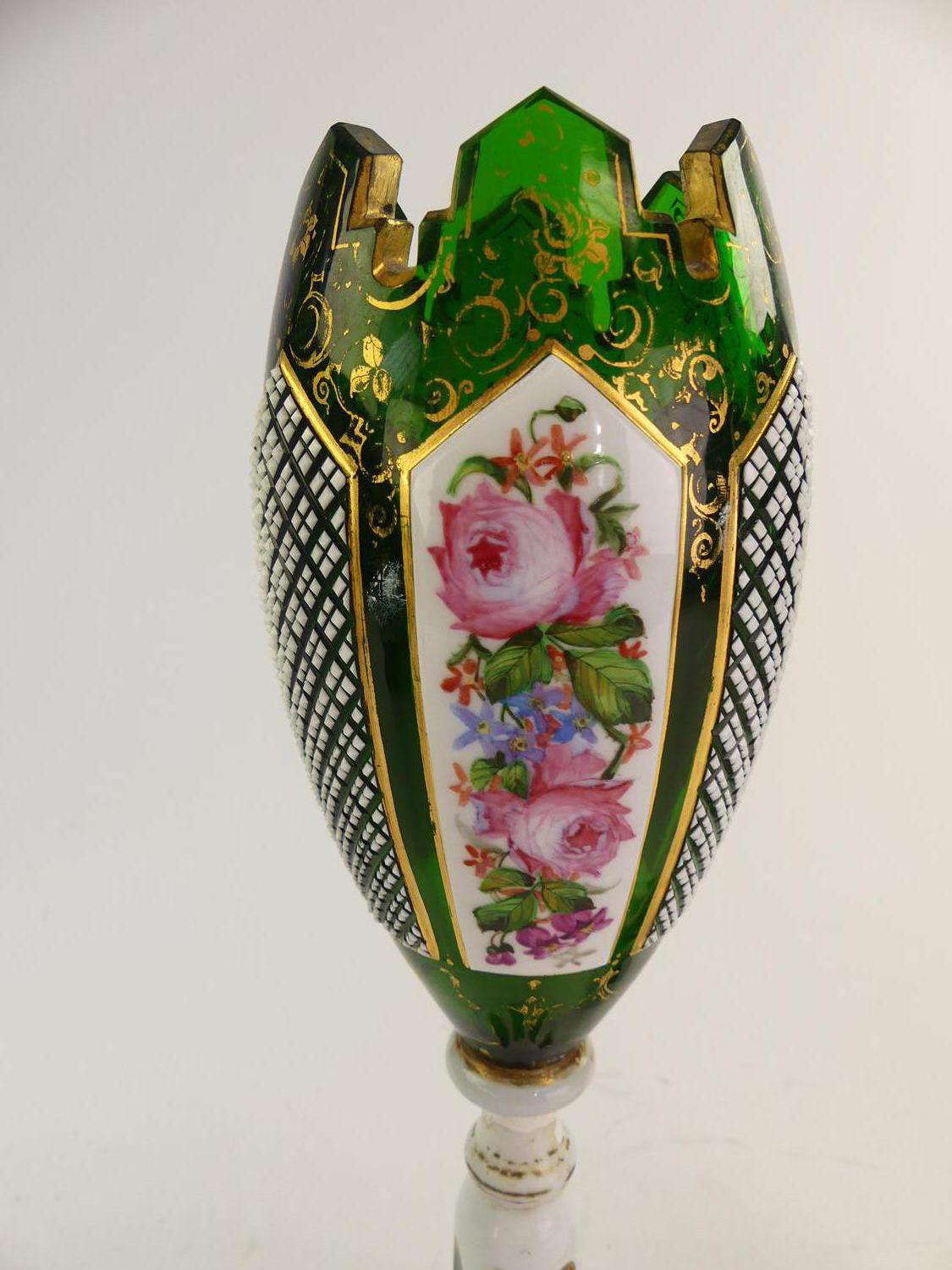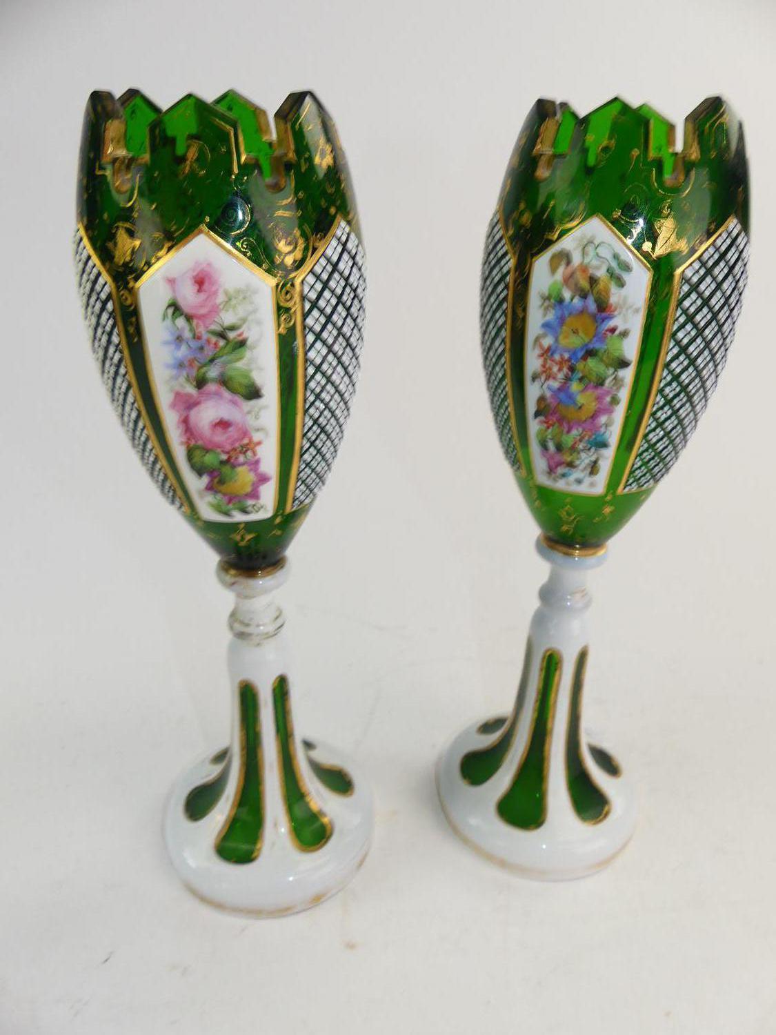 pair of bohemian enameled green glass vases, ht. 11 1/2", one repaired
