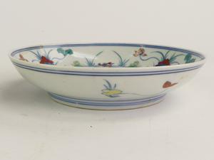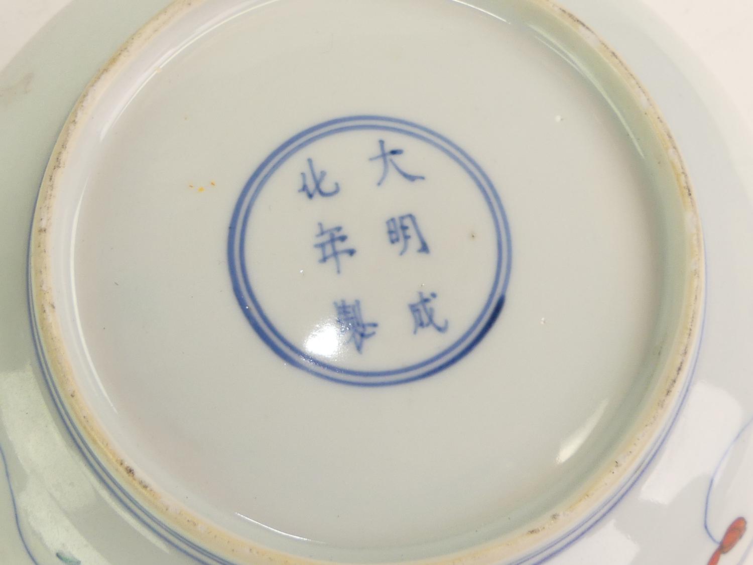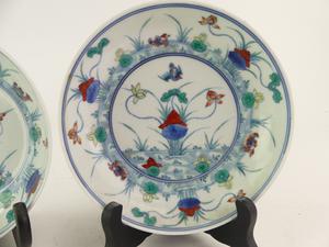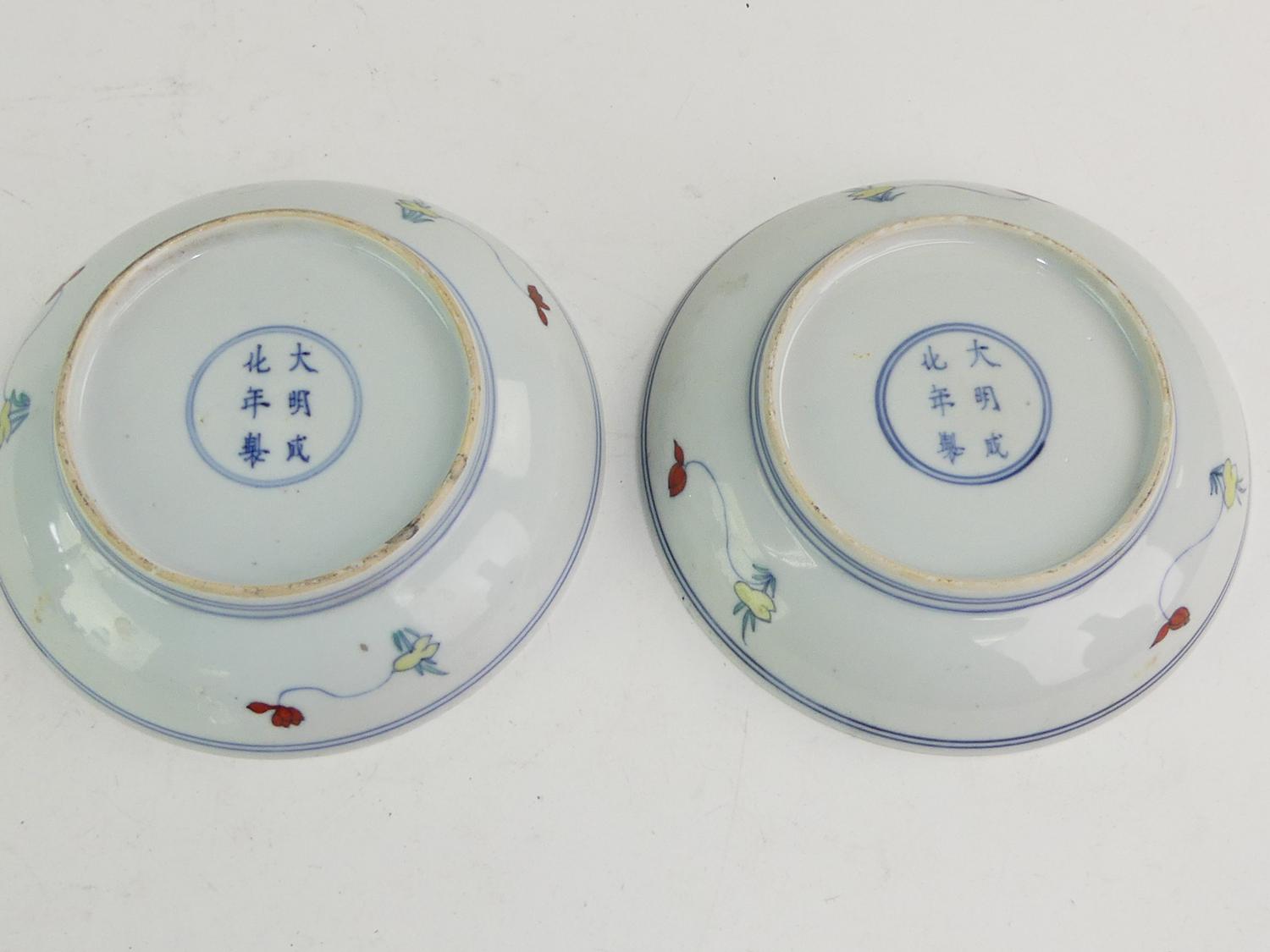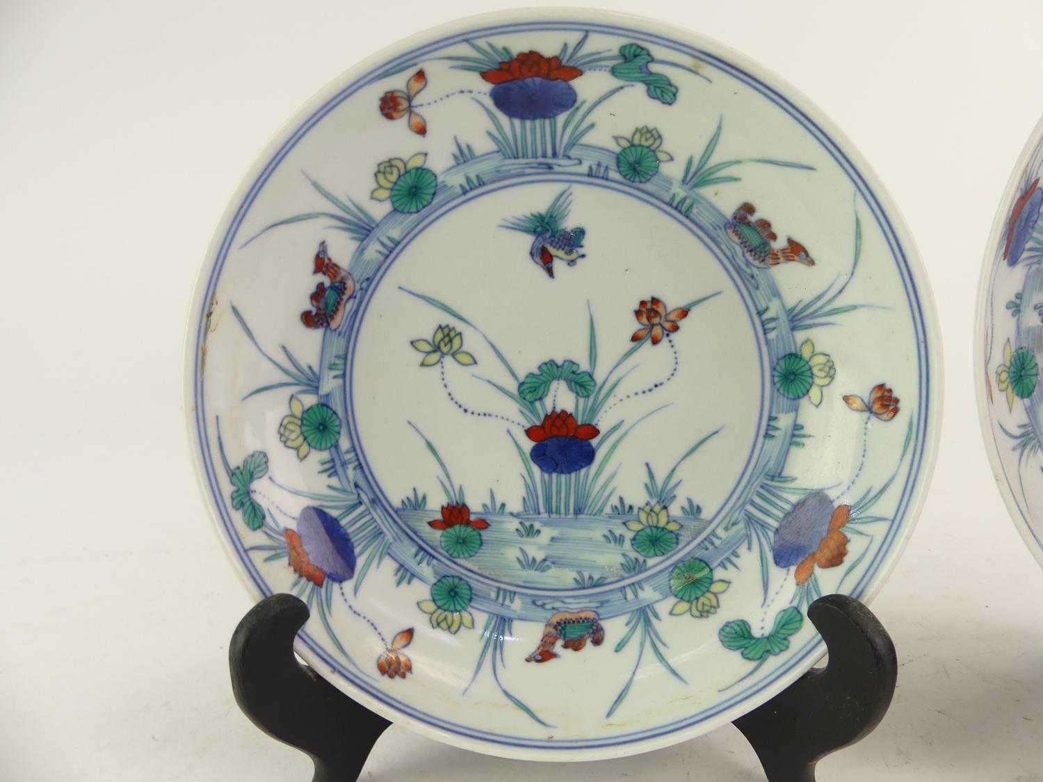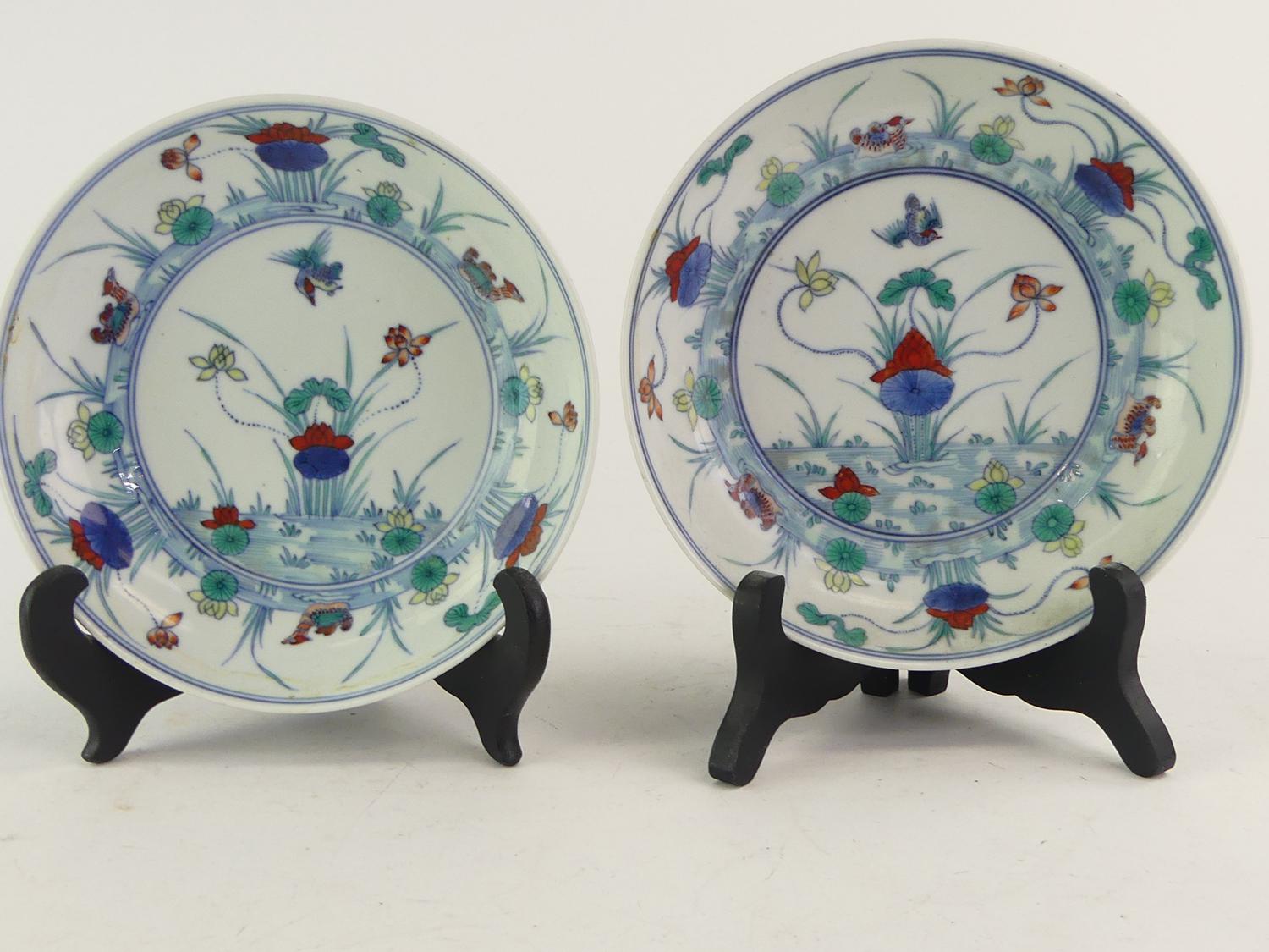 pair of chinese duck and lotus dishes, 6 character mark, diameter 6 1/4"