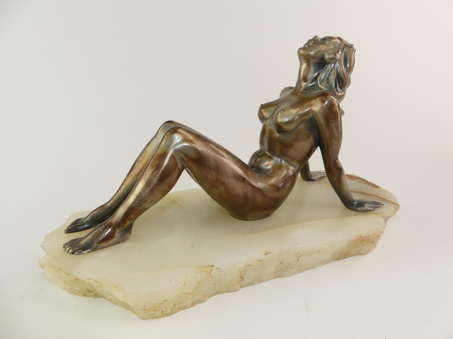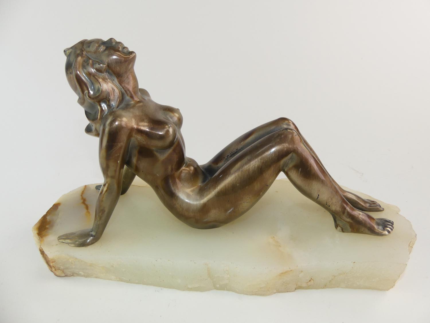 mid 20th century sculpture of a reclining nude woman on a marble base, length 11 1/2"