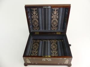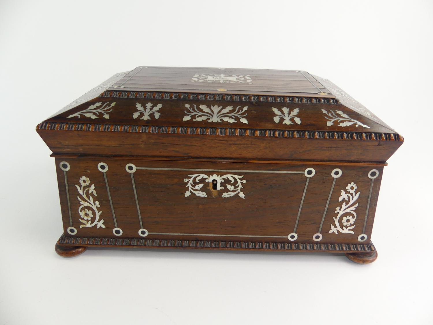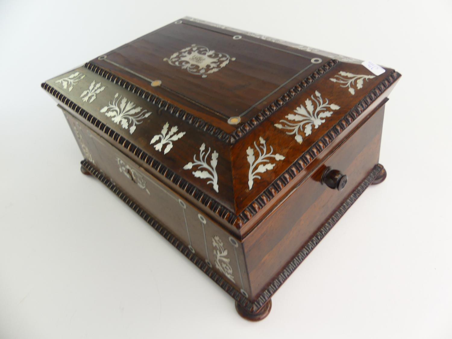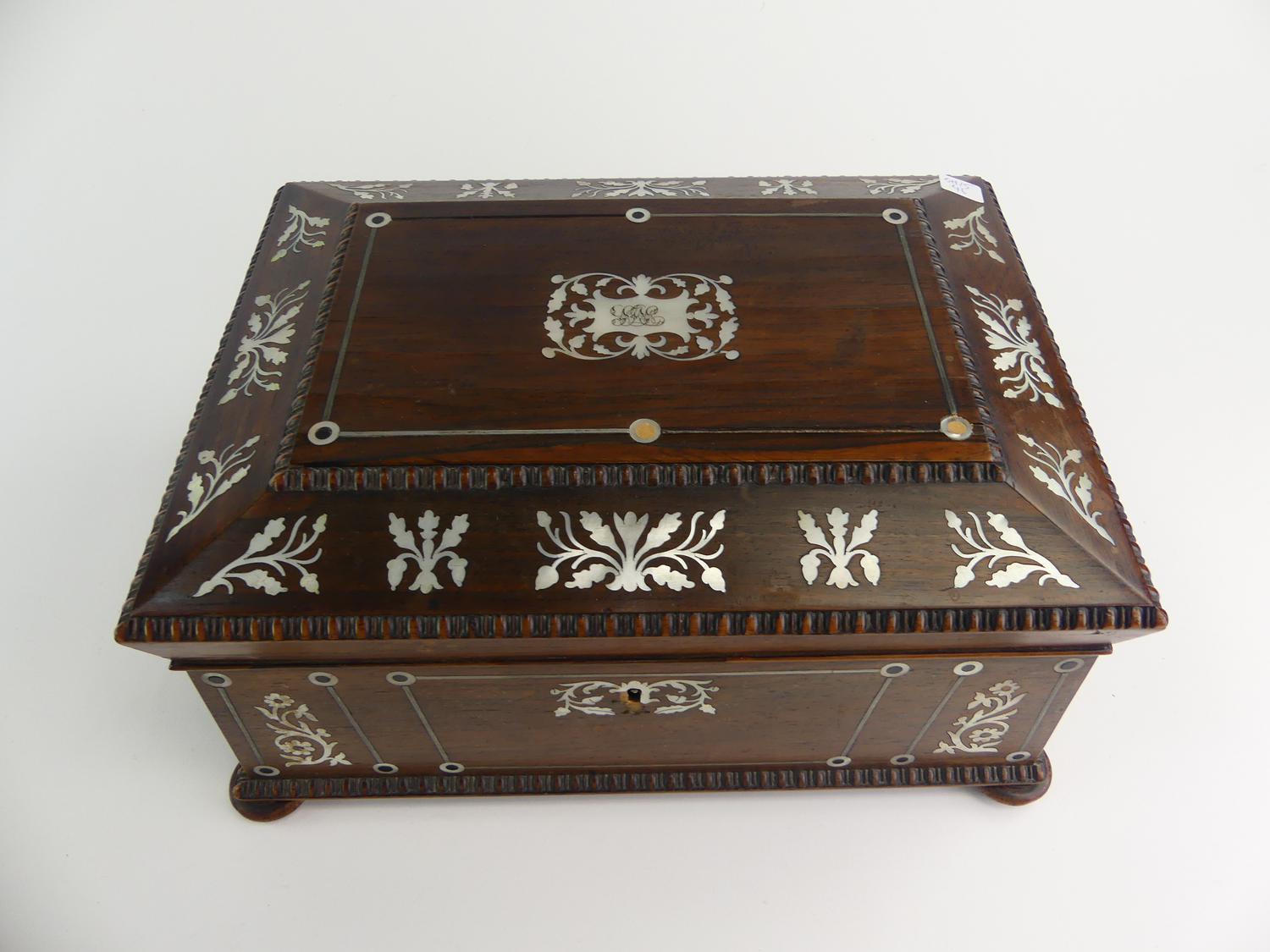 19th century mother of pearl inlaid rosewood box, 6 1/2" x 13" x 9"