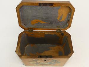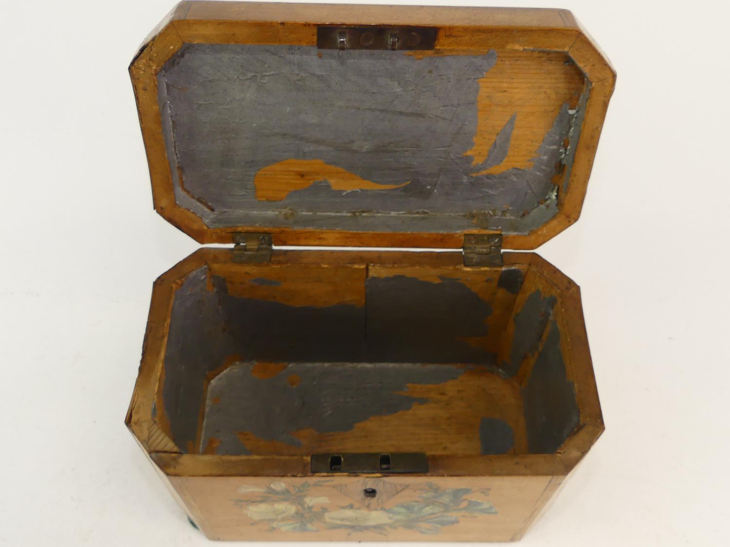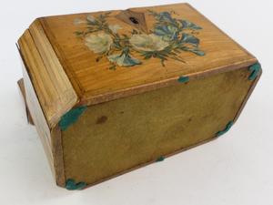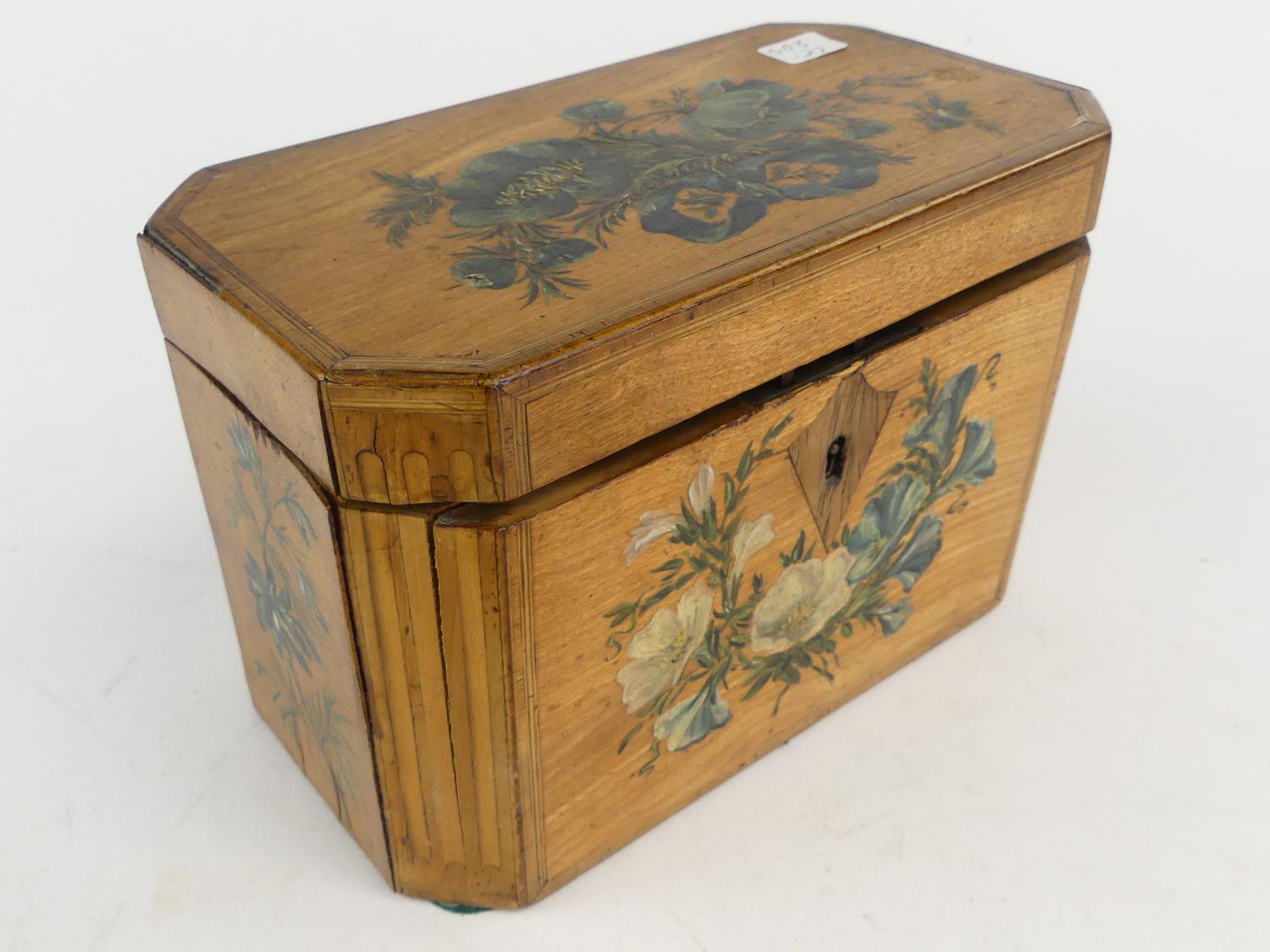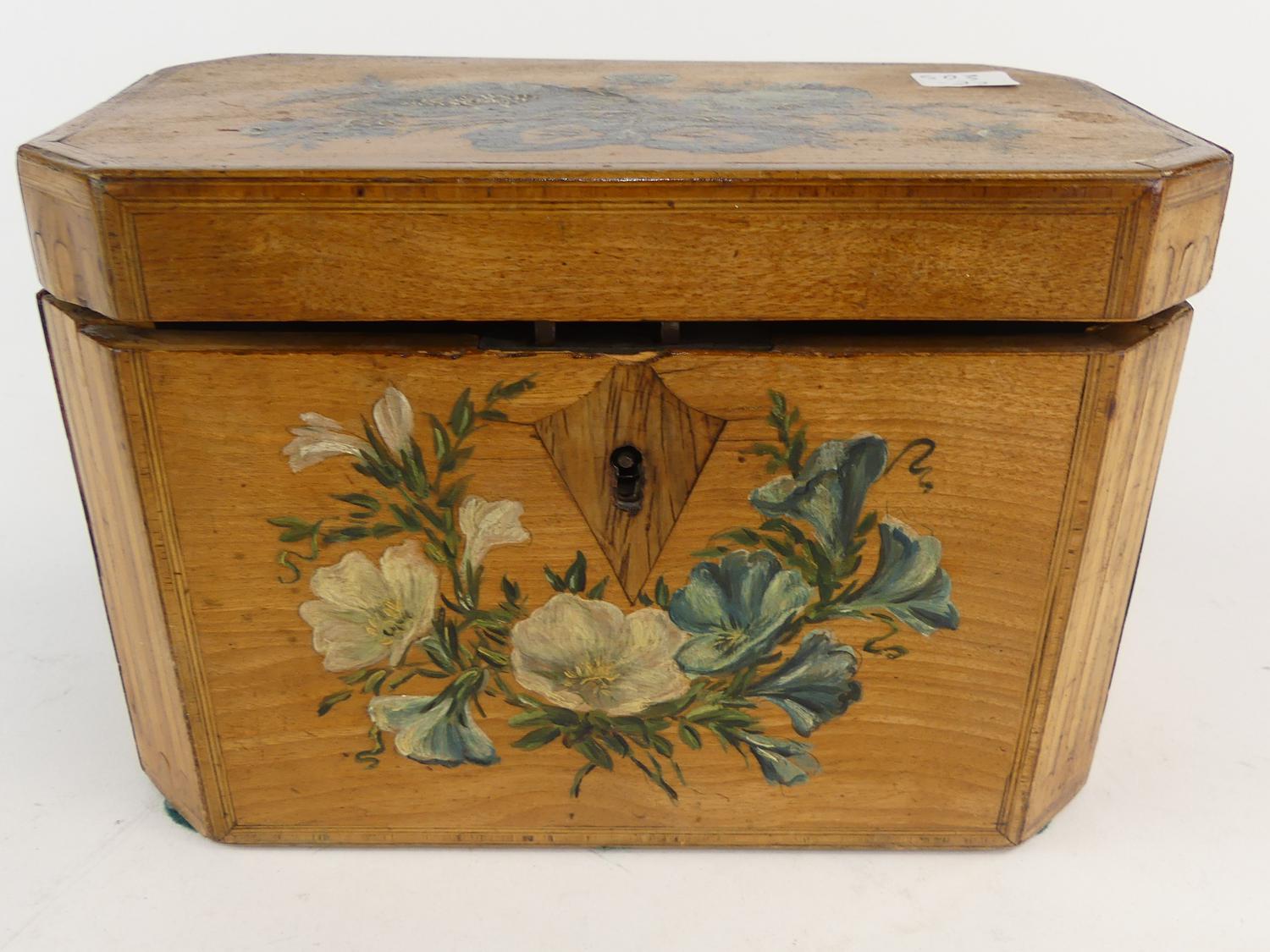19th century painted satinwood tea caddy, 5" x 7 1/2" x 4
